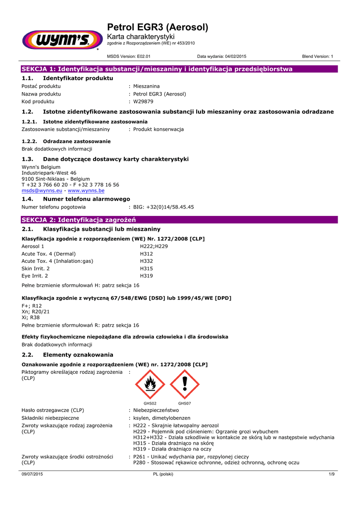 Petrol EGR3 (Aerosol) Karta charakterystyki zgodnie z Rozporządzeniem (WE) nr 453/2010 MSDS Version: E02.01 Data wydania: 04/02/2015 Blend Version: 1 SEKCJA 1: Identyfikacja substancji/mieszaniny i identyfikacja przedsiębiorstwa 1.1. Identyfikator produktu Postać produktu : Mieszanina Nazwa produktu : Petrol EGR3 (Aerosol) Kod produktu : W29879 1.2. Istotne zidentyfikowane zastosowania substancji lub mieszaniny oraz zastosowania odradzane 1.2.1. Istotne zidentyfikowane zastosowania Zastosowanie substancji/mieszaniny 1.2.2. : Produkt konserwacja Odradzane zastosowanie Brak dodatkowych informacji 1.3. Dane dotyczące dostawcy karty charakterystyki Wynn's Belgium Industriepark-West 46 9100 Sint-Niklaas - Belgium T +32 3 766 60 20 - F +32 3 778 16 56 [email protected] - www.wynns.be 1.4. Numer telefonu alarmowego Numer telefonu pogotowia : BIG: +32(0)14/58.45.45 SEKCJA 2: Identyfikacja zagrożeń 2.1. Klasyfikacja substancji lub mieszaniny Klasyfikacja zgodnie z rozporządzeniem (WE) Nr. 1272/2008 [CLP] Aerosol 1 H222;H229 Acute Tox. 4 (Dermal) H312 Acute Tox. 4 (Inhalation:gas) H332 Skin Irrit. 2 H315 Eye Irrit. 2 H319 Pełne brzmienie sformułowań H: patrz sekcja 16 Klasyfikacja zgodnie z wytyczną 67/548/EWG [DSD] lub 1999/45/WE [DPD] F+; R12 Xn; R20/21 Xi; R38 Pełne brzmienie sformułowań R: patrz sekcja 16 Efekty fizykochemiczne niepożądane dla zdrowia człowieka i dla środowiska Brak dodatkowych informacji 2.2. Elementy oznakowania Oznakowanie zgodnie z rozporządzeniem (WE) nr. 1272/2008 [CLP] Piktogramy określające rodzaj zagrożenia (CLP) : Hasło ostrzegawcze (CLP) : Niebezpieczeństwo Składniki niebezpieczne : ksylen, dimetylobenzen Zwroty wskazujące rodzaj zagrożenia (CLP) : H222 - Skrajnie łatwopalny aerozol H229 - Pojemnik pod ciśnieniem: Ogrzanie grozi wybuchem H312+H332 - Działa szkodliwie w kontakcie ze skórą lub w następstwie wdychania H315 - Działa drażniąco na skórę H319 - Działa drażniąco na oczy Zwroty wskazujące środki ostrożności (CLP) : P261 - Unikać wdychania par, rozpylonej cieczy P280 - Stosować rękawice ochronne, odzież ochronną, ochronę oczu GHS02 09/07/2015 PL (polski) GHS07 1/9 Petrol EGR3 (Aerosol) Karta charakterystyki zgodnie z Rozporządzeniem (WE) nr 453/2010 P271 - Stosować wyłącznie na zewnątrz lub w dobrze wentylowanym pomieszczeniu P102 - Chronić przed dziećmi P210 - Przechowywać z dala od źródeł ciepła, gorących powierzchni, źródeł iskrzenia, otwartego ognia i innych źródeł zapłonu. Nie palić P211 - Nie rozpylać nad otwartym ogniem lub innym źródłem zapłonu P251 - Nie przekłuwać ani nie spalać, nawet po zużyciu P410+P412 - Chronić przed światłem słonecznym. Nie wystawiać na działanie temperatury przekraczającej 50 °C/122 °F 2.3. Inne zagrożenia Brak dodatkowych informacji SEKCJA 3: Skład/informacja o składnikach 3.1. Substancja Nie dotyczy 3.2. Mieszanina Nazwa Identyfikator produktu %w Klasyfikacja zgodnie z dyrektywą 67/548/EEC ksylen, dimetylobenzen (Numer CAS) 1330-20-7 (Numer WE) 215-535-7 (Numer indeksowy) 601-022-00-9 (REACH-nr) 01-2119488216-32 50 - 75 R10 Xn; R20/21 Xi; R38 Propane (Numer CAS) 74-98-6 (Numer WE) 200-827-9 (Numer indeksowy) 601-003-00-5 (REACH-nr) 01-2119486944-21 10 - 25 F+; R12 Acetone (Numer CAS) 67-64-1 (Numer WE) 200-662-2 (Numer indeksowy) 606-001-00-8 (REACH-nr) 01-2119471330-49 10 - 25 F; R11 Xi; R36 R66 R67 4-methylpentan-2-ol (Numer CAS) 108-11-2 (Numer WE) 203-551-7 (Numer indeksowy) 603-008-00-8 (REACH-nr) 01-2119473979-13 2,5 - 5 R10 Xi; R36/37/38 Nazwa Identyfikator produktu Specyficzne ograniczenia stężenia ksylen, dimetylobenzen (Numer CAS) 1330-20-7 (Numer WE) 215-535-7 (Numer indeksowy) 601-022-00-9 (REACH-nr) 01-2119488216-32 (C >= 12,5) Xn;R20/21 4-methylpentan-2-ol (Numer CAS) 108-11-2 (Numer WE) 203-551-7 (Numer indeksowy) 603-008-00-8 (REACH-nr) 01-2119473979-13 (C >= 25) Xi;R37 Nazwa Identyfikator produktu %w Klasyfikacja zgodnie z rozporządzeniem (WE) Nr. 1272/2008 [CLP] ksylen, dimetylobenzen (Numer CAS) 1330-20-7 (Numer WE) 215-535-7 (Numer indeksowy) 601-022-00-9 (REACH-nr) 01-2119488216-32 50 - 75 Flam. Liq. 3, H226 Acute Tox. 4 (Dermal), H312 Acute Tox. 4 (Inhalation:dust,mist), H332 Skin Irrit. 2, H315 Propane (Numer CAS) 74-98-6 (Numer WE) 200-827-9 (Numer indeksowy) 601-003-00-5 (REACH-nr) 01-2119486944-21 10 - 25 Flam. Gas 1, H220 Acetone (Numer CAS) 67-64-1 (Numer WE) 200-662-2 (Numer indeksowy) 606-001-00-8 (REACH-nr) 01-2119471330-49 10 - 25 Flam. Liq. 2, H225 Eye Irrit. 2, H319 STOT SE 3, H336 4-methylpentan-2-ol (Numer CAS) 108-11-2 (Numer WE) 203-551-7 (Numer indeksowy) 603-008-00-8 (REACH-nr) 01-2119473979-13 2,5 - 5 Flam. Liq. 3, H226 Eye Irrit. 2, H319 STOT SE 3, H335 Nazwa Identyfikator produktu Specyficzne ograniczenia stężenia 4-methylpentan-2-ol (Numer CAS) 108-11-2 (Numer WE) 203-551-7 (Numer indeksowy) 603-008-00-8 (REACH-nr) 01-2119473979-13 (C >= 25) STOT SE 3, H335 Brzmienie sformułowań R i H: patrz sekcja 16 09/07/2015 PL (polski) 2/9 Petrol EGR3 (Aerosol) Karta charakterystyki zgodnie z Rozporządzeniem (WE) nr 453/2010 SEKCJA 4: Środki pierwszej pomocy 4.1. Opis środków pierwszej pomocy Pierwsza pomoc - środki ogólnie : Sprawdzać funkcje życiowe. Zapewnić poszkodowanemu odpoczynek w pozycji półsiedzącej. Poszkodowany nieprzytomny : utrzymać drożność dróg oddechowych. Zatrzymanie oddechu: zastosować sztuczne oddychanie lub podać tlen. Zatrzymanie pracy serca: przeprowadzić reanimację. Ofiara w szoku: na plecach z nogami lekko podniesiony. Wymioty : zapobiec uduszeniu/zachłystowemu zapaleniu płuc. Stale nadzorować poszkodowanego. Zapewnić pomoc psychologiczną. Zapobiec przeziębieniu dzięki przykryciu poszkodowanego (nie rozgrzewać). Keep the victim calm, avoid physical strain. Zasięgnąć porady lekarza, jeżeli to konieczne. Pierwsza pomoc - środki po zainhalowaniu : W przypadku trudności z oddychaniem, wyprowadzić lub wynieść poszkodowanego na świeże 