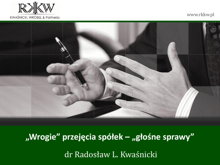 www.rkkw.pl „Wrogie” przejęcia spółek – „głośne sprawy” dr Radosław L. Kwaśnicki www.rkkw.pl MOTTO „Trzy są sposoby zdobywania mądrości. Pierwszy to refleksja – najbardziej szlachetny, następnie naśladowanie – jest on najłatwiejszy, a trzeci to doświadczenie – najbardziej gorzki ze wszystkich.” Konfucjusz KWAŚNICKI, WRÓBEL & Partnerzy 2 www.rkkw.pl PLAN WYKŁADU I. Obrona przed wrogim przejęciem / usiłowanie przejęcia spółki niepublicznej II. Case study: KRUK S.A. KWAŚNICKI, WRÓBEL & Partnerzy 3 www.rkkw.pl OBRONA PRZED WROGIM PRZEJĘCIEM / USIŁOWANIE PRZEJĘCIA SPÓŁKI NIEPUBLICZNEJ KWAŚNICKI, WRÓBEL & Partnerzy 4 www.rkkw.pl WROGIE PRZEJĘCIE SPÓŁKI (HOSTILE TAKEOVER) wbrew organom spółki (bez aprobaty Zarządu / Rady Nadzorczej) bez - … oficjalnego … - due diligence (alternatywa „kret w spółce”) zwiększone ryzyko przejmującego wbrew części akcjonariatu spółki (zwłaszcza akcjonariuszy większościowych) KWAŚNICKI, WRÓBEL & Partnerzy 5 www.rkkw.pl WROGIE PRZEJĘCIE SPÓŁKI (HOSTILE TAKEOVER) perspektywa przejmującego (jak wiele jest dozwolone …) perspektywa przejmowanego (prawie wszystko jest zakazane …) KWAŚNICKI, WRÓBEL & Partnerzy 6 www.rkkw.pl JAK ROZPOCZYNAJĄ SIĘ SCHODY… (CASE STUDY: SPÓŁKA NIEPUBLICZNA) „łakome kąski” jakie spółki najczęściej są celem wrogiego przejęcia? wpływ na decyzje wspólników / akcjonariuszy o zbyciu udziałów / akcji („pranie mózgów” ) [aspekty prawne (dobra osobiste, aspekty karne)] Skąd wziąć adresy wspólników / akcjonariuszy ? KWAŚNICKI, WRÓBEL & Partnerzy 7 www.rkkw.pl JAK ROZPOCZYNAJĄ SIĘ SCHODY… (CASE STUDY: SPÓŁKA NIEPUBLICZNA) nadużycie prawa z art. art. 188 § 2 oraz 341 § 7 KSH (cel: dane osobowe [adresy] wspólników / akcjonariuszy kluczowa rola tzw. klauzul winkulacyjnych zgoda organu spółki lub osoby trzeciej (sankcje) prawo pierwszeństwa (sposób realizacji, sankcje) prawo pierwokupu (sposób realizacji, sankcje) próby obejścia klauzul winkulacyjnych w praktyce: dwie perspektywy … spory sądowe (case: umowa X) KWAŚNICKI, WRÓBEL & Partnerzy 8 www.rkkw.pl OBRONA PRZED WROGIM PRZEJĘCIEM Ustawa z dnia 21 maja 2009 r. o zmianie ustawy – KSH wprowadziła obniżenie progu procentowego posiadanych głosów, po przekroczeniu którego statut może przewidywać ograniczenie prawa głosu (art. 411 § 3 KSH) Zmiany weszły w życie z dniem 1 sierpnia 2009 r. KWAŚNICKI, WRÓBEL & Partnerzy 9 www.rkkw.pl OBRONA PRZED WROGIM PRZEJĘCIEM 1. obniżenie progu procentowego posiadanych głosów (z 1/5 do 1/10), od którego statut spółki może przewidywać ograniczenie wykonywania prawa głosu (silniejsza ochrona akcjonariuszy mniejszościowych; trudniejsze wrogie przejęcie spółki) 2. jednoznaczne rozstrzygnięcie, iż w celu obliczenia progu procentowego posiadanych w spółce głosów do głosów akcjonariusza dolicza się również głosy przysługujące mu na podstawie innego tytułu prawnego aniżeli prawo własności akcji (zwłaszcza zaś na podstawie użytkowania czy zastawu) KWAŚNICKI, WRÓBEL & Partnerzy 10 www.rkkw.pl OBRONA PRZED WROGIM PRZEJĘCIEM 3. jednoznaczne rozstrzygnięcie, iż statutowe ograniczenia wykonywania prawa głosu dotyczą również osób niebędących akcjonariuszami, lecz dysponujących prawem głosu wyłącznie na podstawie innego tytułu prawnego (zwłaszcza zaś użytkowania, zastawu) 4. „zabezpieczenie” niektórych strategicznych spółek (m. in. PKN Orlen) przed kwestionowaniem ich statutowych regulacji wprowadzających ograniczenia wykonywania prawa głosu KWAŚNICKI, WRÓBEL & Partnerzy 11 www.rkkw.pl PRZEJMUJĄCY UJAWNIA SIĘ … (NA PRZYKŁADZIE SPÓŁKI NIEPUBLICZNEJ) ujawnienie nieodwołalnych pełnomocnictw środki obrony: odmowa udziału (bezpośrednio lub komisja) pozew + wniosek o zabezpieczenie powództwa wniosek o zwołanie ZW / WZ (10%), (środki obrony) KWAŚNICKI, WRÓBEL & Partnerzy 12 www.rkkw.pl PRZEJMUJĄCY UJAWNIA SIĘ … (NA PRZYKŁADZIE SPÓŁKI NIEPUBLICZNEJ) bezpośrednie zwołanie WZ (50% [tylko S.A. po 3 sierpnia 2009 r.]), (środki obrony) wniosek o wybór RN grupami (lepiej mniejsze RN), (środki obrony) wniosek o wybór komisji ds. pełnomocnictw (10%), (środki obrony) KWAŚNICKI, WRÓBEL & Partnerzy 13 www.rkkw.pl CASE STUDY : KRUK S.A. KWAŚNICKI, WRÓBEL & Partnerzy 14 www.rkkw.pl ŹRÓDŁA Niniejsza prezentacja została przygotowana wyłącznie w oparciu o publicznie dostępne informacje, w tym m. in. na podstawie następujących artykułów prasowych: 1. T. Prusak, Pierwsze wrogie przejęcie na warszawskiej giełdzie, Gazeta Wyborcza z dnia 26 maja 2008 r.; 2. Krystyna Naszkowska, Sprzątanie po wrogim przejęciu Kruka, Gazeta Wyborcza z dnia 1 sierpnia 2008 r.; 3. Zbigniew Grzegorzewski, Wrogie przejęcia, CEO Top Magazyn Menedżerów, wrzesień 2008 r. KWAŚNICKI, WRÓBEL & Partnerzy 15 www.rkkw.pl KRUK – STRUKTURA KAPITAŁU MAJ 2008 R. Struktura kapitału: 28 % - rodzina Kruk 35 % - 40 %- fundusze inwestycyjne 32% - 37 % - pozostali akcjonariusze KWAŚNICKI, WRÓBEL & Partnerzy 16 www.rkkw.pl VISTULA & WÓLCZANKA – KRUK 1. Vistula & Wólczanka: atak – wezwanie do sprzedaży akcji Kruka – maj 2008 r. 5 maja 2008 r. – wezwanie akcjonariuszy Kruk do sprzedaży akcji stanowiących 66 % na WZA Kruk cena akcji: niewiele powyżej wartości rynkowej – wartość rynkowa akcji: 22,46 zł; wezwanie: 23,70 zł skuteczność wezwania: nabycie przez Vistula & Wólczanka akcji uprawniających do 51% głosów na WZA Kruk KWAŚNICKI, WRÓBEL & Partnerzy 17 www.rkkw.pl VISTULA & WÓLCZANKA – KRUK 2. Kruk: próba obrony – maj 2008 r. propozycja skupienia akcji od funduszy inwestycyjnych (nabycie akcji w celu umorzenia) 3. Vistula & Wólczanka: atak – podniesienie ceny akcji – maj 2008 r. podniesienie proponowanej ceny nabycia akcji z 23, 70 zł do 24, 50 zł KWAŚNICKI, WRÓBEL & Partnerzy 18 www.rkkw.pl VISTULA & WÓLCZANKA – KRUK 4. Kruk: odp