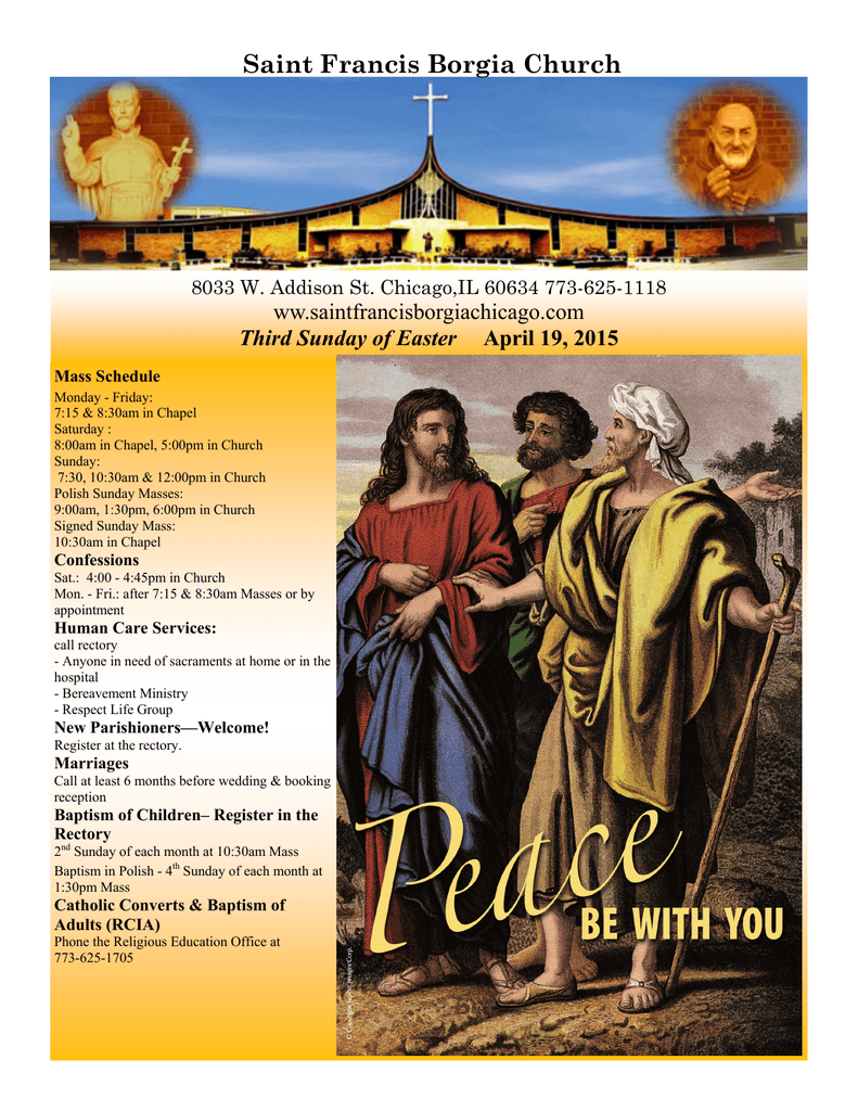 Saint Francis Borgia Church 8033 W. Addison St. Chicago,IL 60634 773-625-1118 ww.saintfrancisborgiachicago.com Third Sunday of Easter April 19, 2015 Mass Schedule Monday - Friday: 7:15 & 8:30am in Chapel Saturday : 8:00am in Chapel, 5:00pm in Church Sunday: 7:30, 10:30am & 12:00pm in Church Polish Sunday Masses: 9:00am, 1:30pm, 6:00pm in Church Signed Sunday Mass: 10:30am in Chapel Confessions Sat.: 4:00 - 4:45pm in Church Mon. - Fri.: after 7:15 & 8:30am Masses or by appointment Human Care Services: call rectory - Anyone in need of sacraments at home or in the hospital - Bereavement Ministry - Respect Life Group New Parishioners—Welcome! Register at the rectory. Marriages Call at least 6 months before wedding & booking reception Baptism of Children– Register in the Rectory 2nd Sunday of each month at 10:30am Mass Baptism in Polish - 4th Sunday of each month at 1:30pm Mass Catholic Converts & Baptism of Adults (RCIA) Phone the Religious Education Office at 773-625-1705 Mass Intentions Saturday, April 18, 2015 8:00 Most Forgotten Souls in Purgatory 5:00 Health & Blessings on 30th Wedding Ann. Jan Perek on ann. of death Joseph Jagiello Sunday, April 19, 2015 - Third Sunday of Easter 7:30 Carmella Sparacino Casey & Anjuta Grabowski Joseph Biela Barbara Mulcrone Grace Carsello Bronislaw Greczek Cresencio Evangelista, Sr. 9:00 W 13 rocz. slubu, o Boze Blog., zdrowie oraz dziekczynna za otrzymane laski dla Doroty i Jozefa O zawierzenie milosierdziu Bozemu corki i siostrzenicy i ich rodzin O Dary Ducha Sw. i opatrznosc Matki Bozej w 14 urodziny dla Wiktorii Dziekczynna za przezyte 47 lat malzenstwa z prosba o dalsza Opieke i Blog. dla Marii i Jana Bycul O zdrowie i Boze Blog. dla rodzicow z okazji 40 rocz. zawarcia Sakramentu malzenstwa Czeslaw Sepko Jan Witkowski o radosc zycia wiecznego Wieslaw Moskal Jan Mikula w 20 rocz. smierci Ludwik, Antonina, Michal Kijak Maria i Franciszek Wojcik Witold Sokolowski w 12 rocz. smierci i za s.p. Teresy Sokolowski Julia, Stanislaw Galek i zmarli z rodziny Galkow i Pecakow Stanislaw Wilczek w 12 rocz. smierci Piotr Franeczek Bozena Gardocka 10:30 Sophie Skoczynski Giuseppe & Onelia Settefrati Rogelio Cabrera Dorothy Schultz Lillian Mihlfried Joseph Jagiello 12:00 Gaetano Urbanio Maria Lorusso 1:30 Stanislaw Machnik w 24 rocz. smierci Helena Wicher, zmarla w Polsce - intencja od syna Maria Kowalska i Adolf Kowalski S.p. Tadeusza Maj w dniu urodzin 6:00 Krystyna Bramski Monday, April 20, 2015 7:15 Joseph Jagiello 8:30 Virginia Sempio Tuesday, April 21, 2015 7:15 Joseph Jagiello 8:30 Health and Blessings for Barbara Considine John Heekin New Parishioners Are Invited to Register Wednesday, April 22, 2015 7:15 Joseph Jagiello 8:30 John Molyneaux Thursday, April 23, 2015 7:15 Joseph Kern 8:30 Joseph Jagiello Andrew Thompson Friday, April 24, 2015 7:15 Joseph Jagiello 8:30 Joseph Jagiello Saturday, April 25, 2015 - St. Mark 8:00 For God’s guidance and help during finals 5:00 Anastazja Pacocha Joseph Jagiello Sunday, April 26, 2015 - Fourth Sunday of Easter 7:30 Patricia Haran Michael Kennedy Katarzyna Wojnarowska 9:00 Z podziekowaniem za otrzymane laski z prosba o dalsza Opieke Boza dla Janiny i Kazimierza w 45 rocz. zawarcia Sakramentu malzenstwa O zawierzenie milosierdziu Bozemu corki i siostrzenicy i ich rodzin W podziekowaniu za wspolnie przezyte 55 lat malzenstwa oraz o dalsze Blog. Boze i Opieke Matki Bozej Czestochowskiej dla Zofi i Stanislawa Miskowiec - od Mirki i Jarka z rodzina Czeslaw Sepko Jan Witkowski o radosc zycia wiecznego Wieslaw Moskal Jan i Agnieszka Rachmaciej w 12 rocz. smierci Jana Marianna i Antoni Andruk w 15 rocz.. Smierci Marianny Piotr Franczek Bozena Gardocka Wiktoria, Jan Bronislaw w 1 rocz. smierci, Wladyslaw, Jozef, Stanislaw, Wladyslawa Filas oraz Rozalia i Stefania Miskowiec 10:30 Health & Blessings for Carmen & Gloria Pelegrino on their 50th Wedding Ann. Health & Blessing for John Foley Rogelio Cabrena Joseph Jagiello George Paris Stanislaw Lapowicz on his 9th ann. of death 12:00 Health & Blessings for Carmen & Gloria Pelegrino on their 50th Wedding Ann. Gaetano Urbanio Domenico & Rosa Parente Jim & Imelda Burke and Mary Murke 1:30 Stanislaw Los, o radosc wieczna w rocz. smierci 6:00 Krystyna Bramski Forma Rejestracyjna ______________________________________ Last name of registrants / Nazwisko ______________________________________ First name/ Imię Date of Birth ______________________________________ Name of spouse / Imię małżonka Date of Birth ______________________________________ Names of children/ Dzieci Dates of Birth ______________________________________ Address/ Adres ______________________________________ City, State, Zip/ Miasto, Stan, Zip ______________________________________ Home phone number/ Numer telefonu I am: Married Single Widowed ______________________________________ Alternate phone number/ Numer telefonu Divorced Separated St. Francis Borgia Mission Statement “St. Francis Borgia nurtures the Roman Catholic Faith and fosters the gifts of the Holy Spirit in all by: Welcoming everyone into our faith community; Celebrating the sacraments together; Providing faith education; Providing an environment for prayerful meditation; Utilizing our time, talents and treasures. We resolve to develop, support, empower, and encourage individuals to reach their spiritual potential for the greater glory of God and the good of His people.” Members of our church community are serving our country in the various branches of the military. Please pray for all of them and their families and especially for those listed below. Matthew J. Albanese James Allision Paul Raymond Barthel Rev. Marcin Bulinski Christopher R. Burdulinski Joseph Vito Burdulinski Anthony L. Cammuca James D. Campis Jasper Catalano Kevin Chesney Robert Curtis Tamara DeCaro Shawn Gaffney Gerald Giovannelli Slawomir Glownia Michael Granadon Daniel Jarosz Joseph Patrick Kinney Frank Joseph Klimas James Labbe Tom Lewandowski Michael Labek Matt Manzano Tim