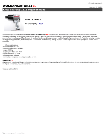 Informacje o produkcie Utworzono 07-03-2017 Klucz udarowy 131S Ingersoll Rand Cena : 610,00 zł Nr katalogowy : 3998 Klucz pneumatyczny, udarowy firmy INGERSOLL RAND. Model IR 131S używany jest głównie w warsztatach wulkanizacyjnych, samochodowych i blacharskich. Posiada bardzo wydajny mechanizm udarowy typu Twin Hammer czyli Podwójny Młot, który podwyższa jakość i skuteczność narzędzia. Amerykańska firma Ingersoll Rand należy do czołówki liderów specjalizujących się w produkcji urządzeń pneumatycznych. Produkt oryginalny, posiada roczną gwarancję fabryczną, dostarczaną wraz z narzędziem, oraz instrukcję obsługi w języku polskim. Opakowanie może występować w innej szacie graficznej. Dane techniczne: - średnica czopa : 1/2 cala - moment maksymalny : 610 Nm - waga : 2,63 kg - zużycie powietrza : 610 l/min - ciśnienie robocze : 6,2 bar - wlot powietrza : 1/4 cala - minimalna wewnętrzna średnica przewodu : 10 mm Zapamiętaj !!! Aby zapewnić prawidłową i długotrwałą pracę klucza pneumatycznego,należy go podłączyć jak najbliżej zestawu do oczyszczania sprężonego powietrza (naolejacz, odwadniacz, regulator ciśnienia). Cena za sztukę: 610 zł Wygenerowano w programie www.oscGold.com