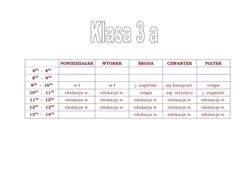 PONIEDZIAŁEK WTOREK ŚRODA CZWARTEK PIĄTEK 950 - 1035 w-f w-f j. angielski zaj.komputer. religia 1045 - 1130 edukacja w. edukacja w. religia zaj. artystycz j. angielski 1145 - 1230 edukacja w. edukacja w. edukacja w. edukacja w. edukacja w. 1245 - 1330 edukacja w. edukacja w. edukacja w. edukacja w. edukacja w. edukacja w. edukacja w. edukacja w. 800 - 845 855 - 940 1340 - 1425