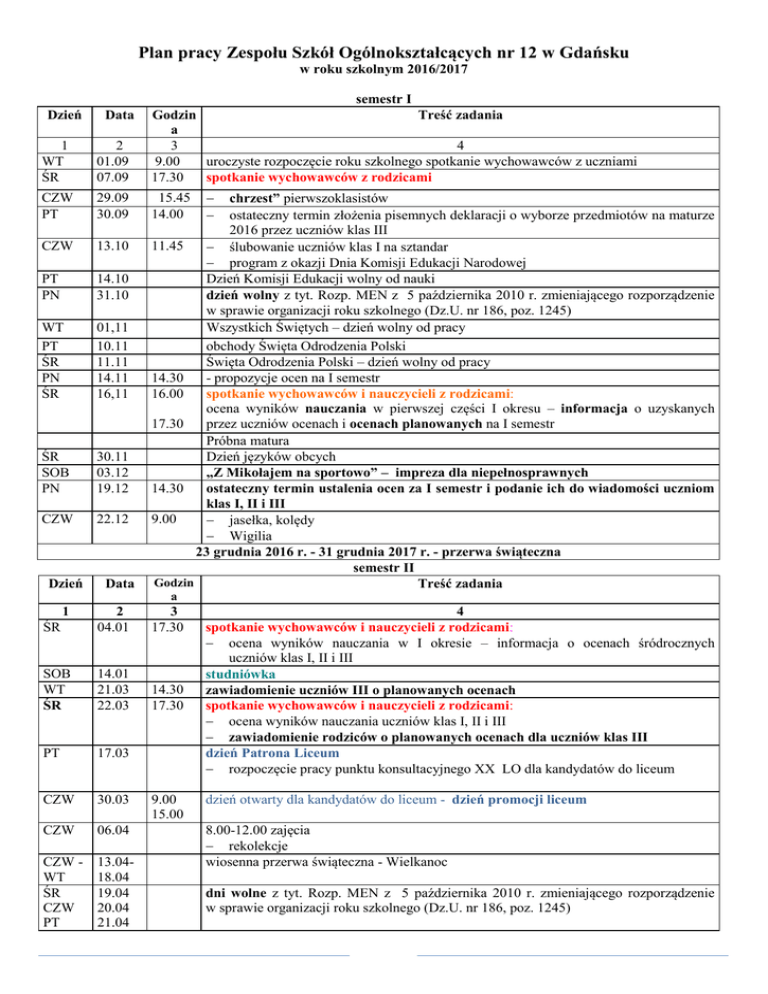 Plan pracy Zespołu Szkół Ogólnokształcących nr 12 w Gdańsku w roku szkolnym 2016/2017 semestr I Dzień 1 WT ŚR 2 01.09 07.09 Godzin Treść zadania a 3 4 9.00 uroczyste rozpoczęcie roku szkolnego spotkanie wychowawców z uczniami 17.30 spotkanie wychowawców z rodzicami CZW PT 29.09 30.09 15.45 14.00 CZW 13.10 PT PN 14.10 31.10 WT PT ŚR PN ŚR 01,11 10.11 11.11 14.11 16,11 ŚR SOB PN 30.11 03.12 19.12 CZW 22.12 Dzień Data Data chrzest” pierwszoklasistów ostateczny termin złożenia pisemnych deklaracji o wyborze przedmiotów na maturze 2016 przez uczniów klas III 11.45 ślubowanie uczniów klas I na sztandar program z okazji Dnia Komisji Edukacji Narodowej Dzień Komisji Edukacji wolny od nauki dzień wolny z tyt. Rozp. MEN z 5 października 2010 r. zmieniającego rozporządzenie w sprawie organizacji roku szkolnego (Dz.U. nr 186, poz. 1245) Wszystkich Świętych – dzień wolny od pracy obchody Święta Odrodzenia Polski Święta Odrodzenia Polski – dzień wolny od pracy 14.30 - propozycje ocen na I semestr 16.00 spotkanie wychowawców i nauczycieli z rodzicami: ocena wyników nauczania w pierwszej części I okresu – informacja o uzyskanych 17.30 przez uczniów ocenach i ocenach planowanych na I semestr Próbna matura Dzień języków obcych „Z Mikołajem na sportowo” – impreza dla niepełnosprawnych 14.30 ostateczny termin ustalenia ocen za I semestr i podanie ich do wiadomości uczniom klas I, II i III 9.00 jasełka, kolędy Wigilia 23 grudnia 2016 r. - 31 grudnia 2017 r. - przerwa świąteczna semestr II Godzin Treść zadania a 1 ŚR 2 04.01 3 17.30 SOB WT ŚR 14.01 21.03 22.03 14.30 17.30 PT 17.03 CZW 30.03 CZW 06.04 CZW WT ŚR CZW PT 13.0418.04 19.04 20.04 21.04 9.00 15.00 4 spotkanie wychowawców i nauczycieli z rodzicami: ocena wyników nauczania w I okresie – informacja o ocenach śródrocznych uczniów klas I, II i III studniówka zawiadomienie uczniów III o planowanych ocenach spotkanie wychowawców i nauczycieli z rodzicami: ocena wyników nauczania uczniów klas I, II i III zawiadomienie rodziców o planowanych ocenach dla uczniów klas III dzień Patrona Liceum rozpoczęcie pracy punktu konsultacyjnego XX LO dla kandydatów do liceum dzień otwarty dla kandydatów do liceum - dzień promocji liceum 8.00-12.00 zajęcia rekolekcje wiosenna przerwa świąteczna - Wielkanoc dni wolne z tyt. Rozp. MEN z 5 października 2010 r. zmieniającego rozporządzenie w sprawie organizacji roku szkolnego (Dz.U. nr 186, poz. 1245) PN 24.04 14.30 PT 28.04 13.00 PN 01.05 WT 02.05 ŚR CZW PT PN WT ŚR 03.05 04.05 05.05 08.05 16.05 17.05 CZW PT 15.06 16.06 PN 19.06 14.30 ŚR CZW PT 22.06 23.06 23.06. 9.00 PN – ŚR PT 28.08 30.08 31.08 09.00 ostateczny termin ustalenia ocen dla uczniów klas III i podanie ich do wiadomości w klasach zakończenie zajęć w klasach III – uroczyste pożegnanie absolwentów - przekazanie sztandaru uczniom klas II i ślubowanie absolwentów na sztandar liceum - wręczenie świadectw ukończenia liceum, dyplomów i nagród dzień wolny od pracy - 1 maja dzień wolny z tyt. Rozp. MEN z 5 października 2010 r. zmieniającego rozporządzenie w sprawie organizacji roku szkolnego (Dz.U. nr 186, poz. 1245) dzień wolny od pracy - 3 maja dni wolne z tyt. Rozp. MEN z 5 października 2010 r. zmieniającego rozporządzenie w sprawie organizacji roku szkolnego (Dz.U. nr 186, poz. 1245) 14.30 17.00 17.30 zawiadomienie uczniów klas I-II o planowanych ocenach spotkanie nauczycieli z rodzicami - ostateczny termin zawiadomienia rodziców o planowanych ocenach dla uczniów klas I i II dzień wolny od pracy - Boże Ciało dzień wolny z tyt. Rozp. MEN z 5 października 2010 r. zmieniającego rozporządzenie w sprawie organizacji roku szkolnego (Dz.U. nr 186, poz. 1245). ostateczny termin ustalenia ocen dla uczniów klas I G, I LO i II LO i ogłoszenia ich w klasach dni sportu i zabawy w XX LO - turniej klas uroczyste zakończenie roku szkolnego egzaminy poprawkowe i klasyfikacyjne rada pedagogiczna przed rozpoczęciem roku szkolnego 2017/2018