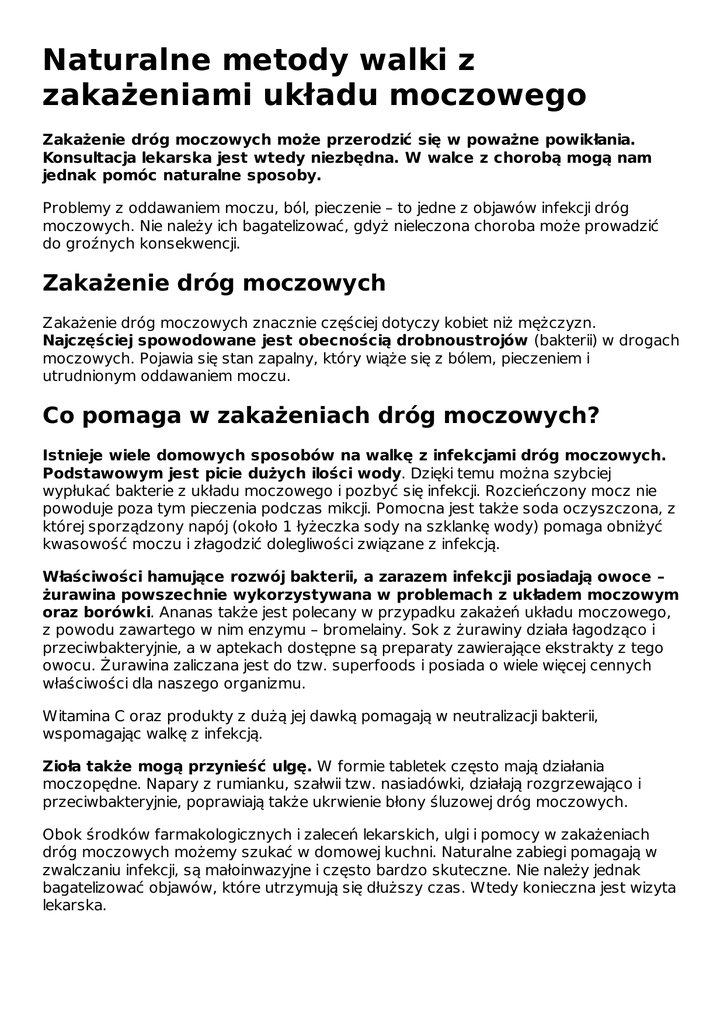Naturalne metody walki z zakażeniami układu moczowego Zakażenie dróg moczowych może przerodzić się w poważne powikłania. Konsultacja lekarska jest wtedy niezbędna. W walce z chorobą mogą nam jednak pomóc naturalne sposoby. Problemy z oddawaniem moczu, ból, pieczenie – to jedne z objawów infekcji dróg moczowych. Nie należy ich bagatelizować, gdyż nieleczona choroba może prowadzić do groźnych konsekwencji. Zakażenie dróg moczowych Zakażenie dróg moczowych znacznie częściej dotyczy kobiet niż mężczyzn. Najczęściej spowodowane jest obecnością drobnoustrojów (bakterii) w drogach moczowych. Pojawia się stan zapalny, który wiąże się z bólem, pieczeniem i utrudnionym oddawaniem moczu. Co pomaga w zakażeniach dróg moczowych? Istnieje wiele domowych sposobów na walkę z infekcjami dróg moczowych. Podstawowym jest picie dużych ilości wody. Dzięki temu można szybciej wypłukać bakterie z układu moczowego i pozbyć się infekcji. Rozcieńczony mocz nie powoduje poza tym pieczenia podczas mikcji. Pomocna jest także soda oczyszczona, z której sporządzony napój (około 1 łyżeczka sody na szklankę wody) pomaga obniżyć kwasowość moczu i złagodzić dolegliwości związane z infekcją. Właściwości hamujące rozwój bakterii, a zarazem infekcji posiadają owoce – żurawina powszechnie wykorzystywana w problemach z układem moczowym oraz borówki. Ananas także jest polecany w przypadku zakażeń układu moczowego, z powodu zawartego w nim enzymu – bromelainy. Sok z żurawiny działa łagodząco i przeciwbakteryjnie, a w aptekach dostępne są preparaty zawierające ekstrakty z tego owocu. Żurawina zaliczana jest do tzw. superfoods i posiada o wiele więcej cennych właściwości dla naszego organizmu. Witamina C oraz produkty z dużą jej dawką pomagają w neutralizacji bakterii, wspomagając walkę z infekcją. Zioła także mogą przynieść ulgę. W formie tabletek często mają działania moczopędne. Napary z rumianku, szałwii tzw. nasiadówki, działają rozgrzewająco i przeciwbakteryjnie, poprawiają także ukrwienie błony śluzowej dróg moczowych. Obok środków farmakologicznych i zaleceń lekarskich, ulgi i pomocy w zakażeniach dróg moczowych możemy szukać w domowej kuchni. Naturalne zabiegi pomagają w zwalczaniu infekcji, są małoinwazyjne i często bardzo skuteczne. Nie należy jednak bagatelizować objawów, które utrzymują się dłuższy czas. Wtedy konieczna jest wizyta lekarska. Author: Aleksandra Musiał Link do artykułu: http://bonavita.pl/naturalne-metody-walki-z-zakazeniami-ukladumoczowego
