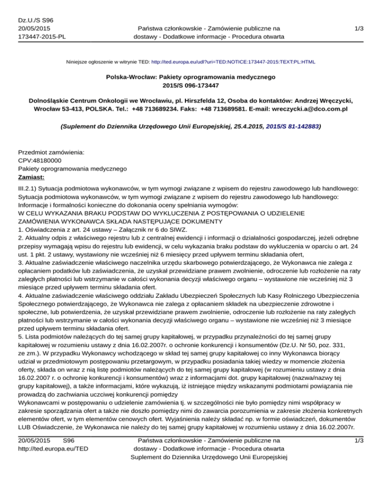 Dz.U./S S96 20/05/2015 173447-2015-PL Państwa członkowskie - Zamówienie publiczne na dostawy - Dodatkowe informacje - Procedura otwarta 1/3 Niniejsze ogłoszenie w witrynie TED: http://ted.europa.eu/udl?uri=TED:NOTICE:173447-2015:TEXT:PL:HTML Polska-Wrocław: Pakiety oprogramowania medycznego 2015/S 096-173447 Dolnośląskie Centrum Onkologii we Wrocławiu, pl. Hirszfelda 12, Osoba do kontaktów: Andrzej Wręczycki, Wrocław 53-413, POLSKA. Tel.: +48 713689234. Faks: +48 713689581. E-mail: [email protected] (Suplement do Dziennika Urzędowego Unii Europejskiej, 25.4.2015, 2015/S 81-142883) Przedmiot zamówienia: CPV:48180000 Pakiety oprogramowania medycznego Zamiast: III.2.1) Sytuacja podmiotowa wykonawców, w tym wymogi związane z wpisem do rejestru zawodowego lub handlowego: Sytuacja podmiotowa wykonawców, w tym wymogi związane z wpisem do rejestru zawodowego lub handlowego: Informacje i formalności konieczne do dokonania oceny spełniania wymogów: W CELU WYKAZANIA BRAKU PODSTAW DO WYKLUCZENIA Z POSTĘPOWANIA O UDZIELENIE ZAMÓWIENIA WYKONAWCA SKŁADA NASTĘPUJĄCE DOKUMENTY 1. Oświadczenia z art. 24 ustawy – Załącznik nr 6 do SIWZ. 2. Aktualny odpis z właściwego rejestru lub z centralnej ewidencji i informacji o działalności gospodarczej, jeżeli odrębne przepisy wymagają wpisu do rejestru lub ewidencji, w celu wykazania braku podstaw do wykluczenia w oparciu o art. 24 ust. 1 pkt. 2 ustawy, wystawiony nie wcześniej niż 6 miesięcy przed upływem terminu składania ofert, 3. Aktualne zaświadczenie właściwego naczelnika urzędu skarbowego potwierdzającego, że Wykonawca nie zalega z opłacaniem podatków lub zaświadczenia, że uzyskał przewidziane prawem zwolnienie, odroczenie lub rozłożenie na raty zaległych płatności lub wstrzymanie w całości wykonania decyzji właściwego organu – wystawione nie wcześniej niż 3 miesiące przed upływem terminu składania ofert. 4. Aktualne zaświadczenie właściwego oddziału Zakładu Ubezpieczeń Społecznych lub Kasy Rolniczego Ubezpieczenia Społecznego potwierdzającego, że Wykonawca nie zalega z opłacaniem składek na ubezpieczenie zdrowotne i społeczne, lub potwierdzenia, że uzyskał przewidziane prawem zwolnienie, odroczenie lub rozłożenie na raty zaległych płatności lub wstrzymanie w całości wykonania decyzji właściwego organu – wystawione nie wcześniej niż 3 miesiące przed upływem terminu składania ofert. 5. Lista podmiotów należących do tej samej grupy kapitałowej, w przypadku przynależności do tej samej grupy kapitałowej w rozumieniu ustawy z dnia 16.02.2007r. o ochronie konkurencji i konsumentów (Dz.U. Nr 50, poz. 331, ze zm.). W przypadku Wykonawcy wchodzącego w skład tej samej grupy kapitałowej co inny Wykonawca biorący udział w przedmiotowym postępowaniu przetargowym, w przypadku posiadania takiej wiedzy w momencie złożenia oferty, składa on wraz z nią listę podmiotów należących do tej samej grupy kapitałowej (w rozumieniu ustawy z dnia 16.02.2007 r. o ochronię konkurencji i konsumentów) wraz z informacjami dot. grupy kapitałowej (nazwa/nazwy tej grupy kapitałowej), a także informacjami, które wykazują, iż istniejące między wskazanymi podmiotami powiązania nie prowadzą do zachwiania uczciwej konkurencji pomiędzy Wykonawcami w postępowaniu o udzielenie zamówienia tj. w szczególności nie było pomiędzy nimi współpracy w zakresie sporządzania ofert a także nie doszło pomiędzy nimi do zawarcia porozumienia w zakresie złożenia konkretnych elementów ofert, w tym elementów cenowych ofert. Wyjaśnienia należy składać np. w formie oświadczeń, dokumentów LUB Oświadczenie, że Wykonawca nie należy do tej samej grupy kapitałowej w rozumieniu ustawy z dnia 16.02.2007r. 20/05/2015 S96 http://ted.europa.eu/TED Państwa członkowskie - Zamówienie publiczne na dostawy - Dodatkowe informacje - Procedura otwarta Suplement do Dziennika Urzędowego Unii Europejskiej 1/3 Dz.U./S S96 20/05/2015 173447-2015-PL Państwa członkowskie - Zamówienie publiczne na dostawy - Dodatkowe informacje - Procedura otwarta 2/3 o ochronie konkurencji i konsumentów (Dz.U. Nr 50, poz. 331, ze zm.), w przypadku, jeśli Wykonawca nie należy do tej samej grupy kapitałowej w rozumieniu ustawy z dnia 16.02.2007r. o ochronie konkurencji i konsumentów (Dz.U. Nr 50, poz. 331, ze zm. (w załączniku nr 3 – druk oferty). 6. Aktualna informacja z Krajowego Rejestru Karnego w zakresie określonym w art. 24 ust. 1 pkt. 4-8 ustawy, wystawiona nie wcześniej niż 6 miesięcy przed upływem terminu składania ofert 7. Aktualna informacja z Krajowego Rejestru Karnego w zakresie określonym w art. 24 ust. 1 pkt. 9 ustawy, wystawiona nie wcześniej niż 6 miesięcy przed upływem terminu składania ofert. 8. Aktualna informacja z Krajowego Rejestru Karnego w zakresie określonym w art. 24 ust. 1 pkt. 10 i 11 ustawy, wystawiona nie wcześniej niż 6 miesięcy przed upływem terminu składania ofert. 9. Warunkiem udziału jest posiadanie przez Wykonawcę aktualnego zezwolenia Prezesa Państwowej Agencji Atomistyki dla Wykonawcy oraz dla pracowników Wykonawcy w zakresie uruchamiania (serwisowania) posiadanych przez Zamawiającego akceleratorów Clinac i TrueBeam i symulatorów Acuity (wymagane m.in. dla implementacji oprogramowania SWiZ&O na stacjach roboczych tych akceleratorów i symulatorów podczas ich uruchamiania/integracji w SWiZ&O po jego instalacji. IV.3.4) Termin składania ofert lub wniosków o dopuszczenie do udziału w postępowaniu: 3.6.2015 (10:00) IV.3.8) Warunki otwarcia ofert: 3.6.2015 (10:15) Powinno być: III.2.1) Sytuacja podmiotowa wykonawców, w tym wymogi związane z wpisem do rejestru zawodowego lub handlowego: Sytuacja podmiotowa wykonawców, w tym wymogi związane z wpisem do rejestru zawodowego lub handlowego: Informacje i formalności konieczne do dokonania oceny spełniania wymogów: W celu wykazania braku podstaw do wykluczenia z postępowani