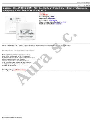 Informacje o produkcie Utworzono 07-03-2017 Janssen - DEMANDING SKIN - Rich Eye Contour Cream15ml - Krem wygładzający i pielęgnujący wrażliwą skórę okolicy oczu, Cena : 106.00 zł s. c. Nr katalogowy : 0061 Producent : JANSSEN Dostępność : Dostępny Stan magazynowy : bardzo wysoki Średnia ocena : brak recenzji Janssen - DEMANDING SKIN - Rich Eye Contour Cream15ml - Krem wygładzający i pielęgnujący wrażliwą skórę okolicy oczu, DEMANDING SKIN - pielęgnacja skóry wymagającej Au r a Krem wygładzający i pielęgnujący wrażliwą skórę okolicy oczu, przeznaczony dla cery wymagającej. Łagodna receptura wygładza, ujędrnia skórę i minimalizuje drobne zmarszczki wokół oczu. Składniki aktywne: olej makadamia, palmitynian witaminy A, octan witaminy E, kwas hialuronowy oraz kompleks nawilżający pozyskany z naturalnych cukrów (izomerat sacharydowy). * do odsprzedaży /produkt detaliczny Wygenerowano w programie www.oscGold.com