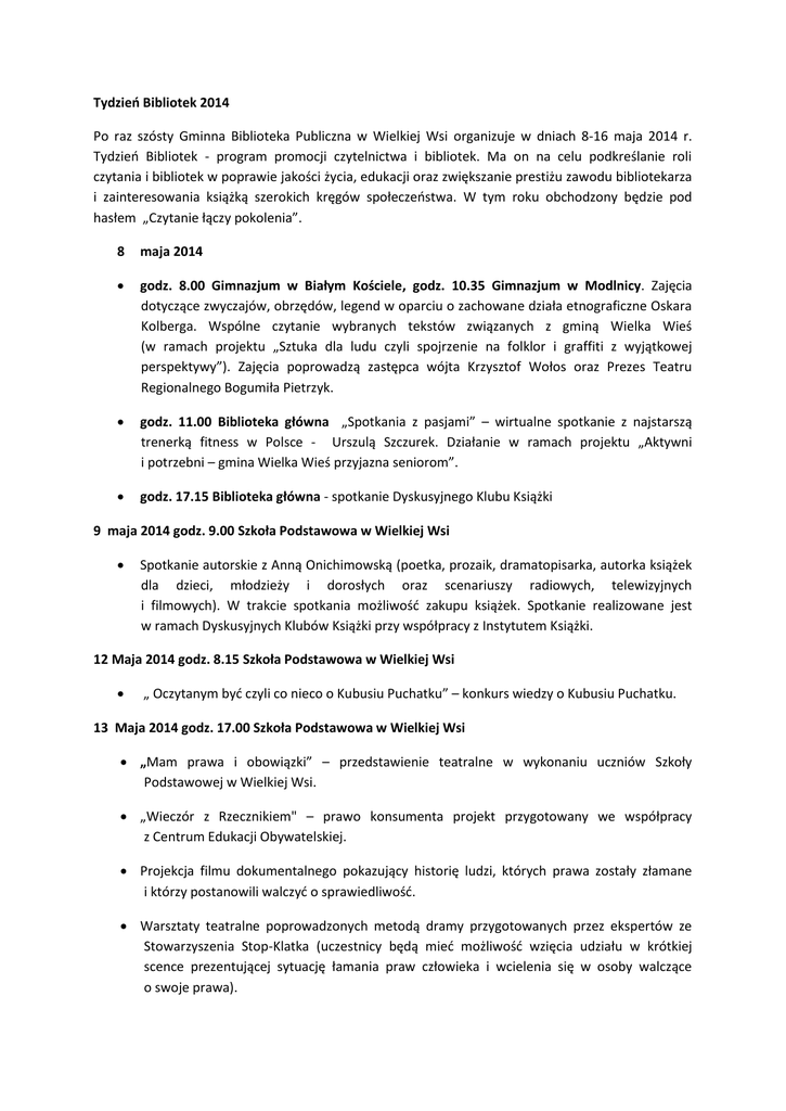 Tydzień Bibliotek 2014 Po raz szósty Gminna Biblioteka Publiczna w Wielkiej Wsi organizuje w dniach 8-16 maja 2014 r. Tydzień Bibliotek - program promocji czytelnictwa i bibliotek. Ma on na celu podkreślanie roli czytania i bibliotek w poprawie jakości życia, edukacji oraz zwiększanie prestiżu zawodu bibliotekarza i zainteresowania książką szerokich kręgów społeczeństwa. W tym roku obchodzony będzie pod hasłem „Czytanie łączy pokolenia”. 8 maja 2014 godz. 8.00 Gimnazjum w Białym Kościele, godz. 10.35 Gimnazjum w Modlnicy. Zajęcia dotyczące zwyczajów, obrzędów, legend w oparciu o zachowane działa etnograficzne Oskara Kolberga. Wspólne czytanie wybranych tekstów związanych z gminą Wielka Wieś (w ramach projektu „Sztuka dla ludu czyli spojrzenie na folklor i graffiti z wyjątkowej perspektywy”). Zajęcia poprowadzą zastępca wójta Krzysztof Wołos oraz Prezes Teatru Regionalnego Bogumiła Pietrzyk. godz. 11.00 Biblioteka główna „Spotkania z pasjami” – wirtualne spotkanie z najstarszą trenerką fitness w Polsce - Urszulą Szczurek. Działanie w ramach projektu „Aktywni i potrzebni – gmina Wielka Wieś przyjazna seniorom”. godz. 17.15 Biblioteka główna - spotkanie Dyskusyjnego Klubu Książki 9 maja 2014 godz. 9.00 Szkoła Podstawowa w Wielkiej Wsi Spotkanie autorskie z Anną Onichimowską (poetka, prozaik, dramatopisarka, autorka książek dla dzieci, młodzieży i dorosłych oraz scenariuszy radiowych, telewizyjnych i filmowych). W trakcie spotkania możliwość zakupu książek. Spotkanie realizowane jest w ramach Dyskusyjnych Klubów Książki przy współpracy z Instytutem Książki. 12 Maja 2014 godz. 8.15 Szkoła Podstawowa w Wielkiej Wsi „ Oczytanym być czyli co nieco o Kubusiu Puchatku” – konkurs wiedzy o Kubusiu Puchatku. 13 Maja 2014 godz. 17.00 Szkoła Podstawowa w Wielkiej Wsi „Mam prawa i obowiązki” – przedstawienie teatralne w wykonaniu uczniów Szkoły Podstawowej w Wielkiej Wsi. „Wieczór z Rzecznikiem" – prawo konsumenta projekt przygotowany we współpracy z Centrum Edukacji Obywatelskiej. Projekcja filmu dokumentalnego pokazujący historię ludzi, których prawa zostały złamane i którzy postanowili walczyć o sprawiedliwość. Warsztaty teatralne poprowadzonych metodą dramy przygotowanych przez ekspertów ze Stowarzyszenia Stop-Klatka (uczestnicy będą mieć możliwość wzięcia udziału w krótkiej scence prezentującej sytuację łamania praw człowieka i wcielenia się w osoby walczące o swoje prawa). Dyskusja z przedstawicielem Biura Rzecznika Praw Obywatelskich. 14 Maja 2014 godz. 9.30 „Wychowanie przez czytanie” –zajęcia dla dzieci poprowadzi wójt Gminy Wielka Wieś Tadeusz Wójtowicz. 15 Maja 2014 godz. 9.30 Biblioteka główna Kulinarno-literackie podróże po Meksyku – w programie m.in.: głośne czytanie książki „Apetyt na Meksyk: Familia ” – Katarzyny Węgierek. Zajęcia dla dzieci poprowadzą Państwo Marta Santoyo-Wyrzykowska i Jesus Santoyo Bautista z firmy Molino. 16 Maja 2014 godz. 8.00 Szkoła Podstawowa w Modlnicy „ Oczytanym być czyli co nieco o Kubusiu Puchatku” – konkurs wiedzy o Kubusiu Puchatku. Dodatkowo: Po raz szósty wybierzemy „Super Czytacza 2013” Gminnej Biblioteki Publicznej w Wielkiej Wsi. W tym roku w organizację Tygodnia Bibliotek zaangażowali się: Centrum Edukacji Obywatelskiej Stowarzyszenie PRAKYKÓW Gmina Wielka Wieś Teatr Regionalny Instytut Książki Molino Cukiernia Stochalscy Lewiatan - Kram s.c