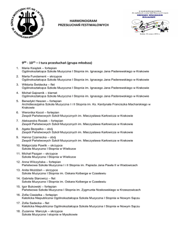 HARMONOGRAM PRZESŁUCHAŃ FESTIWALOWYCH 900 - 1015 – I tura przesłuchań (grupa młodsza) 1. Maria Książek – fortepian Ogólnokształcąca Szkoła Muzyczna I Stopnia im. Ignacego Jana Paderewskiego w Krakowie 2. Marta Fundament – skrzypce Ogólnokształcąca Szkoła Muzyczna I Stopnia im. Ignacego Jana Paderewskiego w Krakowie 3. Wiktoria Świdecka – flet Ogólnokształcąca Szkoła Muzyczna I Stopnia im. Ignacego Jana Paderewskiego w Krakowie 4. Michał Gajownik – klarnet Ogólnokształcąca Szkoła Muzyczna I Stopnia im. Ignacego Jana Paderewskiego w Krakowie 5. Benedykt Heszen – fortepian Archidiecezjalna Szkoła Muzyczna I i II Stopnia im. Ks. Kardynała Franciszka Macharskiego w Krakowie 6. Weronika Kocot – fortepian Zespół Państwowych Szkół Muzycznych im. Mieczysława Karłowicza w Krakowie 7. Aleksandra Rosiek – fortepian Zespół Państwowych Szkół Muzycznych im. Mieczysława Karłowicza w Krakowie 8. Agata Bezpalko – obój Zespół Państwowych Szkół Muzycznych im. Mieczysława Karłowicza w Krakowie 9. Hanna Czarnecka – obój Zespół Państwowych Szkół Muzycznych im. Mieczysława Karłowicza w Krakowie 10. Małgorzata Pawlik – skrzypce Szkoła Muzyczna I Stopnia w Wieliczce 11. Michał Pazgan – skrzypce Szkoła Muzyczna I Stopnia w Wieliczce 12. Anna Wilczyńska – fortepian Państwowa Szkoła Muzyczna I i II Stopnia im. Papieża Jana Pawła II w Wadowicach 13. Anita Możdżeń – skrzypce Szkoła Muzyczna I Stopnia im. Oskara Kolberga w Czasławiu 14. Gabriela Starowicz – flet Szkoła Muzyczna I Stopnia im. Oskara Kolberga w Czasławiu 15. Igor Bukowski – fortepian Państwowa Szkoła Muzyczna I Stopnia im. Zygmunta Noskowskiego w Krzeszowicach 16. Zofia Ciesielka – fortepian Katolicka Niepubliczna Ogólnokształcąca Szkoła Muzyczna I Stopnia w Nowym Sączu 17. Zofia Sadecka – flet Katolicka Niepubliczna Ogólnokształcąca Szkoła Muzyczna I Stopnia w Nowym Sączu 18. Zuzanna Marczyk – skrzypce Szkoła Muzyczna I stopnia w Myszkowie 19. Julia Maźniewska – skrzypce Szkoła Muzyczna I stopnia w Myszkowie 20. Aleksandra Talar – fortepian Szkoła Muzyczna I Stopnia w Łącku 21. Amelia Olszewska – fortepian Szkoła Muzyczna I Stopnia w Miliczu 22. Natalia Gąsior – fortepian Państwowa Szkoła Muzyczna I i II Stopnia im. Fryderyka Chopina w Nowym Sączu 23. Katarzyna Wojtyczka – fortepian Państwowa Szkoła Muzyczna I i II Stopnia im. Fryderyka Chopina w Nowym Targu 1045 - 1200 – II tura przesłuchań (grupa młodsza) 24. Milena Ptak – fortepian Szkoła Muzyczna I Stopnia Nr 1 im. Stanisława Wiechowicza w Krakowie 25. Karolina Kuśnierz – skrzypce Szkoła Muzyczna I Stopnia Nr 1 im. Stanisława Wiechowicza w Krakowie 26. Bruno Kopeć – trąbka Szkoła Muzyczna I Stopnia Nr 1 im. Stanisława Wiechowicza w Krakowie 27. Łucja Janoszka – fortepian Niepubliczna Szkoła Muzyczna I Stopnia w Piekarach Śląskich 28. Zuzanna Staroń – fortepian Niepubliczna Szkoła Muzyczna I Stopnia w Piekarach Śląskich 29. Wiktoria Domagała – fortepian Zespół Szkół Muzycznych im. Michała Spisaka w Dąbrowie Górniczej 30. Anna Gołuszka – fortepian Zespół Szkół Muzycznych im. Michała Spisaka w Dąbrowie Górniczej 31. Paulina Długosz – wiolonczela Zespół Państwowych Szkół Muzycznych im. Wojciecha Kilara w Katowicach 32. Aleksandra Ogryzek – wiolonczela Zespół Państwowych Szkół Muzycznych im. Wojciecha Kilara w Katowicach 33. Krzysztof Osiński – fortepian Niepubliczna Szkoła Muzyczna I Stopnia AKOLADA w Pruszkowie 34. Michalina Talaga – skrzypce Zespół Państwowych Szkół Muzycznych w Żorach 35. Natalia Kapuścińska – fortepian Zespół Szkół Muzycznych im. Czesława Niemena we Włocławku 36. Paweł Iwanowicz – skrzypce Ogólnokształcąca Szkoła Muzyczna I i II Stopnia im. Karola Szymanowskiego we Wrocławiu 37. Wiktoria Berak – fortepian Zespół Szkół Muzycznych im. Oskara Kolberga w Radomiu 38. Alicja Berak – fortepian Zespół Szkół Muzycznych im. Oskara Kolberga w Radomiu 39. Adam Styczyński – fortepian Zespół Szkół Muzycznych im. Oskara Kolberga w Radomiu 40. Franciszek Wolak – skrzypce Szkoła Muzyczna I Stopnia w Kalwarii Zebrzydowskiej 41. Łucja Dąbkowska – fortepian Państwowa Szkoła Muzyczna I i II Stopnia w Jastrzębiu-Zdroju 42. Wincenty Korecki – perkusja Państwowa Szkoła Muzyczna I Stopnia Nr 5 im. Henryka Wieniawskiego w Warszawie 43. Stanisław Borek – skrzypce Państwowa Szkoła Muzyczna I Stopnia nr 5 im. Henryka Wieniawskiego w Warszawie 44. Helena Anna Pabisiak – fortepian Państwowa Ogólnokształcąca Szkoła Muzyczna I Stopnia Nr 1 im. Emila Młynarskiego w Warszawie 45. Kacper Świtalski – akordeon Szkoła Muzyczna I Stopnia w Kańczudze 46. Artemii Stepanenko – fortepian Children's Art School №5 w Odessie 1230 - 1330 – III tura przesłuchań (grupa starsza) 47. Alicja Godula – skrzypce Szkoła Muzyczna I Stopnia Nr 1 im. Stanisława Wiechowicza w Krakowie 48. Oliwier Pazera – skrzypce Szkoła Muzyczna I Stopnia Nr 1 im. Stanisława Wiechowicza w Krakowie 49. Dorota Zdybał – flet Szkoła Muzyczna I Stopnia Nr 1 im. Stanisława Wiechowicza w Krakowie 50. Dominik Sudewicz – trąbka Szkoła Muzyczna I Stopnia Nr 1 im. Stanisława Wiechowicza w Krakowie 51. Kacper Kędzior – perkusja Szkoła Muzyczna I Stopnia Nr 1 im. Stanisława Wiechowicza w Krakowie 52. Julia Kaleta – fortepian Zespół Państwowych Szkół Muzycznych im. Mieczysława Karłowicza w Krakowie 53. Aleksandra Sieńko – fortepian Zespół Państwowych Szkół Muzycznych im. Mieczysława Karłowicza w Krakowie 54. Oliwia Batko – fortepian Zespół Państwowych Szkół Muzycznych im. Mieczysława Karłowicza w Krakowie 55. Weronika Mazoń – skrzypce Zespół Państwowych Szkół Muzycznych im. Mieczysława Karłowicza w Krakowie 56. Aleksandra Pałka - skrzypce Zespół Państwowych Szkół Muzycznych im. Mieczysława Karłowicza w Krak