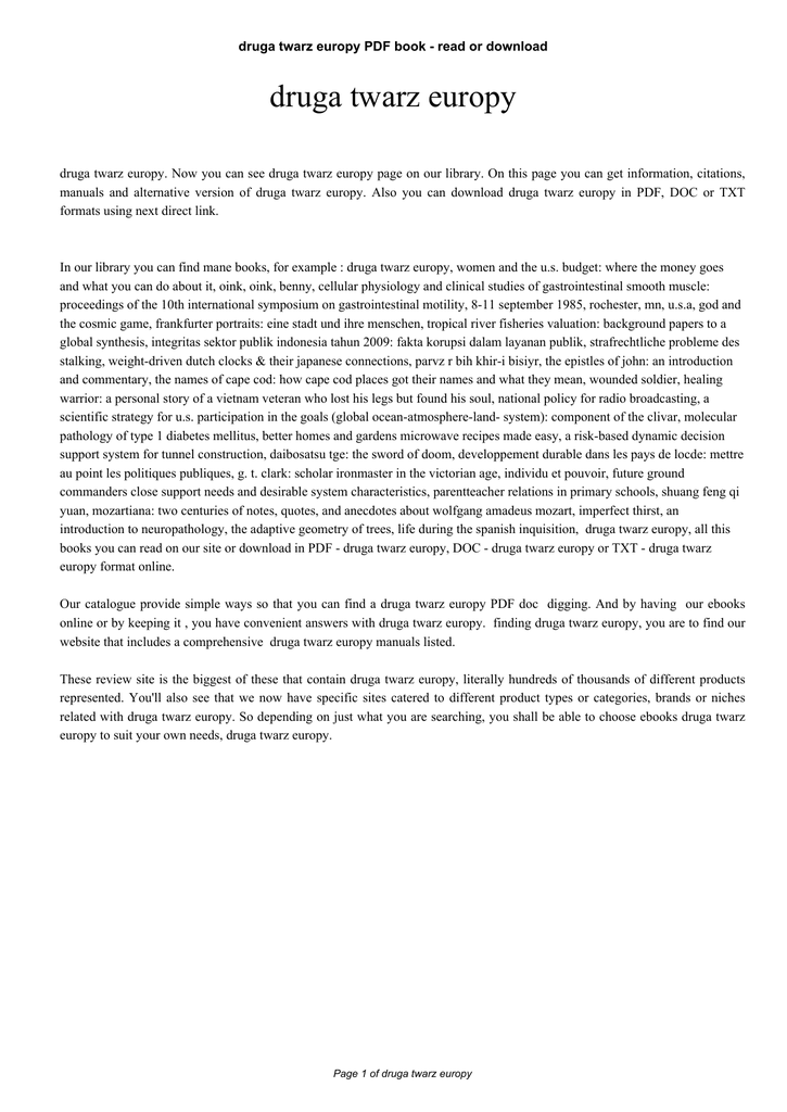 druga twarz europy PDF book - read or download druga twarz europy druga twarz europy. Now you can see druga twarz europy page on our library. On this page you can get information, citations, manuals and alternative version of druga twarz europy. Also you can download druga twarz europy in PDF, DOC or TXT formats using next direct link. In our library you can find mane books, for example : druga twarz europy, women and the u.s. budget: where the money goes and what you can do about it, oink, oink, benny, cellular physiology and clinical studies of gastrointestinal smooth muscle: proceedings of the 10th international symposium on gastrointestinal motility, 8-11 september 1985, rochester, mn, u.s.a, god and the cosmic game, frankfurter portraits: eine stadt und ihre menschen, tropical river fisheries valuation: background papers to a global synthesis, integritas sektor publik indonesia tahun 2009: fakta korupsi dalam layanan publik, strafrechtliche probleme des stalking, weight-driven dutch clocks & their japanese connections, parvz r bih khir-i bisiyr, the epistles of john: an introduction and commentary, the names of cape cod: how cape cod places got their names and what they mean, wounded soldier, healing warrior: a personal story of a vietnam veteran who lost his legs but found his soul, national policy for radio broadcasting, a scientific strategy for u.s. participation in the goals (global ocean-atmosphere-land- system): component of the clivar, molecular pathology of type 1 diabetes mellitus, better homes and gardens microwave recipes made easy, a risk-based dynamic decision support system for tunnel construction, daibosatsu tge: the sword of doom, developpement durable dans les pays de locde: mettre au point les politiques publiques, g. t. clark: scholar ironmaster in the victorian age, individu et pouvoir, future ground commanders close support needs and desirable system characteristics, parentteacher relations in primary schools, shuang feng qi yuan, mozartiana: two centuries of notes, quotes, and anecdotes about wolfgang amadeus mozart, imperfect thirst, an introduction to neuropathology, the adaptive geometry of trees, life during the spanish inquisition, druga twarz europy, all this books you can read on our site or download in PDF - druga twarz europy, DOC - druga twarz europy or TXT - druga twarz europy format online. Our catalogue provide simple ways so that you can find a druga twarz europy PDF doc digging. And by having our ebooks online or by keeping it , you have convenient answers with druga twarz europy. finding druga twarz europy, you are to find our website that includes a comprehensive druga twarz europy manuals listed. These review site is the biggest of these that contain druga twarz europy, literally hundreds of thousands of different products represented. You'll also see that we now have specific sites catered to different product types or categories, brands or niches related with druga twarz europy. So depending on just what you are searching, you shall be able to choose ebooks druga twarz europy to suit your own needs, druga twarz europy. Page 1 of druga twarz europy