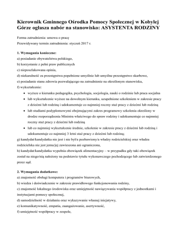 Kierownik Gminnego Ośrodka Pomocy Społecznej w Kobylej Górze ogłasza nabór na stanowisko: ASYSTENTA RODZINY Forma zatrudnienia: umowa o pracę Przewidywany termin zatrudnienia: styczeń 2017 r. 1. Wymagania konieczne: a) posiadanie obywatelstwa polskiego, b) korzystanie z pełni praw publicznych c) nieposzlakowana opinia, d) niekaralność za przestępstwa popełnione umyślnie lub umyślne przestępstwo skarbowe, e) posiadanie stanu zdrowia pozwalającego na zatrudnienie na określonym stanowisku, f) wykształcenie: wyższe o kierunku pedagogika, psychologia, socjologia, nauki o rodzinie lub praca socjalna lub wykształcenie wyższe na dowolnym kierunku, uzupełnione szkoleniem w zakresie pracy z dziećmi lub rodziną i udokumentuje co najmniej roczny staż pracy z dziećmi lub rodziną lub studiami podyplomowymi obejmującymi zakres programowy szkolenia określony w drodze rozporządzenia Ministra właściwego do spraw rodziny i udokumentuje co najmniej roczny staż pracy z dziećmi lub rodziną lub co najmniej wykształcenie średnie, szkolenie w zakresie pracy z dziećmi lub rodziną i udokumentuje co najmniej 3 letni staż pracy z dziećmi lub rodziną; g) kandydat/kandydatka nie jest i nie był/a pozbawiony/a władzy rodzicielskiej oraz władza rodzicielska nie jest jemu/jej zawieszona ani ograniczona, h) kandydat/kandydatka wypełnia obowiązek alimentacyjny – w przypadku gdy taki obowiązek został na niego/nią nałożony na podstawie tytułu wykonawczego pochodzącego lub zatwierdzonego przez sąd. 2. Wymagania dodatkowe: a) znajomość obsługi komputera i programów biurowych, b) wiedza i doświadczenie w zakresie prawidłowego funkcjonowania rodziny, c) znajomość lokalnego środowiska oraz umiejętność nawiązywania współpracy z jednostkami i instytucjami pomocy społecznej, d) samodzielność w działaniu oraz wykazywanie własnej inicjatywy, e) komunikatywność, empatia, zaangażowanie, asertywność, f) umiejętność współpracy w zespole, g) odporność na sytuacje stresowe, h) umiejętność zachowania bezstronności w kontakcie z rodziną i) prawo jazdy kat. „B” i posiadanie własnego środka transportu, j) znajomość przepisów ustawy z dnia 12 marca 2004 r. o pomocy społecznej i innych aktów normatywnych związanych z pomocą społeczną. 3. Preferowane cechy osobowościowe kandydatów: a) empatia b) komunikatywność c) odpowiedzialność d) kreatywność e) obowiązkowość f) rzetelność g) zaangażowanie i odporność na stres h) zdolności organizacyjne 4. Zakres wykonywanych zadań na stanowisku: Do głównego obowiązku asystenta rodziny należeć będzie wsparcie i aktywizacja rodzin zagrożonych wykluczeniem społecznym oraz kierowanie procesem zmiany postaw życiowych członków rodziny. Asystent rodziny odpowiedzialny będzie za systematyczną indywidualną pracę z rodzinami wskazanymi przez Ośrodek, udzielanie im kompleksowej pomocy i wsparcia w wypełnianiu swoich zadań. W tym celu asystent rodziny m.in. będzie: - współpracował z instytucjami takimi jak szkoła, przedszkole, sąd, urząd pracy, urząd miasta, itp., - pomagał w wypełnianiu zadań opiekuńczo - wychowawczych, - pomagał i uczył oszczędnego zarządzania budżetem domowym, - merytorycznie pomagał w prowadzeniu gospodarstwa domowego, - pomagał w rozwiązywaniu podstawowych problemów socjalnych rodziny, wspierał jej aktywność społeczną, - motywował do podnoszenia kwalifikacji zawodowych przez poszczególnych członków rodziny. Asystent rodziny świadczyć będzie usługi w miejscu zamieszkania rodziny między godziną 800 a 2100, może również towarzyszyć rodzinie poza miejscem zamieszkania między godz. 800 a 2100 w dni robocze oraz w dni wolne od pracy, również w weekendy w wymiarze nieprzekraczającym 40 godzin tygodniowo – zgodnie z harmonogramem usług ustalonym wspólnie z pracownikiem socjalnym w porozumieniu z rodziną. 5. Wymagane dokumenty: a) CV ze zdjęciem, b) List motywacyjny ! List motywacyjny i CV należy opatrzyć klauzulą: “Oświadczam, że wyrażam zgodę na przetwarzanie moich danych osobowych zawartych w ofercie pracy dla potrzeb niezbędnych do realizacji procesu rekrutacji zgodnie z ustawą z dnia 29 sierpnia 1997 roku o ochronie danych osobowych ( Dz. U. z 1997 roku Nr 133, poz.833 z późn. zm.)”. c) Kopie dokumentów potwierdzających wykształcenie, d) kopie dokumentów poświadczających posiadanie kwalifikacji zawodowych (certyfikaty, uprawnienia, zaświadczenia o ukończeniu kursów i szkoleń, dyplomy), e) Kopie świadectw pracy, ewentualnie referencje z zakładów pracy, f) oświadczenie o stanie zdrowia pozwalającym na zatrudnienie na danym stanowisku (w przypadku zatrudnienia kandydat zostanie skierowany na badania lekarskie wstępne do wskazanego lekarza medycyny pracy), g) oświadczenie kandydata o korzystaniu z pełni praw publicznych, h) oświadczenie o niekaralności za przestępstwo popełnione umyślnie (w przypadku zatrudnienia kandydat zostanie zobowiązany do dostarczenia zaświadczenia z Krajowego Rejestru Karnego), i) kopia dowodu osobistego, j) inne dokumenty potwierdzające zdobytą wiedzę, umiejętności i kwalifikacje. Uwaga! W przypadku zatrudnienia kandydat zobowiązany będzie do przedłożenia do wglądu pracodawcy oryginały ww. dokumentów. 6. Postępowanie rekrutacyjne: Nabór zostanie przeprowadzony w dwóch etapach postępowania rekrutacyjnego: Etap I. Weryfikacja ofert pod względem formalnym oraz dokonanie wstępnej oceny merytorycznej, Etap II. Rozmowa kwalifikacyjna z wybranymi kandydatami w siedzibie Gminnego Ośrodka Pomocy Społecznej w Kobylej Górze, przy ul. Świerczewskiego 1 i dokonanie wyboru pracownika na jej podstawie. 7. Termin i sposób składania ofert: Dokumenty (w zamkniętej kopercie) należy składać osobiście w siedzibie Gminnego Ośrodka Pomocy Społecznej w Kobylej Górze lub pocztą na adres: Gminny Ośrodek Pomocy Społecznej ul. Świerczewskiego 1 