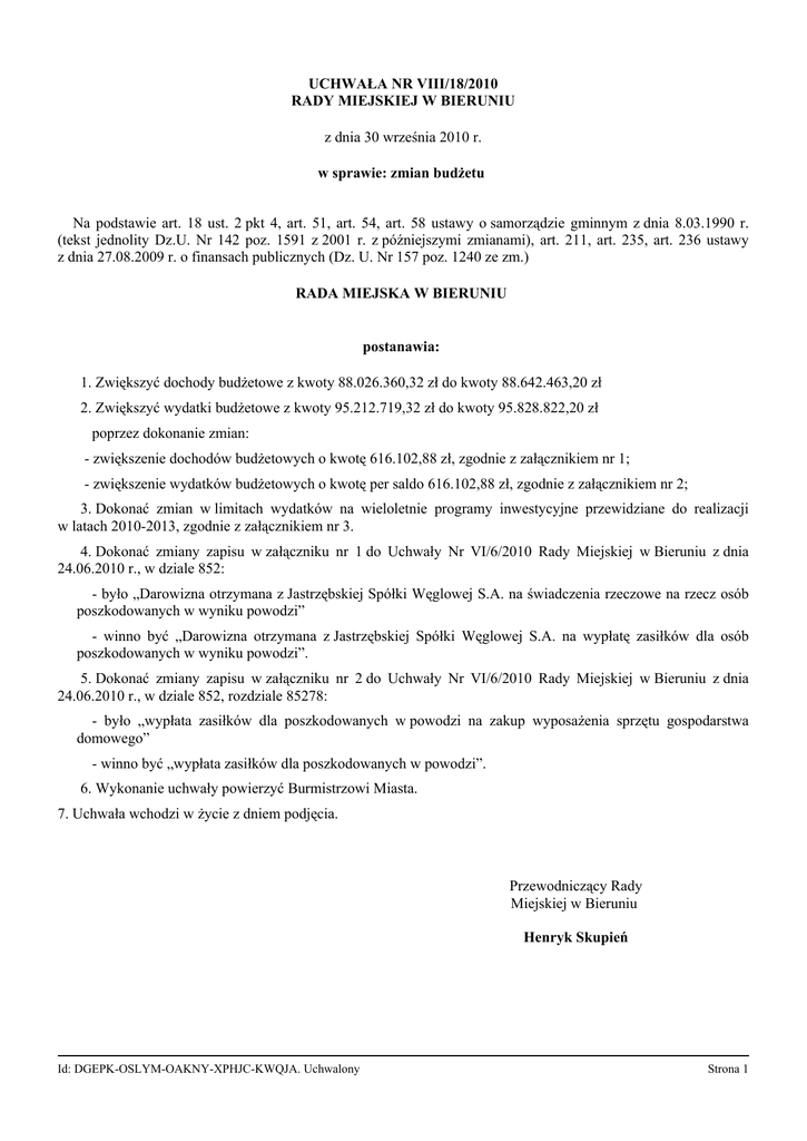 UCHWAŁA NR VIII/18/2010 RADY MIEJSKIEJ W BIERUNIU z dnia 30 września 2010 r. w sprawie: zmian budżetu Na podstawie art. 18 ust. 2 pkt 4, art. 51, art. 54, art. 58 ustawy o samorządzie gminnym z dnia 8.03.1990 r. (tekst jednolity Dz.U. Nr 142 poz. 1591 z 2001 r. z późniejszymi zmianami), art. 211, art. 235, art. 236 ustawy z dnia 27.08.2009 r. o finansach publicznych (Dz. U. Nr 157 poz. 1240 ze zm.) RADA MIEJSKA W BIERUNIU postanawia: 1. Zwiększyć dochody budżetowe z kwoty 88.026.360,32 zł do kwoty 88.642.463,20 zł 2. Zwiększyć wydatki budżetowe z kwoty 95.212.719,32 zł do kwoty 95.828.822,20 zł poprzez dokonanie zmian: - zwiększenie dochodów budżetowych o kwotę 616.102,88 zł, zgodnie z załącznikiem nr 1; - zwiększenie wydatków budżetowych o kwotę per saldo 616.102,88 zł, zgodnie z załącznikiem nr 2; 3. Dokonać zmian w limitach wydatków na wieloletnie programy inwestycyjne przewidziane do realizacji w latach 2010-2013, zgodnie z załącznikiem nr 3. 4. Dokonać zmiany zapisu w załączniku nr 1 do Uchwały Nr VI/6/2010 Rady Miejskiej w Bieruniu z dnia 24.06.2010 r., w dziale 852: - było „Darowizna otrzymana z Jastrzębskiej Spółki Węglowej S.A. na świadczenia rzeczowe na rzecz osób poszkodowanych w wyniku powodzi” - winno być „Darowizna otrzymana z Jastrzębskiej Spółki Węglowej S.A. na wypłatę zasiłków dla osób poszkodowanych w wyniku powodzi”. 5. Dokonać zmiany zapisu w załączniku nr 2 do Uchwały Nr VI/6/2010 Rady Miejskiej w Bieruniu z dnia 24.06.2010 r., w dziale 852, rozdziale 85278: - było „wypłata zasiłków dla poszkodowanych w powodzi na zakup wyposażenia sprzętu gospodarstwa domowego” - winno być „wypłata zasiłków dla poszkodowanych w powodzi”. 6. Wykonanie uchwały powierzyć Burmistrzowi Miasta. 7. Uchwała wchodzi w życie z dniem podjęcia. Przewodniczący Rady Miejskiej w Bieruniu Henryk Skupień Id: DGEPK-OSLYM-OAKNY-XPHJC-KWQJA. Uchwalony Strona 1 Załącznik Nr 1 do Uchwały Nr VIII/18/2010 Rady Miejskiej w Bieruniu z dnia 30.09.2010 r. Dział Wyszczególnienie Zwiększenie dochodów 1 2 3 600 TRANSPORT I ŁĄCZNOŚĆ Dochody majątkowe Bezzwrotna pomoc finansowa udzielona przez Agencję Nieruchomości Rolnych z przeznaczeniem na budowę ul. Nasypowej 700 GOSPODARKA MIESZKANIOWA 300 000,00 300 000,00 300 000,00 4 000,00 Dochody bieżące 4 000,00 Odszkodowanie z tytułu zalania budynku przy ul. Wawelskiej 35 4 000,00 750 ADMINISTRACJA PUBLICZNA 139 048,88 Dochody bieżące Darowizna otrzymana od firm i osób fizycznych z przeznaczeniem na pomoc poszkodowanym w powodzi 139 048,88 Darowizna otrzymana od partnerskiego miasta Gundelfingen Darowizna otrzymana od firmy Control Johnson z przeznaczeniem na pomoc poszkodowanym w powodzi 58 138,50 Dofinansowanie otrzymane z Polsko-Niemieckiej Współpracy Młodzieży na pokrycie kosztów wyjazdu dzieci powodzian do Niemiec Darowizna otrzymana od Towarzystwa Edukacji Finansowej na zakup materiałów budowlanych oraz sprzętu gospodarstwa domowego 758 RÓŻNE ROZLICZENIA Dochody bieżące Środki rezerwy części oświatowej subwencji ogólnej dla jednostek samorządu terytorialnego - zgodnie z pismem Ministra Finansów ST5/4822/11g/BKU/10 i ST5/4822/13g/BKU/10 801 OŚWIATA I WYCHOWANIE Dochody bieżące Odszkodowanie z tytułu zalania budynku Gimnazjum Nr 2 OGÓŁEM 21 410,01 3 000,37 16 500,00 40 000,00 163 322,00 163 322,00 163 322,00 9 732,00 9 732,00 9 732,00 616 102,88 Załącznik Nr 2 do Uchwały Nr VIII/18/2010 Rady Miejskiej w Bieruniu z dnia 30.09.2010 r. Dział Rozdział 1 Wyszczególnienie Zmniejszenie wydatków Zwiększenie wydatków 3 4 5 2 010 01095 600 60016 ROLNICTWO I ŁOWIECTWO 27 300,00 Pozostała działalność 27 300,00 Wydatki bieżące - nagrody - wynagrodzenia bezosobowe - zakup materiałów - zakup usług TRANSPORT I ŁĄCZNOŚĆ Drogi publiczne gminne Wydatki majątkowe 27 300,00 3 500,00 4 400,00 3 700,00 15 700,00 300 000,00 300 000,00 300 000,00 -"Budowa ul. Nasypowej w Bieruniu Nowym wraz z przebudową skrzyżowania ul. Warszawskiej z ul. Solecką i ul. Nasypową" 700 70095 750 75075 754 75478 758 75818 801 80101 300 000,00 GOSPODARKA MIESZKANIOWA 4 000,00 Pozostała działalność Wydatki bieżące - remont pomieszczeń w budynku przy ul. Wawelskiej 35 4 000,00 4 000,00 4 000,00 9 300,00 9 300,00 9 300,00 ADMINISTRACJA PUBLICZNA Promocja jednostek samorządu terytorialnego Wydatki bieżące - wydatki związane z wizytą delegacji miasta partnerskiego Meung sur Loire BEZPIECZEŃSTWO PUBLICZNE I OCHRONA PRZECIWPOŻAROWA 58 138,50 Usuwanie skutków klęsk żywiołowych 58 138,50 Wydatki bieżące - usuwanie skutków powodzi RÓŻNE ROZLICZENIA 58 138,50 58 138,50 16 500,00 Rezerwy ogólne i celowe 16 500,00 Wydatki bieżące - rezerwy 16 500,00 16 500,00 9 300,00 OŚWIATA I WYCHOWANIE 89 218,00 182 272,00 Szkoły podstawowe 81 340,00 147 700,00 Wydatki bieżące 80 000,00 20 000,00 - malowanie pomieszczeń szkolnych oraz basenu w SP 3 - zakup energii Wydatki majątkowe - "Zakup obieraczki do ziemniaków, zmywarki do naczyń i patelni elektrycznej SP3 - "Budowa dwóch placów zabaw przy szkołach podstawowych w ramach programu Radosna szkoła" - wkład własny 80104 20 000,00 80 000,00 1 340,00 127 700,00 1 340,00 127 700,00 Przedszkola 23 500,00 Wydatki majątkowe - "Modernizacja kotłowni wraz z wymianą kotła w Przedszkolu Nr 2a" 23 500,00 23 500,00 1 3 2 80110 80114 80148 4 5 Gimnazja 9 732,00 Wydatki bieżące - remont budynku w Gimnazjum Nr 2 9 732,00 9 732,00 Zespoły obsługi ekonomiczno-administracyjne szkół 7 878,00 Wydatki bieżące - dodatkowe wynagrodzenie roczne i pochodne 7 878,00 7 878,00 Stołówki szkolne 1 340,00 Wydatki bieżące - doposażenie stołówki szkolnej w SP3 852 85278 900 90013 926 92601 POMOC SPOŁECZNA - BUDŻET GMINY 1 340,00 1 340,00 64 410,38 Usuwanie skutków klęsk żywiołowych 64 410,38 Wydatki bieżące - wypłata zasiłków dla poszkodowanych na usuwanie skutków powodzi 64 410,38 - wyp