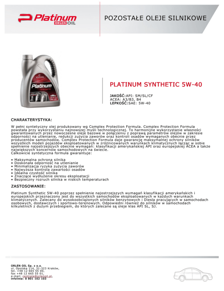 POZOSTAŁE OLEJE SILNIKOWE PLATINUM SYNTHETIC 5W40 JAKOŚĆ: JAKOŚĆ:API: SM/SL/CF ACEA: A3/B3, B4 LEPKOŚĆ: LEPKOŚĆ:SAE: 5W40 CHARAKTERYSTYKA: W pełni syntetyczny olej produkowany wg Complex Protection Formula. Complex Protection Formula powstała przy wykorzystaniu najnowszej myśli technologicznej. To harmonijne wykorzystanie własności gwarantowanych przez nowoczesne oleje bazowe w połączeniu z poprawą parametrów olejów w zakresie odporności na utlenianie, redukcji zużycia zaworów oraz kontroli osadów wymaganych obecnie przez producentów samochodów. Complex Protection Formula daje gwarancję maksymalnej ochrony silników wszystkich modeli pojazdów eksploatowanych w zróżnicowanych warunkach klimatycznych łącząc w sobie spełnienie najostrzejszych obecnie wymagań: klasyfikacji amerykańskiej API oraz europejskiej ACEA a także największych koncernów samochodowych na świecie. Całkowicie syntetyczna formuła gwarantuje: • Maksymalna ochrona silnika • Doskonała odporność na utlenianie • Minimalizacja ryzyka zużycia zaworów • Najwyższa kontrola zawartości osadów • Idealna czystość silnika • Znaczące wydłużenie okresu eksploatacji • Bezpieczny rozruch silnika w niskich temperaturach ZASTOSOWANIE: Platinum Synthetic 5W40 poprzez spełnienie najostrzejszych wymagań klasyfikacji amerykańskich i europejskich przeznaczony jest do wszystkich samochodów eksploatowanych w każdych warunkach klimatycznych. Zalecany do wysokoobciążonych silników benzynowych i Diesla pracujących w samochodach osobowych, dostawczych i sportowoterenowych. Odpowiedni również do silników w samochodach kilkuletnich z dużym przebiegiem, do których zalecane są oleje klas API SL, SJ. ORLEN OIL Sp. z o.o. ul. Opolska 114, 31323 Kraków, tel. +48 12 665 55 00, fax +48 12 665 55 01, email: [email protected], infolinia: 0 801 102 103 POZOSTAŁE OLEJE SILNIKOWE NORMY, APROBATY, SPECYFIKACJE: Spełnia wymagania: MercedesBenz 229.3 VW 502 00/ 505 00 Opel, Porsche PARAMETRY klasa lepkości SAE JEDNOSTKI WARTOŚCI TYPOWE 5W40 lepkość kinematyczna w temp. 100 0 C mm 2 /s 14,10 lepkość HTHS w 150 0 C MPaˇs 4,0 169 wskaźnik lepkości temperatura płynięcia 0C 42 temperatura zapłonu 0C 235 liczba zasadowa TBN mg KOH/g 10,0 % 1,20 % (m/m) 10,1 popiół siarczanowy Odparowalność wg Noack'a UWAGA: Powyższe wartości parametrów fizykochemicznych są wartościami typowymi. Wartości rzeczywiste są umieszczane na świadectwach jakości dołączanych do każdej partii produktu. ORLEN OIL Sp. z o.o. ul. Opolska 114, 31323 Kraków, tel. +48 12 665 55 00, fax +48 12 665 55 01, email: [email protected], infolinia: 0 801 102 103