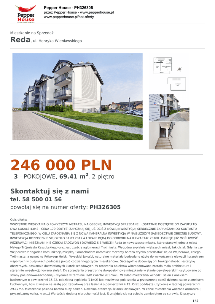 Pepper House - PH326305 przez Pepper House - www.pepperhouse.pl www.pepperhouse.pl/hot-oferty Mieszkanie na Sprzedaż Reda, ul. Henryka Wieniawskiego 246 000 PLN 3 - POKOJOWE, 69.41 m2, 2 piętro Skontaktuj się z nami tel. 58 500 01 56 powołaj się na numer oferty: PH326305 Opis oferty: WSZYSTKIE MIESZKANIA O POWYŻSZYM METRAŻU NA OBECNEJ INWESTYCJI SPRZEDANE ! (OSTATNIE DOSTĘPNE DO ZAKUPU TO DWA LOKALE 43M2 - CENA 179,000TYS) ZAPOZNAJ SIĘ JUŻ DZIŚ Z NOWĄ INWESTYCJĄ: SERDECZNIE ZAPRASZAM DO KONTAKTU TELEFONICZNEGO, W CELU ZAPOZNANIA SIĘ Z NOWA KAMERALNĄ INWESTYCJĄ W NAJBLIZSZYM SĄSIEDZCTWIE OBECNEJ BUDOWY. INWESTYCJA ROZPOCZNIE SIĘ OKOŁO 01.03.2017 A LOKALE BĘDĄ DO ODBIORU NA II KWARTAŁ 2018R. ISTNIEJE JUŻ MOŻLIWOŚĆ REZERWACJI MIESZKAŃ! NIE CZEKAJ ZADZWOŃ I DOWIEDZ SIĘ WIĘCEJ! Reda to nowoczesne miasto, które stanowi jedno z miast Małego Trójmiasta Kaszubskiego oraz jest częścią aglomeracji Trójmiasta. Wygodna sypialnia większych miast, takich jak Gdynia czy Wejherowo z dogodna komunikacją miejską. Samochodem natomiast możemy bardzo szybko przedostać się do Wejherowa, całego Trójmiasta, a nawet na Półwysep Helski. Wysokiej jakości, naturalne materiały budowlane użyte do wykończenia elewacji i przestrzeni wspólnych w budynkach podnoszą jakość codziennego życia mieszkańców. Szczególnie doceniają oni funkcjonalność i estetykę obszernych, doskonale doświetlonych klatek schodowych. W otoczeniu obiektów wkomponowana została mała architektura i starannie wyselekcjonowana zieleń. Do sprzedania przestronne dwupoziomowe mieszkanie w stanie deweloperskim usytuowane od strony południowo-zachodniej - wydanie w terminie III/IV kwartał 2017roku. W skład mieszkania wchodzi: salon z aneksem kuchennym o powierzchni 15,22, oddzielna sypialnia (11m2) lub mozliwosc polaczenia w przestronną cześć dzienna salon z aneksem kuchennym, holu z wnęka na szafę pod zabudowę oraz łazienki o powierzchni 4,12. Oraz poddasza użytkowe o łącznej powierzchni 29,17m2. Mieszkanie posiada bardzo duży balkon. Dowolna aranżacja ścianek działowych. W cenie mieszkania wliczona armatura ( prysznic,umywalka, kran...) Wartością dodaną nieruchomości jest, iż znajduję się na osiedlu zamkniętym co sprawia, iż przyszły 1/2 Pepper House - PH326305 przez Pepper House - www.pepperhouse.pl www.pepperhouse.pl/hot-oferty właściciel może czuć się bezpiecznie i korzystać z uroków przepięknej lokalizacji. Właśnie goszcząca cisza w usytuowaniu mieszkania jest dodatkowym atutem tej nieruchomości, mimo iż lokal znajduje się zaledwie parę kilometrów od centrum miasta, donośny zgiełk ulicy, czy hałas nie będzie niepokoić nowych właścicieli. Możesz korzystać do woli z luksusu przestrzeni terenów zielonych oraz osiedla, na którym Twoje dziecko bez obaw może spędzać bezpiecznie swój beztroski czas Na etapie budowy istnieje dowolna aranżacja ścianek działowych wliczona w cenę mieszkania. Dodatkowo w cenie lokalu jest komórka lokatorska oraz miejsce postojowe ogólnodostępne. Możliwość dokupienia garażu około 17,000zł/20,000zł. Pozostałe oferty z tego budynku: http://www.pepperhouse.pl/wyszukiwarka/ogloszenie/oferta/6582-sprzedaz-2-pokoje-reda http://www.pepperhouse.pl/wyszukiwarka/ogloszenie/oferta/6579-sprzedaz-3-pokoje-reda http://www.pepperhouse.pl/wyszukiwarka/ogloszenie/oferta/6584-sprzedaz-3-pokoje-reda ZAPRASZAM DO KONTAKTU: MICHAŁ GRZEŚKOWIAK NUMER OFERTY: PH855453 Tylko u nas GWARANCJA najniższej ceny dzięki: - okazyjnej cenie nieruchomości usługom finansowym Pepper House - preferencyjnej stawce u Notariusza Tylko u nas GWARANCJA bezpieczeństwa dzięki: - obsłudze prawnej Kancelarii Koprowski Gąsior Gierzyńska Ludwichowska - nadzorowi licencjonowanego Pośrednika (nr licencji 6884) - polisie OC Pośrednika na kwotę 1 000 000 PLN w PZU SA - ubezpieczeniu kupowanej nieruchomości (szczegóły na naszej stronie). Więcej zdjęć, zdjęcia w dużym formacie, rzuty, filmy i dodatkowe informacje: www.pepperhouse.pl Wejdź już dziś i wyślij zapytanie bezpośrednio do opiekuna oferty. 2/2 Powered by TCPDF (www.tcpdf.org)