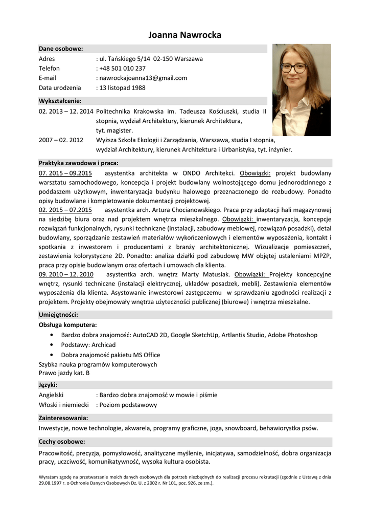 Joanna Nawrocka Dane osobowe: Adres Telefon E-mail Data urodzenia : ul. Tańskiego 5/14 02-150 Warszawa : +48 501 010 237 : [email protected] : 13 listopad 1988 Wykształcenie: 02. 2013 – 12. 2014 Politechnika Krakowska im. Tadeusza Kościuszki, studia II stopnia, wydział Architektury, kierunek Architektura, tyt. magister. 2007 – 02. 2012 Wyższa Szkoła Ekologii i Zarządzania, Warszawa, studia I stopnia, wydział Architektury, kierunek Architektura i Urbanistyka, tyt. inżynier. Praktyka zawodowa i praca: 07. 2015 – 09.2015 asystentka architekta w ONDO Architekci. Obowiązki: projekt budowlany warsztatu samochodowego, koncepcja i projekt budowlany wolnostojącego domu jednorodzinnego z poddaszem użytkowym, inwentaryzacja budynku halowego przeznaczonego do rozbudowy. Ponadto opisy budowlane i kompletowanie dokumentacji projektowej. 02. 2015 – 07.2015 asystentka arch. Artura Chocianowskiego. Praca przy adaptacji hali magazynowej na siedzibę biura oraz nad projektem wnętrza mieszkalnego. Obowiązki: inwentaryzacja, koncepcje rozwiązań funkcjonalnych, rysunki techniczne (instalacji, zabudowy meblowej, rozwiązań posadzki), detal budowlany, sporządzanie zestawień materiałów wykończeniowych i elementów wyposażenia, kontakt i spotkania z inwestorem i producentami z branży architektonicznej. Wizualizacje pomieszczeń, zestawienia kolorystyczne 2D. Ponadto: analiza działki pod zabudowę MW objętej ustaleniami MPZP, praca przy opisie budowlanym oraz ofertach i umowach dla klienta. 09. 2010 – 12. 2010 asystentka arch. wnętrz Marty Matusiak. Obowiązki: Projekty koncepcyjne wnętrz, rysunki techniczne (instalacji elektrycznej, układów posadzek, mebli). Zestawienia elementów wyposażenia dla klienta. Asystowanie inwestorowi zastępczemu w sprawdzaniu zgodności realizacji z projektem. Projekty obejmowały wnętrza użyteczności publicznej (biurowe) i wnętrza mieszkalne. Umiejętności: Obsługa komputera: • Bardzo dobra znajomość: AutoCAD 2D, Google SketchUp, Artlantis Studio, Adobe Photoshop • Podstawy: Archicad • Dobra znajomość pakietu MS Office Szybka nauka programów komputerowych Prawo jazdy kat. B Języki: Angielski Włoski i niemiecki : Bardzo dobra znajomość w mowie i piśmie : Poziom podstawowy Zainteresowania: Inwestycje, nowe technologie, akwarela, programy graficzne, joga, snowboard, behawiorystka psów. Cechy osobowe: Pracowitość, precyzja, pomysłowość, analityczne myślenie, inicjatywa, samodzielność, dobra organizacja pracy, uczciwość, komunikatywność, wysoka kultura osobista. Wyrażam zgodę na przetwarzanie moich danych osobowych dla potrzeb niezbędnych do realizacji procesu rekrutacji (zgodnie z Ustawą z dnia 29.08.1997 r. o Ochronie Danych Osobowych Dz. U. z 2002 r. Nr 101, poz. 926, ze zm.).