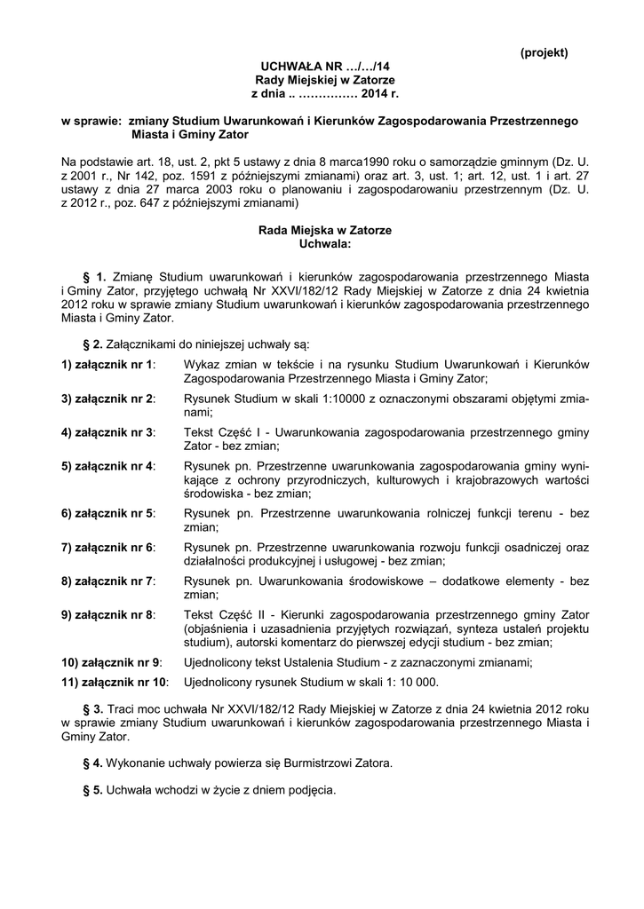 (projekt) UCHWAŁA NR …/…/14 Rady Miejskiej w Zatorze z dnia .. …………… 2014 r. w sprawie: zmiany Studium Uwarunkowań i Kierunków Zagospodarowania Przestrzennego Miasta i Gminy Zator Na podstawie art. 18, ust. 2, pkt 5 ustawy z dnia 8 marca1990 roku o samorządzie gminnym (Dz. U. z 2001 r., Nr 142, poz. 1591 z późniejszymi zmianami) oraz art. 3, ust. 1; art. 12, ust. 1 i art. 27 ustawy z dnia 27 marca 2003 roku o planowaniu i zagospodarowaniu przestrzennym (Dz. U. z 2012 r., poz. 647 z późniejszymi zmianami) Rada Miejska w Zatorze Uchwala: § 1. Zmianę Studium uwarunkowań i kierunków zagospodarowania przestrzennego Miasta i Gminy Zator, przyjętego uchwałą Nr XXVI/182/12 Rady Miejskiej w Zatorze z dnia 24 kwietnia 2012 roku w sprawie zmiany Studium uwarunkowań i kierunków zagospodarowania przestrzennego Miasta i Gminy Zator. § 2. Załącznikami do niniejszej uchwały są: 1) załącznik nr 1: Wykaz zmian w tekście i na rysunku Studium Uwarunkowań i Kierunków Zagospodarowania Przestrzennego Miasta i Gminy Zator; 3) załącznik nr 2: Rysunek Studium w skali 1:10000 z oznaczonymi obszarami objętymi zmianami; 4) załącznik nr 3: Tekst Część I - Uwarunkowania zagospodarowania przestrzennego gminy Zator - bez zmian; 5) załącznik nr 4: Rysunek pn. Przestrzenne uwarunkowania zagospodarowania gminy wynikające z ochrony przyrodniczych, kulturowych i krajobrazowych wartości środowiska - bez zmian; 6) załącznik nr 5: Rysunek pn. Przestrzenne uwarunkowania rolniczej funkcji terenu - bez zmian; 7) załącznik nr 6: Rysunek pn. Przestrzenne uwarunkowania rozwoju funkcji osadniczej oraz działalności produkcyjnej i usługowej - bez zmian; 8) załącznik nr 7: Rysunek pn. Uwarunkowania środowiskowe – dodatkowe elementy - bez zmian; 9) załącznik nr 8: Tekst Część II - Kierunki zagospodarowania przestrzennego gminy Zator (objaśnienia i uzasadnienia przyjętych rozwiązań, synteza ustaleń projektu studium), autorski komentarz do pierwszej edycji studium - bez zmian; 10) załącznik nr 9: Ujednolicony tekst Ustalenia Studium - z zaznaczonymi zmianami; 11) załącznik nr 10: Ujednolicony rysunek Studium w skali 1: 10 000. § 3. Traci moc uchwała Nr XXVI/182/12 Rady Miejskiej w Zatorze z dnia 24 kwietnia 2012 roku w sprawie zmiany Studium uwarunkowań i kierunków zagospodarowania przestrzennego Miasta i Gminy Zator. § 4. Wykonanie uchwały powierza się Burmistrzowi Zatora. § 5. Uchwała wchodzi w życie z dniem podjęcia.