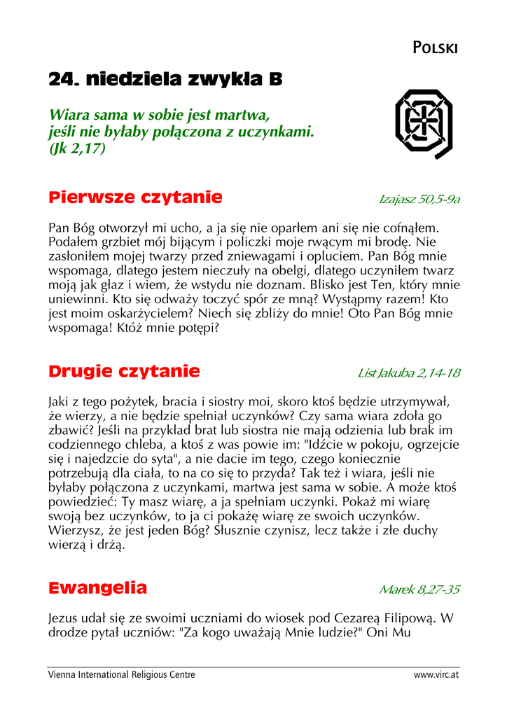 Polski Wiara sama w sobie jest martwa, jeśli nie byłaby połączona z uczynkami. (Jk 2,17) Pan Bóg otworzył mi ucho, a ja się nie oparłem ani się nie cofnąłem. Podałem grzbiet mój bijącym i policzki moje rwącym mi brodę. Nie zasłoniłem mojej twarzy przed zniewagami i opluciem. Pan Bóg mnie wspomaga, dlatego jestem nieczuły na obelgi, dlatego uczyniłem twarz moją jak głaz i wiem, że wstydu nie doznam. Blisko jest Ten, który mnie uniewinni. Kto się odważy toczyć spór ze mną? Wystąpmy razem! Kto jest moim oskarżycielem? Niech się zbliży do mnie! Oto Pan Bóg mnie wspomaga! Któż mnie potępi? Jaki z tego pożytek, bracia i siostry moi, skoro ktoś będzie utrzymywał, że wierzy, a nie będzie spełniał uczynków? Czy sama wiara zdoła go zbawić? Jeśli na przykład brat lub siostra nie mają odzienia lub brak im codziennego chleba, a ktoś z was powie im: "Idźcie w pokoju, ogrzejcie się i najedzcie do syta", a nie dacie im tego, czego koniecznie potrzebują dla ciała, to na co się to przyda? Tak też i wiara, jeśli nie byłaby połączona z uczynkami, martwa jest sama w sobie. A może ktoś powiedzieć: Ty masz wiarę, a ja spełniam uczynki. Pokaż mi wiarę swoją bez uczynków, to ja ci pokażę wiarę ze swoich uczynków. Wierzysz, że jest jeden Bóg? Słusznie czynisz, lecz także i złe duchy wierzą i drżą. Jezus udał się ze swoimi uczniami do wiosek pod Cezareą Filipową. W drodze pytał uczniów: "Za kogo uważają Mnie ludzie?" Oni Mu Vienna International Religious Centre www.virc.at odpowiedzieli: "Za Jana Chrzciciela, inni za Eliasza, jeszcze inni za jednego z proroków". On ich zapytał: "A wy za kogo Mnie uważacie?" Odpowiedział Mu Piotr: "Ty jesteś Mesjaszem". Wtedy surowo im przykazał, żeby nikomu o Nim nie mówili. I zaczął ich pouczać, że Syn Człowieczy musi wiele cierpieć, że będzie odrzucony przez starszych, arcykapłanów i uczonych w Piśmie; że będzie zabity, ale po trzech dniach zmartwychwstanie. A mówił zupełnie otwarcie te słowa. Wtedy Piotr wziął Go na bok i zaczął Go upominać. Lecz On obrócił się i patrząc na swych uczniów, zgromił Piotra słowami: "Zejdź Mi z oczu, szatanie, bo nie myślisz o tym, co Boże, ale o tym, co ludzkie". Potem przywołał do siebie tłum razem ze swoimi uczniami i rzekł im: "Jeśli kto chce pójść za Mną, niech się zaprze samego siebie, niech weźmie krzyż swój i niech Mnie naśladuje. Bo kto chce zachować swoje życie, straci je; a kto straci swe życie z powodu Mnie i Ewangelii, ten je zachowa". Czytania z Pisma świętego stawiają dzisiaj w centrum uwagi kilka kwestii, które dotykają istoty chrześcijańskiej egzystencji: kim jest Jezus Chrystus? Jak powinniśmy wierzyć w Niego i w Jego Ojca? Czego domaga się wiara od nas, gdy chcemy być chrześcijanami? Przed tymi pytaniami staje każdy – od czasów ziemskiego życia Jezusa – na nowo i ciągle w sposób aktualny? Odpowiedzi są tak różnorodne, jak same pytania. Kim jest Jezus? – Syn cieśli. Uwodziciel. Rewolucjonista. Opętany. Prorok. Mesjasz. Owszem Mesjasz, ale żaden polityczny wyzwoliciel i zbawca. Nie można Go wcisnąć w żadną ideologię wymyśloną przez człowieka. Jego droga prowadzi na krzyż, a poprzez krzyż do zmartwychwstania. Patrząc powierzchownie istnieje wiele (błędnych) możliwości oceniania Jezusa. Widzenie Jezusa jako supergwiazdy, podobnego do Gandhiego, Martina Luthera Kinga lub nawet marksisty jest poniekąd właściwe dla Jemu ówczesnych i niewiele wnosi nowego dla nas. Dzięki temu mamy jedynie pewną sumę poznania Jezusa i zewnętrznej o Nim wiedzy. To wiedza o tym, co się o Jezusie mówi, a nie osobiste opowiedzenie się za Nim. Aby pozwolić się ogarnąć przez Niego i Jego doświadczyć, trzeba postawić siebie wobec pytania stawianego przez Niego: "Kim jestem dla ciebie?" Tylko ten, kto jest z Nim wewnętrznie związany może "wiedzieć" kim jest Jezus, kim jest Ojciec. On także wie, że jednocześnie chodzi o dzieła wiary, które muszą następować po opowiedzeniu się za Jezusem i Jego słowem. Samo słowo, które nie przyjmuje formy w spotkaniu z ludźmi, w służbie tym, którzy potrzebują pomocy, jest słowem martwym. Jezusowym motywem przyjścia na ten świat było: ratować go; stąd również my musimy chcieć tego zbawienia dla świata i je przekazywać. Wierzyć w Jezusa i Jego Ojca może się nam czasami wydawać zadaniem nie do wypełnienia. Możemy jednak działać w oparciu o głębokie zaufanie do Boga, który drogę krzyżową Jezusa uczynił drogą ku życiu. Dlatego też nasza osobista, żywotna relacja do Pana pozostaje centrum i podstawą naszej wiary. Vienna International Religious Centre [email protected]