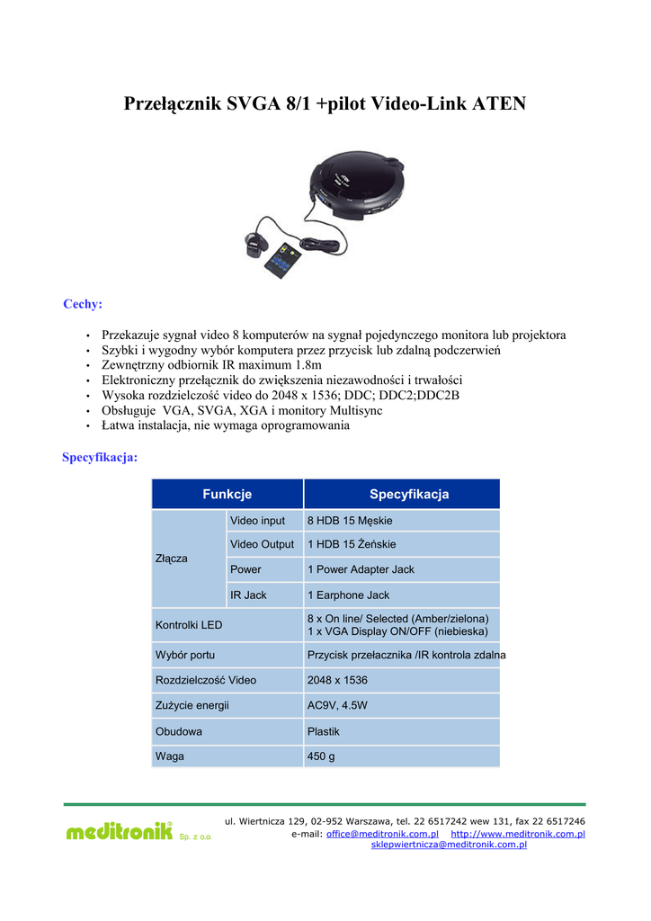 Przełącznik SVGA 8/1 +pilot Video-Link ATEN Cechy: • • • • • • • Przekazuje sygnał video 8 komputerów na sygnał pojedynczego monitora lub projektora Szybki i wygodny wybór komputera przez przycisk lub zdalną podczerwień Zewnętrzny odbiornik IR maximum 1.8m Elektroniczny przełącznik do zwiększenia niezawodności i trwałości Wysoka rozdzielczość video do 2048 x 1536; DDC; DDC2;DDC2B Obsługuje VGA, SVGA, XGA i monitory Multisync Łatwa instalacja, nie wymaga oprogramowania Specyfikacja: Funkcje Złącza Specyfikacja Video input 8 HDB 15 Męskie Video Output 1 HDB 15 Żeńskie Power 1 Power Adapter Jack IR Jack 1 Earphone Jack Kontrolki LED 8 x On line/ Selected (Amber/zielona) 1 x VGA Display ON/OFF (niebieska) Wybór portu Przycisk przełacznika /IR kontrola zdalna Rozdzielczość Video 2048 x 1536 Zużycie energii AC9V, 4.5W Obudowa Plastik Waga 450 g ul. Wiertnicza 129, 02-952 Warszawa, tel. 22 6517242 wew 131, fax 22 6517246 e-mail: [email protected] http://www.meditronik.com.pl [email protected]
