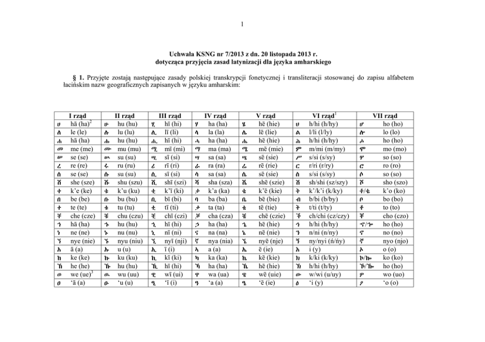 1 Uchwała KSNG nr 7/2013 z dn. 20 listopada 2013 r. dotycząca przyjęcia zasad latynizacji dla języka amharskiego § 1. Przyjęte zostają następujące zasady polskiej transkrypcji fonetycznej i transliteracji stosowanej do zapisu alfabetem łacińskim nazw geograficznych zapisanych w języku amharskim: I rząd hā (ha)2 ሀ ለ le (le) ሐ hā (ha) መ me (me) ሠ se (se) ረ re (re) ሰ se (se) ሸ she (sze) ቀ k’e (ke) በ be (be) ተ te (te) ቸ che (cze) ኀ hā (ha) ne (ne) ነ nye (nie) ኘ A ā (a) ከ ke (ke) ኸ he (he) 3 ወ we (ue) A ‘ā (a) ሁ ሉ ሑ ሙ ሡ ሩ ሱ ሹ ቁ ቡ ቱ ቹ ኁ ኑ ኙ U ኩ ኹ ዉ U II rząd hu (hu) lu (lu) hu (hu) mu (mu) su (su) ru (ru) su (su) shu (szu) k’u (ku) bu (bu) tu (tu) chu (czu) hu (hu) nu (nu) nyu (niu) u (u) ku (ku) hu (hu) wu (uu) ‘u (u) III rząd ሂ hī (hi) ሊ lī (li) ሒ hī (hi) ሚ mī (mi) ሢ sī (si) ሪ rī (ri) ሲ sī (si) ሺ shī (szi) ቂ k’ī (ki) ቢ bī (bi) ቲ tī (ti) ቺ chī (czi) ኂ hī (hi) ኒ nī (ni) ኚ nyī (nji) I ī (i) ኪ kī (ki) ኺ hī (hi) ዊ wī (ui) I ‘ī (i) ሃ ላ ሓ ማ ሣ ራ ሳ ሻ ቃ ባ ታ ቻ ኃ ና ኛ ኣ ካ ኻ ዋ ዓ IV rząd ha (ha) la (la) ha (ha) ma (ma) sa (sa) ra (ra) sa (sa) sha (sza) k’a (ka) ba (ba) ta (ta) cha (cza) ha (ha) na (na) nya (nia) a (a) ka (ka) ha (ha) wa (ua) ‘a (a) ሄ ሌ ሔ ሜ ሤ ሬ ሴ ሼ ቄ ቤ ቴ ቼ ኄ ኔ ኜ ኤ ኬ ኼ ዌ ዔ V rząd hē (hie) lē (lie) hē (hie) mē (mie) sē (sie) rē (rie) sē (sie) shē (szie) k’ē (kie) bē (bie) tē (tie) chē (czie) hē (hie) nē (nie) nyē (nje) ē (ie) kē (kie) hē (hie) wē (uie) ‘ē (ie) ህ ል ሕ ም ሥ ር ስ ሽ ቅ ብ ት ች ኅ ን ኝ E ክ ኽ ው E VI rząd1 h/hi (h/hy) l/li (l/ly) h/hi (h/hy) m/mi (m/my) s/si (s/sy) r/ri (r/ry) s/si (s/sy) sh/shi (sz/szy) k’/k’i (k/ky) b/bi (b/by) t/ti (t/ty) ch/chi (cz/czy) h/hi (h/hy) n/ni (n/ny) ny/nyi (ń/ńy) i (y) k/ki (k/ky) h/hi (h/hy) w/wi (u/uy) ‘i (y) VII rząd ho (ho) ሆ lo (lo) ሎ ho (ho) ሖ mo (mo) ሞ so (so) ሦ ro (ro) ሮ so (so) ሶ sho (szo) ሾ k’o (ko) ቆ/ቈ bo (bo) ቦ to (to) ቶ cho (czo) ቾ ኆ/ኈ ho (ho) no (no) ኖ nyo (njo) ኞ o (o) O ko (ko) ኮ/ኰ ኾ/ዀ ho (ho) wo (uo) ዎ ‘o (o) O 2 I rząd ዘ ze (ze) ዠ zhe (że) የ ye (je) ደ de (de) ጀ je (dże) ge (ge) ገ ጠ t’e (te) ጨ ch’e (cze) ጰ p’e (pe) 4 ጸ ts’e (tse) ፀ ts’e (tse) ፈ fe (fe) ፐ pe (pe) ቨ ve (we) ዙ ዡ ዩ ዱ ጁ ጉ ጡ ጩ ጱ ጹ ፁ ፉ ፑ ቩ II rząd zu (zu) zhu (żu) yu (ju) du (du) ju (dżu) gu (gu) t’u (tu) ch’u (czu) p’u (pu) ts’u (tsu) ts’u (tsu) fu (fu) pu (pu) vu (wu) III rząd ዚ zī (zi) ዢ zhī (żi) ዪ yī (ji) ዲ dī (di) ጂ jī (dżi) ጊ gī (gi) ጢ t’ī (ti) ጪ chiī (czi) ጲ p’ī (pi) ጺ ts’ī (tsi) ፂ ts’ī (tsi) ፊ fī (fi) ፒ pī (pi) ቪ vī (wi) IV rząd ዛ za (za) ዣ zha (ża) ያ ya (ja) ዳ da (da) ጃ ja (dża) ጋ ga (ga) ጣ t’a (ta) ጫ ch’a (cza) ጳ p’a (pa) ጻ ts’a (tsa) ts’a (tsa) ፃ ፋ fa (fa) ፓ pa (pa) ቫ va (wa) V rząd zē (zie) ዜ zhē (żie) ዤ yē (jie) ዬ dē (die) ዴ jē (dżie) ጄ gē (gie) ጌ t’ē (tie) ጤ ጬ ch’ē (czie) p’ē (pie) ጴ ts’ē (tsie) ጼ ts’ē (tsie) ፄ fē (fie) ፌ pē (pie) ፔ vē (wie) ቬ Spółgłoski labiowelarne ሏ ሟ ሯ ሷ ሿ ቋ ቌ ቊ ቧ lwa (lua) mwa (mua) rwa (rua) swa (sua) shwa (szua) k’wa (kua) k’wē (kuie) k’wi (kuy) bwa (bua) ቷ ቿ ኋ ኌ ኊ ኗ ኟ ኳ ኴ twa (tua) chwa (czua) hwa (hua) hwē (huie) hwi (huy) nwa (nua) nywa (niua) kwa (kua) kwē (kuie) ኲ ዟ ዧ ዷ ጇ ጓ ጔ ጒ ጧ kwi (kuy) zwa (zua) zhwa (żua) dwa (dua) jwa (dżua) gwa (gua) gwē (guie) gwi (guy) t’wa (tua) ጯ ጷ ጿ ፏ ch’wa (czua) p’wa (pua) ts’wa (tsua) fwa (fua) ኧ e (e) szczególny znak początkowy VI rząd1 ዝ z/zi (z/zy) ዥ zh/zhi (ż/ży) ይ y/yi (j/jy) ድ d/di (d/dy) ጅ j/ji (dż/dży) ግ g/gi (g/gy) ጥ t’/t’i (t/ty) ጭ ch’/ch’i (cz/czy) ጵ p’/p’i (p/py) ጽ ts’/ts’i (ts/tsy) ts’/ts’i (ts/tsy) ፅ ፍ f/fi (f/fy) ፕ p/pi (p/py) ቭ v/vi (w/wy) VII rząd zo (zo) ዞ zho (żo) ዦ yo (jo) ዮ do (do) ዶ jo (dżo) ጆ go (go) ጎ/ጐ t’o (to) ጦ ch’o (czo) ጮ p’o (po) ጶ ts’o (tso) ጾ ts’o (tso) ፆ fo (fo) ፎ po (po) ፖ vo (wo) ቮ 3 1 Spółgłoski w VI rzędzie występują z samogłoską „y” (np. w nagłosie) lub bez samogłoski (np. w wygłosie), nie ma jednak sztywnych reguł i zależy to od wymowy danego wyrazu. 2 Pierwsza podana jest transliteracja Romanization System for Amharic BGN/PCGN 1967 System, a w nawiasie transkrypcja polska. 3 Wymowa zbliżona do wymowy polskiej spółgloski „ł”. 4 Wymowa zbliżona do wymowy polskiej spółgloski „c”. Przewodniczący Wiceprzewodniczący Wiceprzewodniczący prof. dr hab. Ewa Wolnicz-Pawłowska prof. dr hab. Andrzej Markowski mgr Maciej Zych Sekretarz mgr Katarzyna Przyszewska