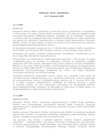 PRZEGLĄD PRASY UKRAIŃSKIEJ 16-21 listopada 2009 16.11.2009 newsru.ua Prezydent Ukrainy Wiktor Juszczenko zawetował ustawę parlamentu o wydzieleniu 1 mld hrywien na walkę z grypą. Media powiadomił o tym pierwszy zastępca szefa Kancelarii Prezydenta, Ołeksandr Szlapak. Podkreślił też, że prezydent Juszczenko w żadnym razie nie występuje przeciwko wydzieleniu pieniędzy na walkę z epidemią, nie zgadza się natomiast z parlamentem w sprawie źródła finansowania. Prezydent Ukrainy uważa, że tego rodzaju wydatki nie powinny być pokrywane przy pomocy emisji obligacji Narodowego Banku Ukrainy. Ze swej strony prezydent proponuje, by o 1 mld hrywien zwiększyć deficyt budżetowy na rok 2009 i zwrócić się do NBU z prośbą o pomoc w sfinansowaniu tego deficytu. Juszczenko jest gotów osobiście przeprowadzić konsultacje z bankierami po to, by w ciągu kilku dni zebrać niezbędną sumę. Przypomnijmy, że 3 listopada br. Rada Najwyższa przyznała 1 mld hrywien na walkę z epidemią grypy na Ukrainie. Po pierwszym czytaniu za przyjęciem projektu głosowało 229 z 401 posłów. Pieniądze miały zostać przelane na konto Ministerstwa Zdrowia, a nie rządu i miały pochodzić z konta zarezerwowanego na przygotowania Ukrainy do UEFA EURO 2012™. 11 listopada premier Julia Tymoszenko zażądała od prezydenta natychmiastowego podpisania tej ustawy. Już wtedy prezydent Juszczenko oświadczył, że ustawę zawetuje. Marszałek parlamentu Wołodymyr Łytwyn uważa, że w Ukrainie mamy teraz do czynienia nie tyle z epidemią grypy, co z „epidemią polityczną”. Łytwyn prognozuje, że wykorzystywanie sytuacji z epidemią grypy skończy się 17 stycznia 2010 roku, tj. w dzień wyborów prezydenckich. Podkreślił, że obecna sytuacja z grypą to manewr, mający na celu odsuwanie odpowiedzi na niewygodne pytania, które należałoby zadać władzom, np. dlaczego co trzeci dom, co piąta szkoła i co szóste przedszkole w kraju pozostają bez ogrzewania? 17.11.2009 Agencja UNIAN Prezydent Ukrainy Wiktor Juszczenko przedyskutował z szefem Rady Kantonów (wyższa izba szwajcarskiego parlamentu) Alainem Berse możliwości Szwajcarii zainwestowania w przygotowania Ukrainy do Mistrzostw Europy w Piłce Nożnej UEFA EURO 2012™. Służba prasowa Prezydenta Ukrainy poinformowała UNIAN, że podczas spotkania rozmawiano również o szwajcarsko-ukraińskiej współpracy parlamentarnej, rozwoju handlu, współpracy gospodarczej oraz inwestycyjnej. „Są powody, aby mówić o szerokim spektrum rozwoju naszych wzajemnych stosunków” – stwierdził Wiktor Juszczenko. Priorytetem strategicznym dwustronnych stosunków gospodarczych, dodał prezydent, jest utworzenie strefy wolnego handlu w ramach Europejskiego Stowarzyszenia Wolnego Handlu. Podobny format 1 stosunków handlowych z Unią Europejską w 75% został już uzgodniony w projekcie Umowy o stowarzyszeniu Ukrainy z UE. Prezydent wyraził też nadzieję, że szwajcarski parlament wkrótce wypowie się w sprawie dalszej liberalizacji systemu wizowego z Ukrainą. 1 stycznia 2004 roku Szwajcaria zniosła obowiązek wizowy dla obywateli Ukrainy, którzy są posiadaczami paszportów dyplomatycznych, urzędowych i specjalnych, a teraz trwają negocjacje w sprawie ułatwień wizowych dla wszystkich obywateli Ukrainy. 18.11.2009 www.most-kharkov.ua Trwa budowa na terenie Pałacu Lodowego w Charkowie. W chwili obecnej prowadzone są prace przy elewacji zewnętrznej oraz przy porządkowaniu terenów wokół budynku – powiedział dziennikarzom dyrektor Departamentu ds. EURO 2012, Wiktor Chrystojew. Prace powinny się zakończyć w połowie grudnia 2009 roku, lecz otwarcie Pałacu Lodowego zaplanowano na styczeń 2010. Christojew powiedział też, że rząd wyraził zgodę na to, żeby po otwarciu Pałac Lodowy stał się spółką komunalną i już na kolejnym posiedzeniu Rady Miasta radni będą głosować za sporządzeniem umowy przedwstępnej na przeniesienie obiektu do rejestru własności miasta. „Kiedy obiekt stanie się własnością miasta, będziemy mogli podłączyć Lodowy Pałac do wszystkich komunikacji” – mówi Wiktor Christojew. www.liga.com.ua Ukraińska Prokuratura Generalna wszczęła sprawę karną w sprawie nadużyć przez urzędników Ministerstwa Transportu i Komunikacji, Ministerstwa Gospodarki oraz komisji przetargowej państwowego przedsiębiorstwa „Międzynarodowy Port Lotniczy Lwów", którzy dopuścili się nadużyć podczas procedur przetargowych na uzyskanie kontraktu na modernizację lotniska. Nieprawidłowości wykryto w procedurze przyznania kontraktu jednemu z obecnych wykonawców modernizacji lwowskiego portu lotniczego – firmy Azovinteks SA. Agencja Informacyjna Euro 2012 Ministersto ds. Rodziny, Młodzieży i Sportu Ukrainy czeka na 505 mln hrywien na odbudowę stadionu NSK „Olimpijski" w Kijowie, które miały zostać przelane na jego konto do końca 2009 roku. Wiceminister Rostysław Karandiejew na briefingu prasowym powiedział, że pieniądze te nie są zaliczką na następny rok. „Zaliczka na rok następny, o jaką poprosiliśmy Gabinet Ministrów, wynosi 200 mln hrywien. Natomiast 505 mln – to środki, których potrzebujemy już dziś” – powiedział. Karandiejew zauważył, że około 200 mln hrywien zostało już przesłanych do wykonawcy robót budowlanych jako zaliczka za wykonanie dachu nad Stadionem Olimpijskim. Dodał, że jeszcze w roku bieżącym potrzebnych będzie około 200 mln hrywien. 2 20.11.2009 www.zaxidnet.ua „Rząd do tej pory nie przekazał pieniędzy na opłatę robót przygotowawczych budowy nowego terminala w porcie lotniczym we Lwowie oraz poszerzenia pasa startowego” powiedział dziś gubernator regionu lwowskiego, Mykoła Kmit’. Wyraził nadzieję, że środki wkrótce nadejdą. Do tej pory przedsiębiorstwa zajmujące się modernizacją lotniska wykonały roboty na sumę 15 mln hrywien. W tym miesiącu władze Lwowa czekają na 70 mln hrywien z