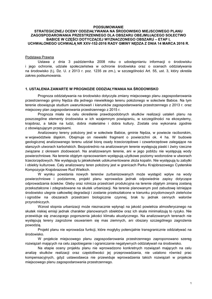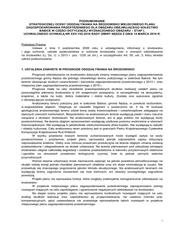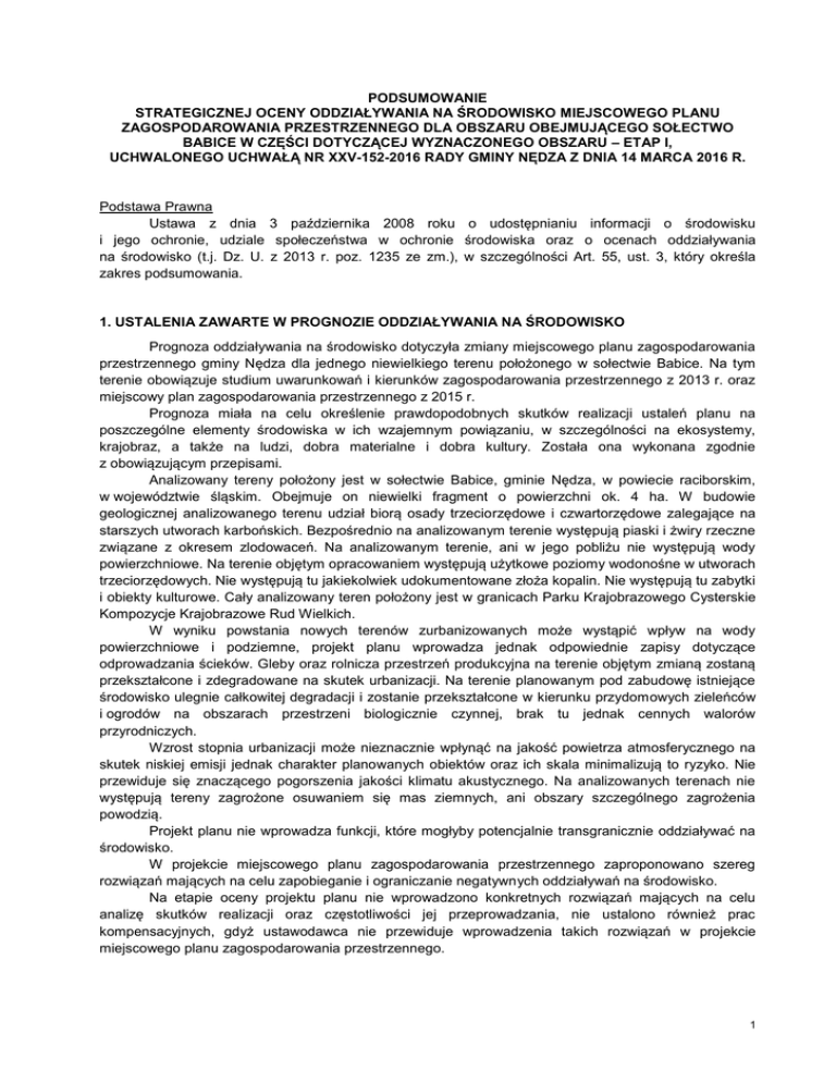 PODSUMOWANIE STRATEGICZNEJ OCENY ODDZIAŁYWANIA NA ŚRODOWISKO MIEJSCOWEGO PLANU ZAGOSPODAROWANIA PRZESTRZENNEGO DLA OBSZARU OBEJMUJĄCEGO SOŁECTWO BABICE W CZĘŚCI DOTYCZĄCEJ WYZNACZONEGO OBSZARU – ETAP I, UCHWALONEGO UCHWAŁĄ NR XXV-152-2016 RADY GMINY NĘDZA Z DNIA 14 MARCA 2016 R. Podstawa Prawna Ustawa z dnia 3 października 2008 roku o udostępnianiu informacji o środowisku i jego ochronie, udziale społeczeństwa w ochronie środowiska oraz o ocenach oddziaływania na środowisko (t.j. Dz. U. z 2013 r. poz. 1235 ze zm.), w szczególności Art. 55, ust. 3, który określa zakres podsumowania. 1. USTALENIA ZAWARTE W PROGNOZIE ODDZIAŁYWANIA NA ŚRODOWISKO Prognoza oddziaływania na środowisko dotyczyła zmiany miejscowego planu zagospodarowania przestrzennego gminy Nędza dla jednego niewielkiego terenu położonego w sołectwie Babice. Na tym terenie obowiązuje studium uwarunkowań i kierunków zagospodarowania przestrzennego z 2013 r. oraz miejscowy plan zagospodarowania przestrzennego z 2015 r. Prognoza miała na celu określenie prawdopodobnych skutków realizacji ustaleń planu na poszczególne elementy środowiska w ich wzajemnym powiązaniu, w szczególności na ekosystemy, krajobraz, a także na ludzi, dobra materialne i dobra kultury. Została ona wykonana zgodnie z obowiązującym przepisami. Analizowany tereny położony jest w sołectwie Babice, gminie Nędza, w powiecie raciborskim, w województwie śląskim. Obejmuje on niewielki fragment o powierzchni ok. 4 ha. W budowie geologicznej analizowanego terenu udział biorą osady trzeciorzędowe i czwartorzędowe zalegające na starszych utworach karbońskich. Bezpośrednio na analizowanym terenie występują piaski i żwiry rzeczne związane z okresem zlodowaceń. Na analizowanym terenie, ani w jego pobliżu nie występują wody powierzchniowe. Na terenie objętym opracowaniem występują użytkowe poziomy wodonośne w utworach trzeciorzędowych. Nie występują tu jakiekolwiek udokumentowane złoża kopalin. Nie występują tu zabytki i obiekty kulturowe. Cały analizowany teren położony jest w granicach Parku Krajobrazowego Cysterskie Kompozycje Krajobrazowe Rud Wielkich. W wyniku powstania nowych terenów zurbanizowanych może wystąpić wpływ na wody powierzchniowe i podziemne, projekt planu wprowadza jednak odpowiednie zapisy dotyczące odprowadzania ścieków. Gleby oraz rolnicza przestrzeń produkcyjna na terenie objętym zmianą zostaną przekształcone i zdegradowane na skutek urbanizacji. Na terenie planowanym pod zabudowę istniejące środowisko ulegnie całkowitej degradacji i zostanie przekształcone w kierunku przydomowych zieleńców i ogrodów na obszarach przestrzeni biologicznie czynnej, brak tu jednak cennych walorów przyrodniczych. Wzrost stopnia urbanizacji może nieznacznie wpłynąć na jakość powietrza atmosferycznego na skutek niskiej emisji jednak charakter planowanych obiektów oraz ich skala minimalizują to ryzyko. Nie przewiduje się znaczącego pogorszenia jakości klimatu akustycznego. Na analizowanych terenach nie występują tereny zagrożone osuwaniem się mas ziemnych, ani obszary szczególnego zagrożenia powodzią. Projekt planu nie wprowadza funkcji, które mogłyby potencjalnie transgranicznie oddziaływać na środowisko. W projekcie miejscowego planu zagospodarowania przestrzennego zaproponowano szereg rozwiązań mających na celu zapobieganie i ograniczanie negatywnych oddziaływań na środowisko. Na etapie oceny projektu planu nie wprowadzono konkretnych rozwiązań mających na celu analizę skutków realizacji oraz częstotliwości jej przeprowadzania, nie ustalono również prac kompensacyjnych, gdyż ustawodawca nie przewiduje wprowadzenia takich rozwiązań w projekcie miejscowego planu zagospodarowania przestrzennego. 1 Projekt planu nie wprowadza funkcji, które mogłyby wpłynąć na cele, przedmiot ochrony oraz integralność jakiegokolwiek obszaru Natura 2000 w związku z czym nie ma potrzeby wprowadzenia rozwiązań alternatywnych. 2. OPINIE WŁAŚCIWYCH ORGANÓW Właściwymi organami, zgodnie z Art. 57 i Art. 58 ustawy są: 1) Regionalny Dyrektor Ochrony Środowiska 2) Państwowy Powiatowy Inspektor Sanitarny W piśmie znak RIG.6721.126.2015 z dn. 17 listopada 2015 r. wystąpiono o zaopiniowanie projektu miejscowego planu zagospodarowania przestrzennego wraz z prognozą oddziaływania na środowisko do Regionalnego Dyrektora Ochrony Środowiska w Katowicach. Projekt planu został zaopiniowany pozytywnie pismem znak WOOŚ.410.556.2015.RK1 z dnia 27 listopada 2015 r. W piśmie znak RIG.6721.127.2015 z dn. 17 listopada 2015 r. wystąpiono o zaopiniowanie projektu miejscowego planu zagospodarowania przestrzennego wraz z prognozą oddziaływania na środowisko do Powiatowego Inspektora Sanitarnego w Raciborzu. W piśmie z dnia 26 listopada 2015 r. znak ONS/ZNS.522.43.43.2015 projekt planu zaopiniowano pozytywnie. 3. ZGŁOSZONE UWAGI I WNIOSKI Społeczeństwo uzyskało możliwość zapoznania się z projektem miejscowego planu zagospodarowania przestrzennego fragmentu gminy Nędza. Udział społeczeństwa w opracowywaniu dokumentu został zapewniony zgodnie z obowiązującymi przepisami. Przebieg postępowania przedstawiono w tabeli. Sposób zawiadomienia Etap Obwieszczenie o przystąpieniu do sporządzania miejscowego planu zagospodarowania przestrzennego i o przeprowadzaniu strategicznej oceny oddziaływania na środowisko Obwieszczenie o wyłożeniu do publicznego wglądu, dyskusji publicznej i zbieraniu uwag ogłoszenie w gazecie: Dziennik Zachodni z 17 lipca 2015 r. ogłoszenie na tablicy ogłoszeń Urzędu Gminy Nędza ogłoszenie na stronie BIP Urzędu Gminy Nędza W ogłoszeniach termin składania wniosków został określony na 10 sierpnia 2015 r. ogłoszenie w gazecie: Dziennik Zachodni z 15 stycznia 2016 r. ogłoszenie na tablicy ogłoszeń Urzędu Gminy Nędza ogłoszenie na stronie BIP Urzędu Gminy Nędza W ogłoszeniach termin wyłożenia d