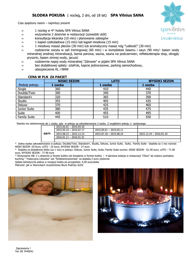 SŁODKA POKUSA 1 nocleg, 2 dni, od 18 lat) SPA Vilnius SANA Czas spędzony razem – najmilszy prezent • • • • • • • • • 1 nocleg w 4* hotelu SPA Vilnius SANA wyżywienie 2 dziennie w restauracji (szwedzki stół) konsultacja lekarska (10 min) i planowanie zabiegów 1 kapiel czekoladowa (15 min) lub kąpiel miodowa (15 min) 1 miodowy masaż pleców (30 min) lub aromatyczny masaż nóg ''Lekkość” (30 min) codziennie wizyta w sali treningowej (60 min) i w kompleksie basenu i saun /90 min/: basen wody mineralnej sredniej mineralizacji, łaznia parowa, sauna, sauna na podczerwien, refleksoterapia stop, okrągły prysznic, basen zimnej wody, jacuzzi codziennie napoj wody mineralnej ''Zdrowie'' w pijalni SPA Vilnius SANA bez dodatkowej opłaty: szlafrok, kapcie jednorazowe, parking samochodowy, ubezpieczenie KL i NNW CENA W PLN ZA PAKIET NISKI SEZON Rodzaj pokoju 1 osoba Single 360 Double/Twin 300 Standard+ 320 Studio 355 Deluxe 370 Junior Suite 380 Suite 400 Family Suite 445 LATO 1 osoba 410 340 365 405 425 435 455 510 WYSOKI SEZON 1 osoba 440 370 390 435 460 475 495 550 Stawka ma zastosowanie do 1 osoby, gdy w pokoju są zakwaterowane 2 osoby. Z wyjątkiem pokoju 1- osobowego 2015.02.01 – 2015.04.30 2015.05.10 – 2015.07.17 2015.05.01 – 2015.05.11 DATY 2015.08.23 – 2015.12.23 2015.07.18 – 2015.08.24 2015.12.24 – 2016.01.10 2016.01.11 – 2016.01.31 * Jedna osoba zakwaterowana w pokoju: Double/Twin, Standard+, Studio, Deluxe, Junior Suite, Suite, Family Suite - dopłata za 1 noc wynosi: NISKI SEZON -20 Euro, LATO - 25 euro, WYSOKI SEZON - 27 euro * Dopłata za dodatkowe łóżko (za 1 noc) w pokoju: Deluxe, Junior Suite, Suite, Family Suite wynosi: NISKI SEZON - 61.40 euro, LATO - 71.40 euro, WYSOKI SEZON - 77.40 euro * Wyżywienie HB: 2 x dziennie w formie bufetu lub śniadanie w formie bufetu i 4-daniowa kolacja w restauracji ''Cibus'' do wyboru pomiędzy kuchnią '' Tradycyjna Litewska'' lub ''Śródziemnomorska'' za dopłatą 3 euro /dziennie Opłata klimatyczna platna w recepcji hotelu po przyjeżdzie. 0,50 euro/doba Płatność: jak w Warunkach Uczestnictwa Biura Podróży ALEX Zapraszamy ! Tel: 85 7445041