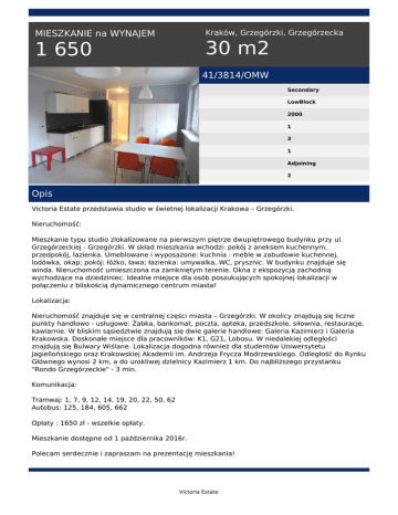 Kraków, Grzegórzki, Grzegórzecka MIESZKANIE na WYNAJEM 30 m2 1 650 41/3814/OMW Secondary LowBlock 2000 1 3 1 Adjoining 2 Opis Victoria Estate przedstawia studio w świetnej lokalizacji Krakowa – Grzegórzki. Nieruchomość: Mieszkanie typu studio zlokalizowane na pierwszym piętrze dwupiętrowego budynku przy ul. Grzegórzeckiej - Grzegórzki. W skład mieszkania wchodzi: pokój z aneksem kuchennym, przedpokój, łazienka. Umeblowane i wyposażone: kuchnia - meble w zabudowie kuchennej, lodówka, okap; pokój: łóżko, ława; łazienka: umywalka, WC, prysznic. W budynku znajduje się winda. Nieruchomość umieszczona na zamkniętym terenie. Okna z ekspozycją zachodnią wychodzące na dziedziniec. Idealne miejsce dla osób poszukujących spokojnej lokalizacji w połączeniu z bliskością dynamicznego centrum miasta! Lokalizacja: Nieruchomość znajduje się w centralnej części miasta – Grzegórzki. W okolicy znajdują się liczne punkty handlowo - usługowe: Żabka, bankomat, poczta, apteka, przedszkole, siłownia, restauracje, kawiarnie. W bliskim sąsiedztwie znajdują się dwie galerie handlowe: Galeria Kazimierz i Galeria Krakowska. Doskonałe miejsce dla pracowników: K1, G21, Lobosu. W niedalekiej odległości znajdują się Bulwary Wiślane. Lokalizacja dogodna również dla studentów Uniwersytetu Jagiellońskiego oraz Krakowskiej Akademii im. Andrzeja Frycza Modrzewskiego. Odległość do Rynku Głównego wynosi 2 km, a do urokliwej dzielnicy Kazimierz 1 km. Do najbliższego przystanku "Rondo Grzegórzeckie" - 3 min. Komunikacja: Tramwaj: 1, 7, 9, 12, 14, 19, 20, 22, 50, 62 Autobus: 125, 184, 605, 662 Opłaty : 1650 zł - wszelkie opłaty. Mieszkanie dostępne od 1 października 2016r. Polecam serdecznie i zapraszam na prezentację mieszkania! Victoria Estate Paulina Zajdel tel. +48 789 453 049 email: [email protected] Victoria Estate Powered by TCPDF (www.tcpdf.org)