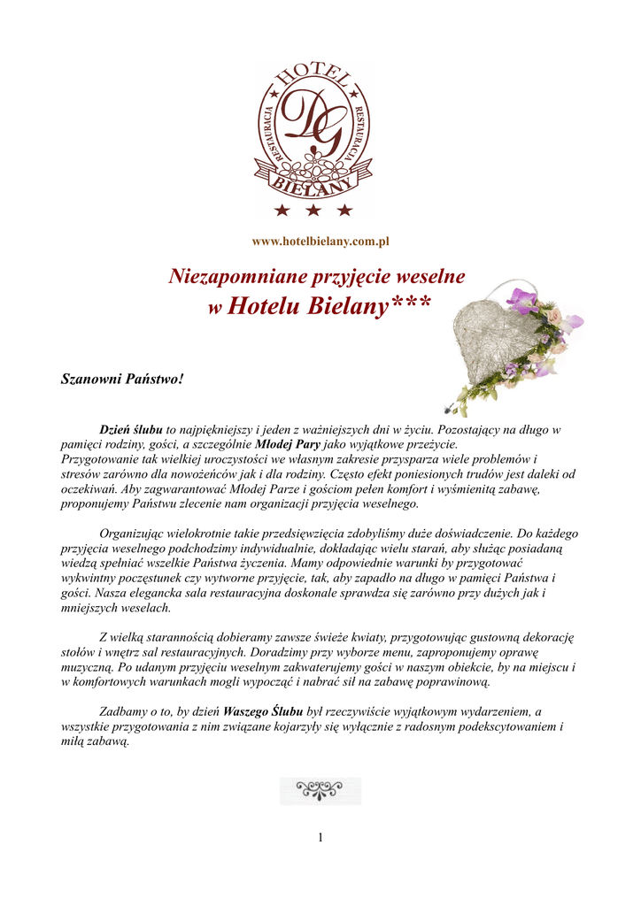 www.hotelbielany.com.pl Niezapomniane przyjęcie weselne w Hotelu Bielany*** Szanowni Państwo! Dzień ślubu to najpiękniejszy i jeden z ważniejszych dni w życiu. Pozostający na długo w pamięci rodziny, gości, a szczególnie Młodej Pary jako wyjątkowe przeżycie. Przygotowanie tak wielkiej uroczystości we własnym zakresie przysparza wiele problemów i stresów zarówno dla nowożeńców jak i dla rodziny. Często efekt poniesionych trudów jest daleki od oczekiwań. Aby zagwarantować Młodej Parze i gościom pełen komfort i wyśmienitą zabawę, proponujemy Państwu zlecenie nam organizacji przyjęcia weselnego. Organizując wielokrotnie takie przedsięwzięcia zdobyliśmy duże doświadczenie. Do każdego przyjęcia weselnego podchodzimy indywidualnie, dokładając wielu starań, aby służąc posiadaną wiedzą spełniać wszelkie Państwa życzenia. Mamy odpowiednie warunki by przygotować wykwintny poczęstunek czy wytworne przyjęcie, tak, aby zapadło na długo w pamięci Państwa i gości. Nasza elegancka sala restauracyjna doskonale sprawdza się zarówno przy dużych jak i mniejszych weselach. Z wielką starannością dobieramy zawsze świeże kwiaty, przygotowując gustowną dekorację stołów i wnętrz sal restauracyjnych. Doradzimy przy wyborze menu, zaproponujemy oprawę muzyczną. Po udanym przyjęciu weselnym zakwaterujemy gości w naszym obiekcie, by na miejscu i w komfortowych warunkach mogli wypocząć i nabrać sił na zabawę poprawinową. Zadbamy o to, by dzień Waszego Ślubu był rzeczywiście wyjątkowym wydarzeniem, a wszystkie przygotowania z nim związane kojarzyły się wyłącznie z radosnym podekscytowaniem i miłą zabawą. 1 Sala Restauracyjna Decydując się na zorganizowanie przyjęcia weselnego w Hotelu Bielany *** otrzymają Państwo do dyspozycji na wyłączność elegancką, klimatyzowaną salę na tańce i biesiadowanie, która pomieści do 200 osób. 2 Pokoje Do Państwa dyspozycji oddajemy 34 pokoje 1-, 2-, 3- i 4-osobowe. Dla gości hotelowych śniadanie w cenie. Natomist każda Młoda Para otrzyma od nas w prezencie ślubnym nocleg w apartamencie ze śniadaniem. 3 Menu weselne Powitanie Młodej Pary chlebem i solą oraz wzniesienie toastu kieliszkiem wina musującego Przystawki (do wyboru jedna przystawka): • ◦ Rolada z piersi indyczej z musem brokułowym i jajkiem przepiórczym ◦ Łosoś wędzony z serkiem ziołowym na kolorowych sałatach ◦ Szynka ze szparagami w krążku ananasa ◦ Biała ryba gotowana w auszpiku winno-szafranowym z sosem remoulade ◦ Sałatka capresse ze swieżą bazylią i sosem vinaigrette Do każdej przystawki pieczywo i masełko Zupy(do wyboru jedna zupa): ◦ ◦ ◦ ◦ ◦ Bulion z makaronem i natką pietruszki Krem brokułowy z groszkiem ptysiowym Krem z zielonego groszku z grzankami Krem kalafiorowy z zielonymi kluseczkami Krem pomidorowy z wiórkami mozzarelli i świeżą bazylią II Danie (do wyboru pięć rodzajów mięs po 2 porcje na osobę): • ◦ Sakiewki wieprzowe wypełnione boczkiem, pieczarkami, cebulą i papryką ◦ Roladka ze schabu faszerowana serem i pieczarkami ◦ Polędwiczki wieprzowe opasane boczkiem ◦ Rolada karczku pieczonego z jabłkami ◦ Tradycyjny kotlet schabowy ◦ Zraziki wieprzowe mielone ◦ Zraz wieprzowy duszony w sosie własnym ◦ Aromatyczna pieczeń z szynki wieprzowej w sosie własnym ◦ Filet drobiowy panierowany ◦ Filet drobiowy nadziewany serem feta i szpinakiem ◦ Kotlet de Vollaille z masłem i siekaną natką pietruszki ◦ Szaszłyki drobiowe przekładane papryką, wędzonym boczkiem i cebulką ◦ Soczyste udka z kurczaka w papilocie pieczone na złoty kolor Danie dla wegetarian: ◦ Canelloni ze szpinakiem i warzywami polane sosem concase ◦ Mozzarella opiekana z sosem cumberland ◦ Talerz pierogów z kapustą i pieczarkami, ruskie 4 Dodatki (do wyboru trzy dodatki): ◦ ◦ ◦ ◦ ◦ Ziemniaki z wody z natką pietruszki Kluski śląskie Ryż Frytki Kulki ziemniaczane Warzywa gotowane (dwa rodzje do wyboaru): ◦ ◦ ◦ ◦ ◦ Bukiet warzyw gotowanych: brokuł, kalafior, marchewka Buraczki zasmażane Kapusta zasmażana Liście szpinaku w śmietanie Szparagi z masłem i bułką Bukiet warzyw surowych (do wyboru jedno): ◦ Sałatka letnia: ogórek, pomidor, sałata , sos vinaigrette ◦ Bukiet surówek : marchewka z mandarynką, seler z rodzynkami w śmietania, ◦ kapusta czerwona z jabłkiem ◦ Deser (do wyboru jeden deser): ◦ Gruszki kąpane w wanilii z gałką lodów, polewą i bitą śmietaną ◦ Pucharek lodów z owocami, polewą i bitą śmietaną ◦ Owoce sezonowe w pucharku z gałką lodów i bitą śmietaną ◦ Deser Pannacotta z cząstkami owoców leśnych, sosem i bitą śmietaną Zakąski zimne (do wyboru sześć rodzajów): ◦ ◦ ◦ ◦ ◦ ◦ ◦ ◦ ◦ ◦ ◦ ◦ ◦ • Galantyna drobiowa Rolada z piersi indyczej z morelą Schab ze śliwką Schab ze szpinakiem Karczek pieczony Boczek faszerowany Szynka pieczona Tymbaliki drobiowe z warzywami Galart z nóżek wieprzowych Ozorki w galarecie Pasztety i mięsne teriny Salami, kabanosy Szynka wiejska Do zakąsek pikle, ogórki konserwowe, pieczarki konserwowe, papryka konserwowa itp. 5 Sos do zimnych mięs: ◦ Ćwikła ◦ Chrzanowy ◦ Tatarski Sałatki (do wyboru trzy rodzaje): ◦ ◦ ◦ ◦ ◦ ◦ ◦ ◦ ◦ ◦ • Sałatka jarzynowa polska Sałatka wiosenna Sałatka bawarska Sałatka pieczarkowa Sałatka włoska Sałatka bałkańska Sałatka śledziowa Jaja w sosie tatarskim Matias w oleju Rolmopsy śledziowe w occie Pieczywo, masełko Dania na gorąco serwowane w godzinach nocnych (do wyboru 2 dania:pierwsze przed północą i drugie po północy): ◦ Barszcz czerwony z krokietem ◦ Barszcz czerwony z pasztecikiem ◦ Beauf Strogonow ◦ Pikantna zupa gulaszowa z ziemniakami i papryką ◦ Meksykański gulasz z indyka, z papryk i fasoli ◦ Flaczki staropolskie ◦ Pieczone mini goloneczki z puszystym sosem chrzanowym ◦ Pieczone udka drobiowe