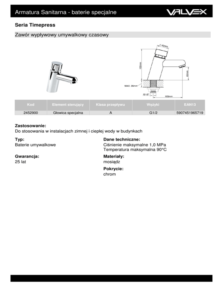 Armatura Sanitarna - baterie specjalne Seria Timepress Zawór wypływowy umywalkowy czasowy Kod Element sterujący Klasa przepływu Wężyki EAN13 2452900 Głowica specjalna A G1/2 5907451965719 Zastosowanie: Do stosowania w instalacjach zimnej i ciepłej wody w budynkach Typ: Baterie umywalkowe Dane techniczne: Ciśnienie maksymalne 1,0 MPa Temperatura maksymalna 90°C Gwarancja: 25 lat Materiały: mosiądz Pokrycie: chrom