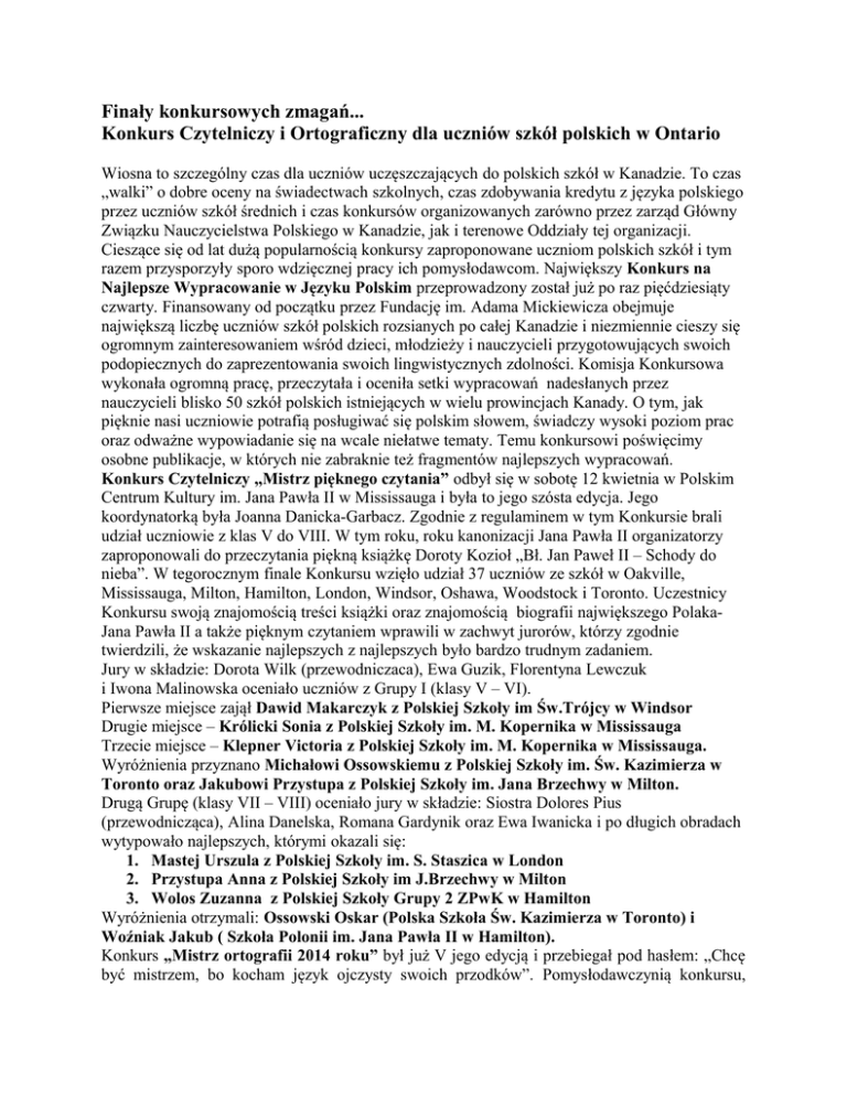 Finały konkursowych zmagań... Konkurs Czytelniczy i Ortograficzny dla uczniów szkół polskich w Ontario Wiosna to szczególny czas dla uczniów uczęszczających do polskich szkół w Kanadzie. To czas „walki” o dobre oceny na świadectwach szkolnych, czas zdobywania kredytu z języka polskiego przez uczniów szkół średnich i czas konkursów organizowanych zarówno przez zarząd Główny Związku Nauczycielstwa Polskiego w Kanadzie, jak i terenowe Oddziały tej organizacji. Cieszące się od lat dużą popularnością konkursy zaproponowane uczniom polskich szkół i tym razem przysporzyły sporo wdzięcznej pracy ich pomysłodawcom. Największy Konkurs na Najlepsze Wypracowanie w Języku Polskim przeprowadzony został już po raz pięćdziesiąty czwarty. Finansowany od początku przez Fundację im. Adama Mickiewicza obejmuje największą liczbę uczniów szkół polskich rozsianych po całej Kanadzie i niezmiennie cieszy się ogromnym zainteresowaniem wśród dzieci, młodzieży i nauczycieli przygotowujących swoich podopiecznych do zaprezentowania swoich lingwistycznych zdolności. Komisja Konkursowa wykonała ogromną pracę, przeczytała i oceniła setki wypracowań nadesłanych przez nauczycieli blisko 50 szkół polskich istniejących w wielu prowincjach Kanady. O tym, jak pięknie nasi uczniowie potrafią posługiwać się polskim słowem, świadczy wysoki poziom prac oraz odważne wypowiadanie się na wcale niełatwe tematy. Temu konkursowi poświęcimy osobne publikacje, w których nie zabraknie też fragmentów najlepszych wypracowań. Konkurs Czytelniczy „Mistrz pięknego czytania” odbył się w sobotę 12 kwietnia w Polskim Centrum Kultury im. Jana Pawła II w Mississauga i była to jego szósta edycja. Jego koordynatorką była Joanna Danicka-Garbacz. Zgodnie z regulaminem w tym Konkursie brali udział uczniowie z klas V do VIII. W tym roku, roku kanonizacji Jana Pawła II organizatorzy zaproponowali do przeczytania piękną książkę Doroty Kozioł „Bł. Jan Paweł II – Schody do nieba”. W tegorocznym finale Konkursu wzięło udział 37 uczniów ze szkół w Oakville, Mississauga, Milton, Hamilton, London, Windsor, Oshawa, Woodstock i Toronto. Uczestnicy Konkursu swoją znajomością treści książki oraz znajomością biografii największego PolakaJana Pawła II a także pięknym czytaniem wprawili w zachwyt jurorów, którzy zgodnie twierdzili, że wskazanie najlepszych z najlepszych było bardzo trudnym zadaniem. Jury w składzie: Dorota Wilk (przewodniczaca), Ewa Guzik, Florentyna Lewczuk i Iwona Malinowska oceniało uczniów z Grupy I (klasy V – VI). Pierwsze miejsce zajął Dawid Makarczyk z Polskiej Szkoły im Św.Trójcy w Windsor Drugie miejsce – Królicki Sonia z Polskiej Szkoły im. M. Kopernika w Mississauga Trzecie miejsce – Klepner Victoria z Polskiej Szkoły im. M. Kopernika w Mississauga. Wyróżnienia przyznano Michałowi Ossowskiemu z Polskiej Szkoły im. Św. Kazimierza w Toronto oraz Jakubowi Przystupa z Polskiej Szkoły im. Jana Brzechwy w Milton. Drugą Grupę (klasy VII – VIII) oceniało jury w składzie: Siostra Dolores Pius (przewodnicząca), Alina Danelska, Romana Gardynik oraz Ewa Iwanicka i po długich obradach wytypowało najlepszych, którymi okazali się: 1. Mastej Urszula z Polskiej Szkoły im. S. Staszica w London 2. Przystupa Anna z Polskiej Szkoły im J.Brzechwy w Milton 3. Wolos Zuzanna z Polskiej Szkoły Grupy 2 ZPwK w Hamilton Wyróżnienia otrzymali: Ossowski Oskar (Polska Szkoła Św. Kazimierza w Toronto) i Woźniak Jakub ( Szkoła Polonii im. Jana Pawła II w Hamilton). Konkurs „Mistrz ortografii 2014 roku” był już V jego edycją i przebiegał pod hasłem: „Chcę być mistrzem, bo kocham język ojczysty swoich przodków”. Pomysłodawczynią konkursu, koordynatorem i przewodniczącą Komisji była Zuzanna Stupak. W skład tej Komisji weszli: Teresa Szramek, Irena Basiukiwicz i Ryszard Sopala..Oto wyniki: Tytuł Mistrza Ortografii i złoty medal zdobył Dominik Wrona – Szkolny Punkt Konsultacyjny w Toronto II miejsce i srebrny medal - Michał Roztocki - Szkoła Polska im . St. Haidasza – Mississauga (Erindale Sec. School) Komisja przyznała dwa trzecie miejsca i brązowy medal Izabeli Pituli – Szkolny Punkt Konsultacyjny w Toronto oraz Michałowi Szpakowiczowi ze Szkoły Średniej im. M. Kopernika (John Cabot) w Mississauga. Wyróżnienia otrzymali: Julia Miłosz - Szkoła im. M. Konopnickiej w Oakville i Adam Kozak - Szkoła Don Bosco w Toronto. Ogłoszenie wyników konkursowych zmagań odbyło się w Sali kawiarenki Centrum. O piękną dekorację, której myślą przewodnią była zbliżająca się kanonizacja papieża Polaka – Jana Pawła II zadbały Joanna Danicka-Garbacz, Ewa Iwanicka i Dorota Wilk. Tę część uroczystości poprowadziła wiceprezes ZG ZNPwK, Teresa Szramek, która w serdecznych słowach powitała wszystkich uczestników konkursów, rodziców, nauczycieli i gości honorowych, a wśród nich: pana Grzegorza Jopkiewicza, Konsula d/s Polonii Konsulatu Generalnego RP w Toronto, panią Teresę Berezowską, prezes ZG KPK, pana Roberta Zawieruchę, prezesa ZG ZPwK, panie Danutę Warszawską, Helenę Spandlik i Armandynę Maziarczyk ze Stowarzyszenia Marii Skłodowskiej -Curie, panią Łucję Stec, prezes Funduszu Dziedzictwa Polek w Kanadzie i wiceprezes panią Stellę Szustaczek oraz prezes Oddziału Mississauga, Teresę Bielecką oraz członka Zarządu Oddziału, Joannę Gadomską. Najprzyjemniejszym i najbardziej emocjonującym momentem tego popołudnia było ogłoszenie wyników obydwu konkursów oraz wręczenie dyplomów, medali i nagród książkowych, ktore laureaci otrzymali z rąk gości i sponsorów. Zanim usłyszeliśmy nazwiska zwycięzców gratulacje wszystkim uczestnikom Konkursów, ich nauczycielom i rodzicom złożyli pan Konsul Grzegorz Jopkiewicz i pani Prezes Teresa Berezowska. Teresa Szramek podkreśliła też, jak ważną rolę pełnią sponsorzy, 