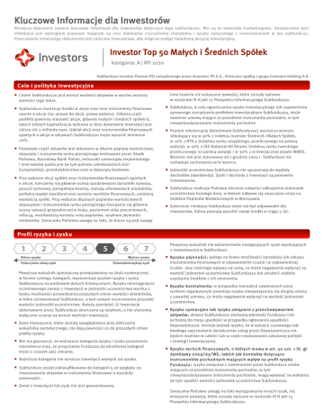 Kluczowe Informacje dla Inwestorów Niniejszy dokument zawiera kluczowe informacje dla inwestorów dotyczące tego subfunduszu. Nie są to materiały marketingowe. Dostarczenie tych informacji jest wymogiem prawnym mającym na celu ułatwienie zrozumienia charakteru i ryzyka związanego z inwestowaniem w ten subfundusz. Przeczytanie niniejszego dokumentu jest zalecane inwestorowi, aby mógł on podjąć świadomą decyzję inwestycyjną. Investor Top 50 Małych i Średnich Spółek kategoria: A | RFI 1020 Subfundusz Investor Parasol FIO zarządzanego przez Investors TFI S.A., która jest spółką z grupy Investors Holding S.A. Cele i polityka inwestycyjna ▪ Celem Subfunduszu jest wzrost wartości aktywów w wyniku wzrostu wartości jego lokat. ▪ Subfundusz inwestuje środki w akcje oraz inne instrumenty finansowe oparte o akcje (np. prawa do akcji, prawa poboru). Główną część portfela powinny stanowić akcje, głównie małych i średnich spółek tj. takich których kapitalizacja rynkowa w dniu dokonania inwestycji jest niższa niż 3 miliardy euro. Udział akcji oraz instrumentów finansowych opartych o akcje w aktywach Subfunduszu może wynosić minimum 70%. ▪ Pozostała część aktywów jest lokowana w dłużne papiery wartościowe, depozyty i instrumenty rynku pieniężnego emitowane przez Skarb Państwa, Narodowy Bank Polski, jednostki samorządu terytorialnego i inne władze publiczne (w tym państw członkowskich Unii Europejskiej), przedsiębiorstwa oraz w depozyty bankowe. ▪ Przy wyborze akcji spółek oraz instrumentów finansowych opartych o akcje, kierujemy się głównie oceną spodziewanej dynamiki rozwoju, pozycji rynkowej, perspektyw branży, rodzaju oferowanych produktów, polityką wypłat dywidend oraz wzrostu wyników finansowych, ustaloną wartością spółki. Przy wyborze dłużnych papierów wartościowych depozytów i instrumentów rynku pieniężnego kierujemy się głównie oceną sytuacji gospodarczej w kraju, poziomem stóp procentowych, inflacją, możliwością wzrostu ceny papierów, ryzykiem płynności emitentów. Zwracamy Państwa uwagę na fakt, że brane są pod uwagę inne kryteria niż wskazane powyżej, które zostały opisane w rozdziale III H pkt 12 Prospektu Informacyjnego Subfunduszu. ▪ Subfundusz, w celu ograniczenia ryzyka inwestycyjnego lub zapewnienia sprawnego zarządzania portfelem inwestycyjnym Subfunduszu, może zawierać umowy mające za przedmiot instrumenty pochodne, w tym niewystandaryzowane instrumenty pochodne. ▪ Poziom referencyjny (benchmark Subfunduszu) wyznacza wzorzec składający się w 50% z indeksu Investor Średnich i Małych Spółek, w 10% z RTS-2 (indeksu rynku rosyjskiego, przeliczonego na polską walutę), w 10% z ISE National All Shares (indeksu rynku tureckiego przeliczonego na polską walutę) i w 30% z 6-miesięcznej stawki WIBID. Wzorzec ten jest stosowany od 1 grudnia 2003 r. Subfundusz nie naśladuje zachowania w/w wzorca. ▪ Jednostki uczestnictwa Subfunduszu nie uprawniają do wypłaty dochodów (dywidendy). Zyski i dochody z inwestycji są ponownie inwestowane. ▪ Subfundusz realizuje Państwa zlecenia nabycia i odkupienia jednostek uczestnictwa każdego dnia, w którym odbywa się zwyczajna sesja na Giełdzie Papierów Wartościowych w Warszawie. ▪ Zalecenie: niniejszy Subfundusz może nie być odpowiedni dla inwestorów, którzy planują wycofać swoje środki w ciągu 5 lat. Profil ryzyka i zysku Powyższy wskaźnik nie odzwierciedla następujących ryzyk wynikających z inwestowania w Subfundusz: ▪ Ryzyko płynności: polega na braku możliwości sprzedaży lub zakupu Powyższy wskaźnik syntetyczny przedstawiony na skali numerycznej w formie szeregu kategorii, reprezentuje poziom ryzyka i zysku Subfunduszu na podstawie danych historycznych. Ryzyko nieosiągnięcia oczekiwanego zwrotu z inwestycji w jednostki uczestnictwa wynika z braku możliwości przewidzenia przyszłych zmian wartości składników, w które zainwestował Subfundusz, a tym samym oszacowania przyszłej wartości jednostki uczestnictwa. Należy pamiętać, iż inwestycje dokonywane przez Subfundusz obarczone są ryzykiem, a nie stanowią wyłącznie szansy na wzrost wartości inwestycji. ▪ Dane historyczne, które zostały uwzględnione przy obliczaniu wskaźnika syntetycznego, nie dają pewności co do przyszłych zmian profilu ryzyka. ▪ Nie ma gwarancji, że wskazana kategoria ryzyka i zysku pozostanie niezmienna oraz, że przypisanie Funduszu do określonej kategorii może z czasem ulec zmianie. ▪ Najniższa kategoria nie oznacza inwestycji wolnych od ryzyka. ▪ Subfundusz został zaklasyfikowany do kategorii 5 ze względu na inwestowanie aktywów w instrumenty finansowe o wysokiej zmienności. ▪ Zwrot z inwestycji lub zysk nie jest gwarantowany. instrumentów finansowych w odpowiednim czasie i w odpowiedniej liczbie , bez istotnego wpływu na cenę, co może negatywnie wpłynąć na wartość jednostek uczestnictwa Subfunduszu lub utrudnić szybkie uzyskanie środków z ich umorzenia. ▪ Ryzyko kontrahenta: w przypadku transakcji zawieranych poza rynkiem regulowanym powstaje ryzyko niewywiązania się drugiej strony z zawartej umowy, co może negatywnie wpłynąć na wartość jednostek uczestnictwa. ▪ Ryzyko operacyjne lub ryzyko związane z przechowywaniem aktywów: aktywa Subfunduszu stanowią własność Funduszu i nie wchodzą do masy upadłości w przypadku ogłoszenia upadłości Depozytariusza. Istnieje jednak ryzyko, że w sytuacji czasowego lub trwałego zaprzestania świadczenia usług przez Depozytariusza nie będzie możliwe w całości lub w części realizowanie założonej polityki i strategii inwestycyjnej. ▪ Ryzyko technik finansowych, o których mowa w art. 50 ust. 1 lit. g) dyrektywy 2009/65/WE, takich jak kontrakty dotyczące instrumentów pochodnych mających wpływ na profil ryzyka Funduszu: ryzyka związane z zawieraniem przez Subfundusz umów mających za przedmiot 