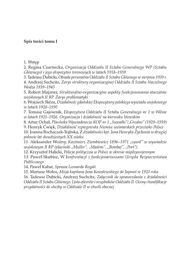 Spis treści tomu I 1. Wstęp 2. Regina Czarnecka, Organizacja Oddziału II Sztabu Generalnego WP (Sztabu Głównego) i jego ekspozytur terenowych w latach 1918–1939 3. Tadeusz Dubicki, Obsada personalna Oddziału II Sztabu Głównego w sierpniu 1939 r. 4. Andrzej Suchcitz, Zarys struktury organizacyjnej Oddziału II Sztabu Naczelnego Wodza 1939–1945 5. Robert Majzner, Strukturalno-organizacyjne aspekty funkcjonowania ataszatów wojskowych II RP. Zarys problematyki 6. Wojciech Skóra, Działalność gdańskiej Ekspozytury polskiego wywiadu wojskowego w latach 1920–1930 7. Tomasz Gajownik, Ekspozytura Oddziału II Sztabu Generalnego nr 1 w Wilnie w latach 1921–1926. Organizacja i działalność na kierunku litewskim 8. Artur Ochał, Placówka Wywiadowcza KOP nr 1 „Suwałki”/„Grodno” (1929–1939) 9. Henryk Ćwięk, Działalność szpiegowska Niemiec weimarskich przeciwko Polsce 10. Joanna Bochaczek-Trąbska, Z działalności kpt. Jana Henryka Żychonia w drugiej połowie łat dwudziestych XX wieku 11. Aleksander Woźny, Kazimierz Ziembiewicz 1896–1971 „cywil” w wywiadzie wojskowym II RP (placówki „Muller”, „Madras”, „Bombaj”, „Port”) 12. Krzysztof Halicki, Policja polityczna w Polsce w okresie międzywojennym 13. Paweł Skubisz, W konfrontacji z funkcjonariuszami Urzędu Bezpieczeństwa Publicznego 14. Paweł Kabat, Sprawa Leonarda Rogali 15. Mariusz Wołos, Misja kapitana Jana Kowalewskiego do Japonii w 1923 roku 16. Tadeusz Dubicki, Andrzej Suchcitz, Załącznik do sprawozdania z działalności Oddziału II Sztabu Głównego. Lista oficerów i urzędników Oddziału II. Oceny i kwalifikacje przydatności do służby w Oddziale II w chwili obecnej