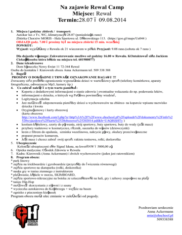 Na zajawie Rewal Camp Miejsce: Rewal Termin:28.07 – 09.08.2014 1. Miejsca i godziny zbiórek / transport: Autokar lux z Tv, WC, klimatyzacją. 28.07 (poniedziałek rano) Zbiórka Chorzów MORIS - Hala Sportowa ul. Dąbrowskiego 113. (https://goo.gl/maps/Ue044 ) ODJAZD godz. 7.00 – prosimy być na miejscu zbiórki 15 min. wcześniej POWRÓT: Wyjazd: wyjeżdżamy z Rewala ok 21 wieczorem w piątek Przyjazd: 9.08 rano.(sobota ok 7 rano ) Dla dojazdu własnego: Zakwaterowanie mozliwe od godziny 16.00 w Rewalu. KOntaktować się z Jackiem Ciekałą (osoba która będzie na miejscu tel. 601980077) 2. Dane teleadresowe Dom Słoneczko Nowy Świat 11 72-344 Rewal Osoba do kontaktu – Kierownik obozu Anna Ackermann tel. 509 338 388 3. Bagaż PROSIMY O DOKŁADNE I TRWAŁE OZNAKOWANIE BAGAŻU !!! Zwracamy się z prośbą o ograniczenie wyposażenia dzieci w wartościowy sprzęt (telefony komórkowe, aparaty fotograficzny, odtwarzacze Mp3, kamery itp.) 4. Co zabrać należy – o tym warto pamiętać: · Koperta z dodatkowymi informacjami o stanie zdrowia i ewentualne wskazania do np. podawania leków, · informacjami o dziecku, o których wg Państwa powinniśmy wiedzieć, · Legitymacja szkolna · Jest możliwość zdeponowania pieniędzy dzieci u wychowawców na zbiórce- na kopercie wpisane nazwisko dziecka i kwota · Oryginał umowy i karty obozowej (karta obozowa http://www.facebook.com/l.php?u=http%3A%2F%2Fwww.ehschool.pl%2Fuploads%2Fdokumenty%2Finfo%2 520wyjazdowe%2Fkarta%2520obozowa%25202014.pdf&h=UAQHJjHTy ) · kostium kąpielowy, szorty do pływania, strój sportowy, buty sportowe, buty do wody (jeśli masz) · przybory toaletowe w kosmetyczce, ręcznik, suszarka do włosów (dziewczynki) · krem z filtrem do opalania, szminka wazelinowa, nakrycie głowy, okulary przeciwsłoneczne · preparat przeciw komarom, · Jeśli masz i chcesz zabrać swój sprzęt: rakieta tenisowa, rolki, deskorolka 5. Ubezpieczenie Koloniści ubezpieczeni są w Signal Iduna, na kwotę NW – 5000,00 zł. 6. Opieka medyczna: Ośrodek Zdrowia w Rewalu 7. Kadra: Kierownik (Anna Ackermann) i dwóch wychowawców (jeden jest ratownikiem) 8. Program obozu: * park linowy * zajęcia na trickboardzie i gyroboardzie (przyrządy do ćwiczenia równowagi) * zajęcia sportowe na skateparku (rolki, deskorolka) * nauka gry w tenisa ziemnego z instruktorem * plażowanie, kąpiele w morzu, SKIMBOARD, * zajęcia sportowo-rekreacyjne na boisku ze sztuczną trawą i na hali, gry i zabawy zespołowe na plaży * taniec Hip-Hop * możliwość skorzystania z siłowni i z sauny * wycieczka autokarowa do Kołobrzegu + wejście na basen * ognisko z pieczeniem kiełbasek Program obozu może ulec zmianie w zależności od pogody. Pozdrawiam serdecznie Anna Ackermann [email protected] 509338388