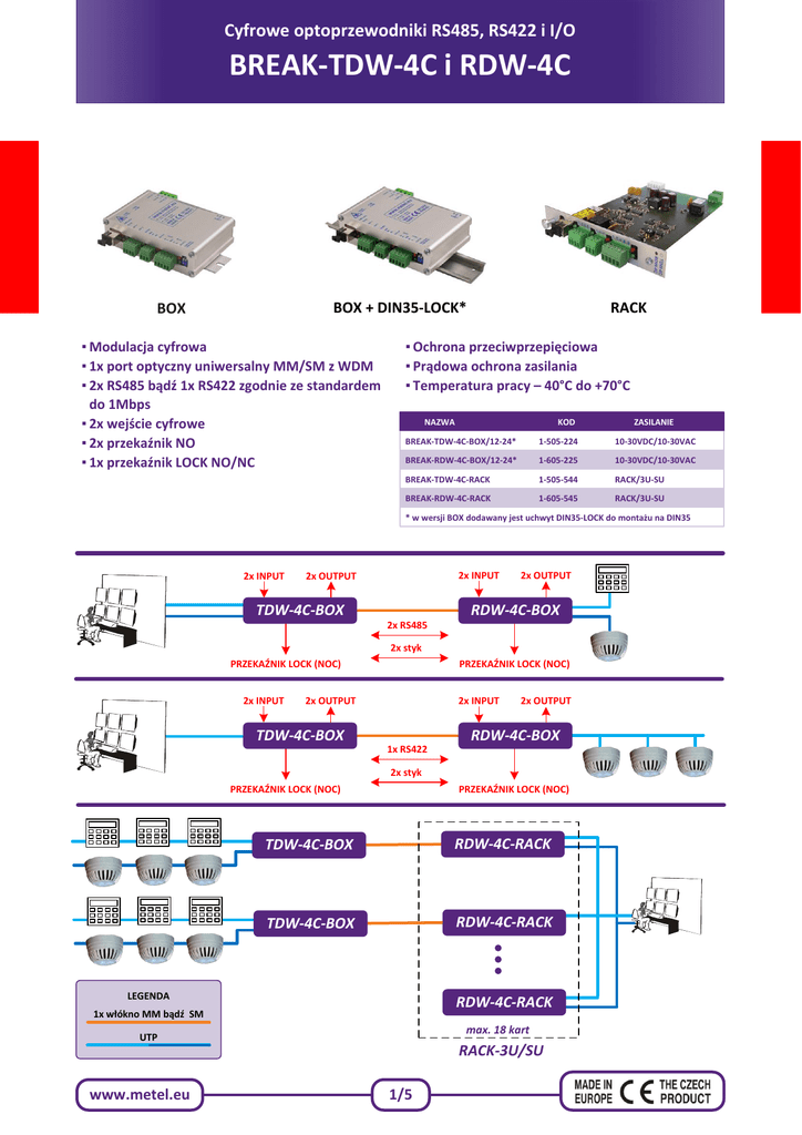 Cyfrowe optoprzewodniki RS485, RS422 i I/O BREAK-TDW-4C i RDW-4C BOX + DIN35-LOCK* BOX ▪ Modulacja cyfrowa ▪ 1x port optyczny uniwersalny MM/SM z WDM ▪ 2x RS485 bądź 1x RS422 zgodnie ze standardem do 1Mbps ▪ 2x wejście cyfrowe ▪ 2x przekaźnik NO ▪ 1x przekaźnik LOCK NO/NC RACK ▪ Ochrona przeciwprzepięciowa ▪ Prądowa ochrona zasilania ▪ Temperatura pracy – 40°C do +70°C BREAK-TDW-4C-RACK NAZWA 1-505-524 KOD RACK/3U-SU ZASILANIE BREAK-TDW-4C-BOX/12-24* 1-505-224 10-30VDC/10-30VAC BREAK-RDW-4C-RACK BREAK-RDW-4C-BOX/12-24* 1-605-525 1-605-225 RACK/3U-SU 10-30VDC/10-30VAC BREAK-TDW-4C-RACK 1-505-544 RACK/3U-SU BREAK-RDW-4C-RACK 1-605-545 RACK/3U-SU * w wersji BOX dodawany jest uchwyt DIN35-LOCK do montażu na DIN35 2x INPUT 2x INPUT 2x OUTPUT TDW-4C-BOX 2x OUTPUT RDW-4C-BOX 2x RS485 2x styk PRZEKAŹNIK LOCK (NOC) PRZEKAŹNIK LOCK (NOC) 2x INPUT 2x OUTPUT 2x INPUT TDW-4C-BOX 2x OUTPUT RDW-4C-BOX 1x RS422 2x styk PRZEKAŹNIK LOCK (NOC) PRZEKAŹNIK LOCK (NOC) TDW-4C-BOX RDW-4C-RACK TDW-4C-BOX RDW-4C-RACK LEGENDA RDW-4C-RACK 1x włókno MM bądź SM max. 18 kart UTP RACK-3U/SU www.metel.eu 1/5 Instrukcja instalacji REV:201212 BREAK-TDW-4C, BREAK-RDW-4C Cyfrowe konwertery światłowodowe RS485, RS422 i kontakty Opis i parametry techniczne Konwertery służą do przesyłania dwóch kanałów RS485 półdupleks lub jednego, czteroprzewodowego RS422. Oprócz transmisji danych możliwy jest także przesył stanów dwóch wejść cyfrowych na styki wyjściowe. Obustronna transmisja danych wraz z kontaktami odbywa się jednym włóknem światłowodowym singlemod lub multimod zakończonych konektorami typu SC wersja PC. Przy pomocy styku LOCK możemy monitorować awarię zdalnego urządzenia, przerwanie włókna lub brak zasilania. BUS Optyka Zasięg optyczny Parametry Wartość Jednostka Uwagi Ochrona przepięciowa 600 W puls 10/1000 μs Szybkość transmisji 1 Mbps Optyczna wydajność –14 do –8 / –10 do 0 dBm SM / MM Czułość –31 dBm SM / MM Włókna optyczne 1x SM 9/125 - konektor SC µm wersja PC 1x MM 50(62,5)/125 - SC konekt. SC µm wersja PC Multimode 6 km 50/125um Multimode 4 km 62,5/125um Singlemode 20 km 9/125um UWAGA: urządzenie posiada źródło światła laserowego kl.1 wg EN 60825-1-1 LOCK styk NOC kontakt max. 125VAC/0,5A 60VDC/0,3A OUTPUT styk 2x NO kontakt Zasilanie Napięcie 10-30 VDC-AC Prąd przy 12VDC Max. 100 mA Ochrona przepięciowa / prądowa 600W - puls 10/1000 μs / zwrotna Temperatura pracy –40..+70 °C Wilgotność max. 95 (niekondensacyjna) % Wymiary - sz / w / d 110 x 97 x 30 (37) mm Waga typ: 0,2 kg NC kontakt zwarty = komunikacja OK max. 125VAC/0,5A 60VDC/0,3A NO kontakt w stanie bez napięcia rozwarty Środowisko Budowa Producent zastrzega sobie prawo do zmian parametrów technicznych bez wcześniejszego uprzedzenia. www.metel.eu 2/5 temp. powietrza (z uchwytem DIN35) Instrukcja instalacji REV:201212 BREAK-TDW-4C, BREAK-RDW-4C Cyfrowe konwertery światłowodowe RS485, RS422 i kontakty Instalacja i ustawienia 1. Montaż urządzenia przymocować konwerter na równej powierzchni lub na szynie DIN35. 2. Podłączyć zasilanie 10-30VDC-AC podłączyć zasilanie wg rysunku poniżej. Podłączenie zasilanie jest sygnalizowane po przez zapalenie żółtej diody LED POWER. Ochrona przepięciowa uziemiana jest po przez zacisk GND, który należy połączyć z najbliższym punktem uziemienia przewodem o przekroju min.1,5mm2. 3. Podłączyć włókno światłowodu zakończone konektorem SC wersja PC. Po połączeniu TDW-4C i RDW-4C zgaśnie dioda LED LOCK. 4. Podłączyć przewody sygnałowe przewody sygnałowe należy podłączyć wg poniższych rysunków. Magistralę RS485 podłączyć do zacisków A+ i B-. Do transmisji RS422 służą pary zacisków BUS1 (odbiór) i BUS2 (wysyłanie). Na drugim konwerterze BUS 1 będzie dane wysyłał, a BUS 2 dane odbierał. Końce magistrali danych należy zakończyć oporem 120Ω po przez przełączenie zworki DIP w pozycje ON. Ekranowanie należy podłączyć tylko po jednej stronie do zacisku GND. TDW-4C Tx - 1310nm Rx - 1550nm 5. Podłączyć wejścia i styki wyjścia IN1, 2 - wejścia cyfrowe należy aktywować zwarciem do GND lub niskim poziomem TTL. OUT1, 2 - styk wyjścia max. obciążenie 125VAC/0,5A lub 60VDC/0,3A. Po aktywacji wejść styczniki zostaną zwarte. STYK LOCK - styk reagujący na stany awaryjne. Przeznaczony do podłączenia z systemem zabezpieczeń, do uruchamiania zasilania awaryjnego, itp. Opis funkcji poniżej. 6. Opis sygnalizacji LED PWR - zapalenie: detekcja zasilania LED LOCK - zapalenie: detekcja zwarcia styku - zapalenie: detekcja przerwania optyki - zapalenie: detekcja awarii zdalnego urządzenia BUS1,2 Rx/Tx - mruganie czerwonej diody LED Tx - wysyłanie danych - mruganie zielonej diody LED Rx - przyjmowanie danych W CELU ZAPEWNIENIA PRAWIDŁOWEJ PRACY OCHRONY PRZEPIĘCIOWEJ NALEŻY ZACISK GND(PE) UZIEMIĆ PRZEZ NAJBLIŻSZY PUNKT UZIEMIENIA RDW-4C Tx - 1550nm Rx - 1310nm PWR/LOCK 2x RELAY OUT O1/O2 polytron >OUT1 polytron >OUT2 2x INPUT IN1/IN2 TYPE: BREAK-TDW-4C-BOX/12-24 TYPE: BREAK-RDW-4C-BOX/12-24 GND CODE: 1-505-224 CODE: 1-605-225 IN1 IN2 STYK - Obciążenie maksymalne 125VAC/0,5A lub 60VDC/0,3A Rx1/Tx1 A+ B- 2x RS485 RS422 GND A+ B- BUS2 Tx BUS1 Rx ZAKOŃCZENIE MAGISTRALI ON = 120Ω www.metel.eu LOCK Rx2/Tx2 120R BUS1 120R BUS2 NO COM STAN AWARYJNY - BRAK ZASILANIA - AWARIA ZDALNEGO URZĄDZENIA - PRZERWANIE WŁÓKNA OPTYCZNEGO PODŁĄCZONE DO COM I NO. NC STAN PRACY - POD NAPIĘCIEM - KOMUNIKACJA ZE ZDALNYM URZĄDZENIEM - KOMUNIKACJA ŚWIATŁOWODEM OK PODŁĄCZONE DO COM I NC. 3/5 Instrukcja instalacji REV:201212 BREAK-TDW-4C, BREAK-RDW-4C Cyfrowe konwertery światłowodowe RS485, RS422 i kontakty DSC MAXSYS TDW-4C DSC MAXSYS PC4020 RED BLK YEL GRN FIBRE OPTIC SM 15km / MM 6km RED BLK YEL GRN DSC MAXSYS RDW-4C + 13,85 VDC - www.metel.eu 4/5 Instrukcja instalacji REV:201212 BREAK-TDW-4C, BREAK-RDW-4C Cyfrowe konwertery światłowodowe RS485, RS422 i kontakty 119,