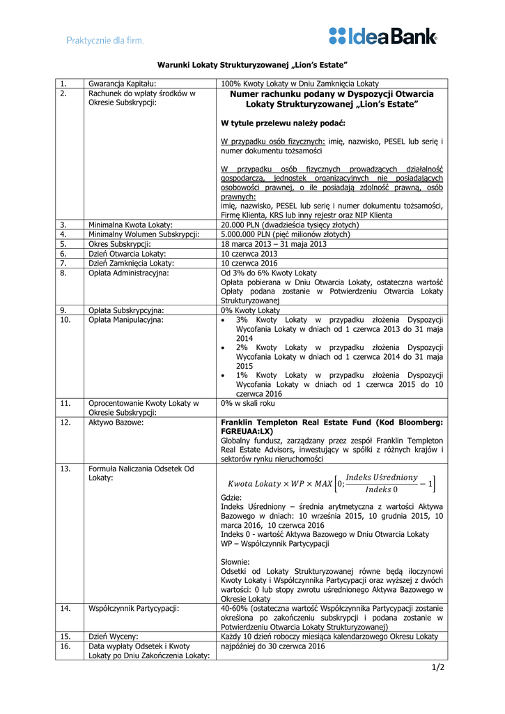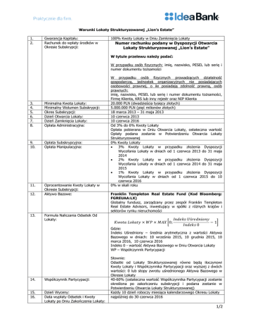 Warunki Lokaty Strukturyzowanej „Lion’s Estate” 1. 2. Gwarancja Kapitału: Rachunek do wpłaty środków w Okresie Subskrypcji: 100% Kwoty Lokaty w Dniu Zamknięcia Lokaty Numer rachunku podany w Dyspozycji Otwarcia Lokaty Strukturyzowanej „Lion’s Estate” W tytule przelewu należy podać: W przypadku osób fizycznych: imię, nazwisko, PESEL lub serię i numer dokumentu tożsamości 3. 4. 5. 6. 7. 8. Minimalna Kwota Lokaty: Minimalny Wolumen Subskrypcji: Okres Subskrypcji: Dzień Otwarcia Lokaty: Dzień Zamknięcia Lokaty: Opłata Administracyjna: 9. 10. Opłata Subskrypcyjna: Opłata Manipulacyjna: 11. Oprocentowanie Kwoty Lokaty w Okresie Subskrypcji: Aktywo Bazowe: 12. 13. Formuła Naliczania Odsetek Od Lokaty: W przypadku osób fizycznych prowadzących działalność gospodarczą, jednostek organizacyjnych nie posiadających osobowości prawnej, o ile posiadają zdolność prawną, osób prawnych: imię, nazwisko, PESEL lub serię i numer dokumentu tożsamości, Firmę Klienta, KRS lub inny rejestr oraz NIP Klienta 20.000 PLN (dwadzieścia tysięcy złotych) 5.000.000 PLN (pięć milionów złotych) 18 marca 2013 – 31 maja 2013 10 czerwca 2013 10 czerwca 2016 Od 3% do 6% Kwoty Lokaty Opłata pobierana w Dniu Otwarcia Lokaty, ostateczna wartość Opłaty podana zostanie w Potwierdzeniu Otwarcia Lokaty Strukturyzowanej 0% Kwoty Lokaty 3% Kwoty Lokaty w przypadku złożenia Dyspozycji Wycofania Lokaty w dniach od 1 czerwca 2013 do 31 maja 2014 2% Kwoty Lokaty w przypadku złożenia Dyspozycji Wycofania Lokaty w dniach od 1 czerwca 2014 do 31 maja 2015 1% Kwoty Lokaty w przypadku złożenia Dyspozycji Wycofania Lokaty w dniach od 1 czerwca 2015 do 10 czerwca 2016 0% w skali roku Franklin Templeton Real Estate Fund (Kod Bloomberg: FGREUAA:LX) Globalny fundusz, zarządzany przez zespół Franklin Templeton Real Estate Advisors, inwestujący w spółki z różnych krajów i sektorów rynku nieruchomości [ ] Gdzie: Indeks Uśredniony – średnia arytmetyczna z wartości Aktywa Bazowego w dniach: 10 września 2015, 10 grudnia 2015, 10 marca 2016, 10 czerwca 2016 Indeks 0 - wartość Aktywa Bazowego w Dniu Otwarcia Lokaty WP – Współczynnik Partycypacji 14. Współczynnik Partycypacji: 15. 16. Dzień Wyceny: Data wypłaty Odsetek i Kwoty Lokaty po Dniu Zakończenia Lokaty: Słownie: Odsetki od Lokaty Strukturyzowanej równe będą iloczynowi Kwoty Lokaty i Współczynnika Partycypacji oraz wyższej z dwóch wartości: 0 lub stopy zwrotu uśrednionego Aktywa Bazowego w Okresie Lokaty 40-60% (ostateczna wartość Współczynnika Partycypacji zostanie określona po zakończeniu subskrypcji i podana zostanie w Potwierdzeniu Otwarcia Lokaty Strukturyzowanej) Każdy 10 dzień roboczy miesiąca kalendarzowego Okresu Lokaty najpóźniej do 30 czerwca 2016 1/2 Ważne zastrzeżenia prawne Niniejszy materiał ma charakter wyłącznie reklamowy i informacyjny oraz nie stanowi oferty w rozumieniu ustawy z dnia 23 kwietnia 1964 r. Kodeksu Cywilnego. Informacje zawarte w niniejszym materiale nie mogą być traktowane, jako usługa doradztwa inwestycyjnego, podatkowego lub jako forma świadczenia pomocy prawnej. Idea Bank S.A. dołożył starań, aby zamieszczone w niniejszym materiale informacje były rzetelne oraz oparte na wiarygodnych źródłach. Wszystkie określenia pisane wielkimi literami maja znaczenie nadane im w „Regulaminie otwierania i prowadzenia rachunków lokat strukturyzowanych przez Idea Bank S.A.” („Regulamin”). Inwestowanie w instrumenty finansowe może się wiązać z konsekwencjami podatkowymi. W celu uzyskania szczegółowych informacji w zakresie opodatkowania zysków z inwestycji w instrumenty finansowe, Klient powinien zasięgnąć porady profesjonalnego doradcy podatkowego. Zyski z inwestycji w instrumenty finansowe podlegają opodatkowaniu na zasadach ogólnych. Bank nie ponosi żadnej odpowiedzialności za skutki podatkowe związane z inwestycją w instrumenty finansowe, w związku z czym podejmując decyzję inwestycyjną, Inwestor w celu uzyskania szczegółowych informacji w zakresie opodatkowania dochodów powinien zasięgnąć porady profesjonalnego doradcy podatkowego. Idea Bank S.A. oferując lokatę strukturyzowaną nie świadczy usług doradztwa inwestycyjnego, ani nie udziela porad inwestycyjnych lub rekomendacji zawarcia transakcji. Ostateczna decyzja, co do otwarcia lokaty strukturyzowanej oraz wielkości zaangażowanych środków należy wyłącznie do Klienta. Otwarcie Lokaty Strukturyzowanej wiąże się z opłatami, których wysokość i sposób pobierania zostały określone w niniejszych Warunkach oraz w Regulaminie. Inwestycja w Lokatę nie gwarantuje osiągniecia zysku. Ewentualny zysk z Lokaty Strukturyzowanej wynika ze zmiany wyceny Aktywa Bazowego. Kwota Lokaty podlega w całości, do wysokości nieprzekraczającej równowartości w złotych 100 000 euro ochronie w ramach Bankowego Funduszu Gwarancyjnego. Inwestowanie środków w Lokatę Strukturyzowaną wiąże się z ryzykiem, w szczególności z: - ryzykiem związanym ze spadkiem wartości Aktywa Bazowego. W Okresie Lokaty Wartość Bieżąca Lokaty Strukturyzowanej może ulegać znacznym wahaniom ze względu na zmiany wyceny Aktywa Bazowego, - ryzykiem kredytowym, które obejmuje ryzyko niewypłacalności emitentów instrumentów finansowych stanowiących Aktywo Bazowe lub wchodzących w skład Aktywa Bazowego, przez które należy rozumieć: a) sytuację finansową emitenta mogącą mieć negatywny wpływ na cenę wyemitowanych/ wystawionych instrumentów finansowych oraz Aktywa Bazowego; b) wystąpienia po stronie kontrahenta Banku trwałej lub czasowej niezdolności do obsługi zadłużenia, w tym do realizacji zobowiązań z tytułu transakcji zawartych na rynku finansowym dotyczących Aktywa Bazowego, -ryzykiem utraty części Kwoty Lokaty, w przypadku złożenia Dyspozycji Rezygnacji z Lokaty Strukturyzowanej przed końcem Okresu Lokaty ze względu na zmiany Wartości Bie