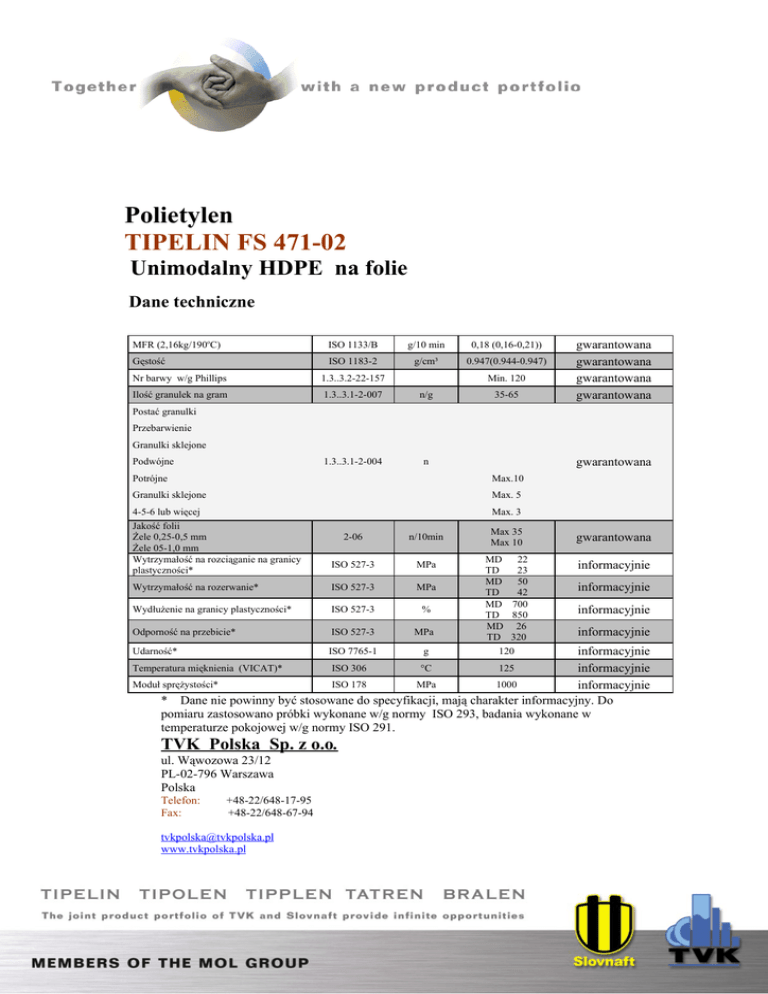 Polietylen TIPELIN FS 471-02 Unimodalny HDPE na folie Dane techniczne MFR (2,16kg/190oC) Gęstość ISO 1133/B g/10 min 0,18 (0,16-0,21)) ISO 1183-2 g/cm³ 0.947(0.944-0.947) Nr barwy w/g Phillips 1.3..3.2-22-157 Min. 120 Ilość granulek na gram 1.3..3.1-2-007 n/g 1.3..3.1-2-004 n 35-65 gwarantowana gwarantowana gwarantowana gwarantowana Postać granulki Przebarwienie Granulki sklejone Podwójne gwarantowana Potrójne Max.10 Granulki sklejone Max. 5 4-5-6 lub więcej Max. 3 Jakość folii Żele 0,25-0,5 mm Żele 05-1,0 mm Wytrzymałość na rozciąganie na granicy plastyczności* 2-06 n/10min ISO 527-3 MPa Wytrzymałość na rozerwanie* ISO 527-3 MPa Wydłużenie na granicy plastyczności* ISO 527-3 % Odporność na przebicie* ISO 527-3 MPa Max 35 Max 10 gwarantowana MD 22 TD 23 MD 50 TD 42 MD 700 TD 850 MD 26 TD 320 120 informacyjnie informacyjnie informacyjnie informacyjnie informacyjnie Temperatura mięknienia (VICAT)* ISO 306 °C 125 informacyjnie Moduł sprężystości* ISO 178 MPa 1000 informacyjnie * Dane nie powinny być stosowane do specyfikacji, mają charakter informacyjny. Do pomiaru zastosowano próbki wykonane w/g normy ISO 293, badania wykonane w temperaturze pokojowej w/g normy ISO 291. Udarność* ISO 7765-1 TVK Polska Sp. z o.o. ul. Wąwozowa 23/12 PL-02-796 Warszawa Polska Telefon: Fax: +48-22/648-17-95 +48-22/648-67-94 [email protected] www.tvkpolska.pl g