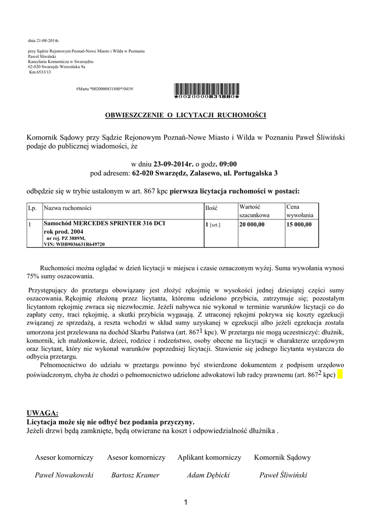 dnia 21-08-2014r. przy Sądzie Rejonowym Poznań-Nowe Miasto i Wilda w Poznaniu Paweł Śliwiński Kancelaria Komornicza w Swarzędzu 62-020 Swarzędz Wrzesińska 9a Km 6533/13 #Marta *0020000831880*/0419/ *0020000831880* OBWIESZCZENIE O LICYTACJI RUCHOMOŚCI Komornik Sądowy przy Sądzie Rejonowym Poznań-Nowe Miasto i Wilda w Poznaniu Paweł Śliwiński podaje do publicznej wiadomości, że w dniu 23-09-2014r. o godz. 09:00 pod adresem: 62-020 Swarzędz, Zalasewo, ul. Portugalska 3 odbędzie się w trybie ustalonym w art. 867 kpc pierwsza licytacja ruchomości w postaci: Lp. Nazwa ruchomości Ilość 1 Samochód MERCEDES SPRINTER 316 DCI rok prod. 2004 1 [szt.] Wartość szacunkowa 20 000,00 Cena wywołania 15 000,00 . nr rej. PZ 3889M, VIN: WDB9036631R649720 Ruchomości można oglądać w dzień licytacji w miejscu i czasie oznaczonym wyżej. Suma wywołania wynosi 75% sumy oszacowania. Przystępujący do przetargu obowiązany jest złożyć rękojmię w wysokości jednej dziesiątej części sumy oszacowania. Rękojmię złożoną przez licytanta, któremu udzielono przybicia, zatrzymuje się; pozostałym licytantom rękojmię zwraca się niezwłocznie. Jeżeli nabywca nie wykonał w terminie warunków licytacji co do zapłaty ceny, traci rękojmię, a skutki przybicia wygasają. Z utraconej rękojmi pokrywa się koszty egzekucji związanej ze sprzedażą, a reszta wchodzi w skład sumy uzyskanej w egzekucji albo jeżeli egzekucja została umorzona jest przelewana na dochód Skarbu Państwa (art. 8671 kpc). W przetargu nie mogą uczestniczyć: dłużnik, komornik, ich małżonkowie, dzieci, rodzice i rodzeństwo, osoby obecne na licytacji w charakterze urzędowym oraz licytant, który nie wykonał warunków poprzedniej licytacji. Stawienie się jednego licytanta wystarcza do odbycia przetargu. Pełnomocnictwo do udziału w przetargu powinno być stwierdzone dokumentem z podpisem urzędowo poświadczonym, chyba że chodzi o pełnomocnictwo udzielone adwokatowi lub radcy prawnemu (art. 8672 kpc) UWAGA: Licytacja może się nie odbyć bez podania przyczyny. Jeżeli drzwi będą zamknięte, będą otwierane na koszt i odpowiedzialność dłużnika . Asesor komorniczy Asesor komorniczy Aplikant komorniczy Komornik Sądowy Paweł Nowakowski Bartosz Kramer Adam Dębicki Paweł Śliwiński 1
