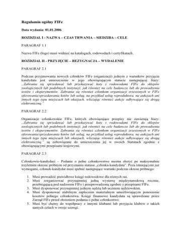 Regulamin ogólny FIFe Data wydania: 01.01.2006 ROZDZIAŁ I - NAZWA – CZAS TRWANIA – SIEDZIBA – CELE PARAGRAF 1.1 Nazwa FIFe (logo) musi widnieć na katalogach, rodowodach i certyfikatach. ROZDZIAŁ II - PRZYJĘCIE – REZYGNACJA – WYDALENIE PARAGRAF 2.1 Podczas przyjmowania nowych członków FIFe (organizacji) jednym z warunków przyjęcia kandydata jest umieszczenie w jego obowiązującym statucie następującej frazy: „Zabrania się sprzedawać lub przekazywać koty z rodowodami FIFe do sklepów zoologicznych lub podobnych instytucji, jak również na cele badawcze lub do prowadzenia testów i eksperymentów. Zabrania się również członkom organizacji zrzeszonych w FIFe oferowania/sprzedawania kotów lub usług, na przykład usług reproduktora, na aukcjach ani innych tego typu miejscach lub okazjach, wliczając również aukcje odbywające się drogą elektroniczną.” PARAGRAF 2.2 Organizacje członkowskie FIFe, których obowiązujące przepisy nie zawierają frazy: „Zabrania się sprzedawać lub przekazywać koty z rodowodami FIFe do sklepów zoologicznych lub podobnych instytucji, jak również na cele badawcze lub do prowadzenia testów i eksperymentów. Zabrania się również członkom organizacji zrzeszonych w FIFe oferowania/sprzedawania kotów lub usług, na przykład usług reproduktora, na aukcjach ani innych tego typu miejscach lub okazjach, wliczając również aukcje odbywające się drogą elektroniczną.” są zobowiązane do umieszczenia jej w swoich Statutach zgodnie z obowiązującymi przepisami krajowymi. PARAGRAF 2.3 Członkowie-kandydaci – Podanie o pełne członkowstwo można złożyć po maksymalnie trzyletnim okresie próbnym od przyznania statusu „członka-kandydata”. Poza istniejącymi już wymogami, członek-kandydat musi spełnić następujące warunki podczas okresu próbnego: 1. Musi prowadzić prawidłowe księgi rodowodowe dla różnych ras. 2. Musi zorganizować przynajmniej jedną wystawę międzynarodową rocznie, przebiegającą pod nadzorem FIFe i przeprowadzoną zgodnie z przepisami FIFe. 3. Musi dysponować przynajmniej jednym sędzią lub uczniem sędziowskim. 4. Musi dysponować stabilnym zapleczem materialnym umożliwiającym ponoszenie kosztów pełnego członkostwa. Księgi finansowe kandydata są sprawdzane przez Zarząd FIFe przed złożeniem podania o pełne członkostwo. 5. Musi być chętny do współpracy z innymi klubami lub przyjęcia klubów o takich samych celach w swoje szeregi. PARAGRAF 2.4 Obowiązki mentora w stosunku do członka-kandydata są następujące: 1. Mentor zapewnia, że na wszystkich wystawach organizowanych przez członkakandydata podczas okresu próbnego będzie obecny jako obserwator przynajmniej jeden sędzia, będący członkiem Zarządu, komisji ds. sędziów lub komisji ds. wystaw. Obserwator ma prawo sprawdzić wszelkie dokumenty związane z wystawą, w razie potrzeby przybywając wcześniej na miejsce wystawy. Sędzia jest zobowiązany następnie do złożenia szczegółowego raportu dotyczącego wystawy, zawierającego wszelkie zalecenia. Raport jest przesyłany do komisji ds. wystaw, mentora i Zarządu FIFe 2. Mentor nadzoruje działalność kandydata, interweniując i służąc radą w razie potrzeby. 3. Jeśli zaistnieje konieczność wizyty mentora w kraju kandydata w celu udzielenia rad i wskazówek, odpowiedzialność za pokrycie kosztów takiej wizyty musi być ustalona z góry. 4. Mentor co roku sporządza pisemny raport dotyczący kandydata, przedstawiany Walnemu Zebraniu FIFe. Raport należy przesłać 60 dni przed wyznaczoną datą Walnego Zebrania do Sekretarza Generalnego FIFe. Następnie raport zostanie rozesłany do wszystkich członków wraz z planem Walnego Zebrania. 5. Mentor jest zobowiązany pomóc kandydatowi w organizacji seminarium dla wszystkich członków kandydata. 6. Mentor ma prawo wycofać się z patronatu nad kandydatem w razie niedostatecznych postępów kandydata. Mentor jest zobowiązany ogłosić swoją decyzję na Walnym Zebraniu FIFe wraz z uzasadnieniem. PARAGRAF 2.5 Członek FIFe może, na podstawie zalecenia wydanego przez Zarząd FIFe, przyjmować jako członków osoby fizyczne z innych krajów, niezależnie od tego, czy w danym kraju działa inny członek FIFe czy nie. PARAGRAF 2.6 Statuty organizacji członkowskich muszą być przesyłane w oryginale lub uwierzytelnionych kopiach. ROZDZIAŁ III - ADMINISTRACJA PARAGRAF 3.1 Prezydent FIFe i przewodniczący komisji zwołują posiedzenia Zarządu i komisji z odpowiednim wyprzedzeniem: • • • • • Zarząd FIFe 30 dni Komisja dyscyplinarna 30 dni Komisja ds. sędziów 21 dni Komisja ds. wystaw 14 dni Inne komisje 14 dni PARAGRAF 3.2 Wszystkie oficjalne dokumenty FIFe, w tym regulaminy: kompletne standardy, przepisy dotyczące stewardów, uczniów sędziowskich i sędziów, przepisy wystawowe, lista kodów EMS odmian kolorystycznych/ras, lista adresów sędziów FIFe oraz członków/komisji, kompletne repertorium pytań z egzaminów sędziowskich, harmonogram wystaw itd, są udostępniane każdemu członkowi FIFe na żądanie i bezpłatnie w trzech oficjalnych językach FIFe, na nośnikach elektronicznych – dyskietkach – przez F.I.Fe lub upoważnione komisje/grupy robocze/osoby. PARAGRAF 3.3 1. Wszystkie pisma, włącznie z listami i/lub faksami, e-mailami, protokołami, wysyłane przez Zarząd FIFe, mogą być w języku angielskim. 2. Komunikacja z Zarządem FIFe odbywa się w jednym z trzech oficjalnych języków FIFe. 3. Przepisy dotyczące języków egzaminów sędziowskich oraz ocen sędziowskich pozostają bez zmian. 4. Walne Zebranie odbywa się w jednym z trzech oficjalnych języków, podlega również tłumaczeniu symultanicznemu. Propozycje i wnioski na Walne Zebranie muszą być składane w jednym z trzech języków oficjalnych FIFe. ROZDZIAŁ IV - WALNE ZEBRANIE PARAGRAF 4.1 Podczas Walnego Zebrania członkowie Zarządu FIFe mogą wyrażać swoje opinie dotyczące wszystki
