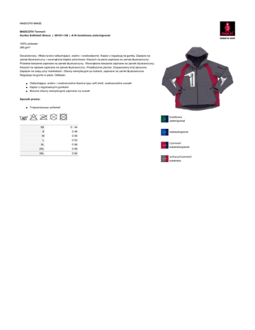 MASCOT® IMAGE MASCOT® Termoli Kurtka Softshell Strecz | 08101-138 | A10 butelkowa zieleń/granat 100% poliester 290 g/m² Dwukolorowy. Właściwości oddychające, wiatro- i wodoodporne. Kaptur z regulacją na gumkę. Zapięcie na zamek błyskawiczny i wewnętrzna klapka sztormowa. Kieszeń na piersi zapinana na zamek błyskawiczny. Przednie kieszenie zapinane na zamek błyskawiczny. Wewnętrzne kieszenie zapinane na zamek błyskawiczny. Kieszeń na rękawie zapinana na zamek błyskawiczny. Przedłużenie pleców. Dopasowany krój rękawów. Zapięcie na rzepy przy mankietach. Otwory wentylacyjne po bokach, zapinane na zamki błyskawiczne. Regulacja na gumki w pasie. Odblaski. l Oddychająca, wiatro- i wodoszczelna tkanina typu soft shell, wodoszczelne suwaki l Kaptur z regulowanymi gumkami l Boczne otwory wentylacyjne zapinane na suwak Sposób prania: l Trójwarstwowy softshell. butelkowa zieleń/granat XS C44 S C 46 M C 50 L C 52 XL C 56 2XL C 58 3XL C 62 niebieski/granat czerwień kubańska/granat antracyt/czerwień kubańska