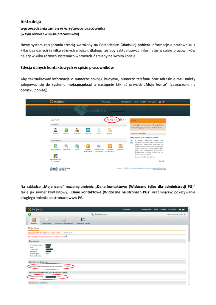 Instrukcja wprowadzania zmian w wizytówce pracownika (w tym również w spisie pracowników) Nowy system zarządzania treścią wdrożony na Politechnice Gdańskiej pobiera informacje o pracowniku z kilku baz danych (z kilku różnych miejsc), dlatego też aby zaktualizować informacje w spisie pracowników należy w kilku różnych systemach wprowadzić zmiany na swoim koncie. Edycja danych kontaktowych w spisie pracowników Aby zaktualizować informacje o numerze pokoju, budynku, numerze telefonu oraz adresie e-mail należy zalogować się do systemu moja.pg.gda.pl a następnie kliknąć przycisk „Moje konto” (zaznaczone na obrazku poniżej). Na zakładce „Moje dane” możemy zmienić „Dane kontaktowe (Widoczne tylko dla administracji PG)” takie jak numer kontaktowy, „Dane kontaktowe (Widoczne na stronach PG)” oraz włączyć pokazywanie drugiego imienia na stronach www PG. Trzeba niestety pamiętać, że adres e-mail w domenie pg.gda.pl będzie zawsze dostępny w spisie pracowników. Aby uniknąć problemów związanych z ewentualnym przesłaniem informacji na przykładowy adres „[email protected]” należy odbierać również pocztę z domeny pg.gda.pl. Aby uniknąć tego problemu można zalogować się na stronie „poczta.pg.gda.pl” a następnie w konfiguracji poczty PG włączyć przekazywanie poczty na adres poczty w domenie „zie.pg.gda.pl” np. „[email protected]”. Adres w domenie pg.gda.pl może być na stronach www PG wyświetlany na dwa sposoby, w postaci [email protected] lub [email protected]. Aby wybrać sposób wyświetlania adresu PG należy w zaznaczonym poniżej na czerwono polu kliknąć przycisk „Zmień” Następnie z listy rozwijalnej zaznaczonej poniżej na czerwono wybrać odpowiednią prezentację adresu email i kliknąć przycisk „Zapisz”. W tej samej sekcji możemy zmienić również dane takie jak pokój, budynek, numer telefonu oraz wpisać wydziałowy adres e-mail. Należy pamiętać, że zgodnie z założeniami systemu za wszelkie zmiany tych informacji odpowiada pracownik. Tylko ona ma możliwość wprowadzania tych zmian na stronie www logując się do systemu moja.pg.gda.pl. Aby wprowadzić powyższe zmiany w polu zaznaczonym poniżej czerwoną ramką klikamy przycisk „Edytuj”. Następnie z listy rozwijalnej wybieramy budynek, numer pokoju, wpisujemy telefon kontaktowy oraz wydziałowy adres e-mail a następnie klikamy przycisk „Zapisz”. Poniżej znajduje się przydatna sekcja „Otrzymywanie wiadomości SMS”, warto podać tutaj numer telefonu komórkowego oraz zaznaczyć pole „Wyrażam zgodę na reset hasła poprzez wysłanie kodu SMS na wskazany numer telefonu komórkowego”. W ten sposób w każdej chwili można szybko odzyskać zapomniane lub nieaktualne hasło do konta moja.pg bez konieczności wizyty w CUI, otrzymując jedynie weryfikujący kod sms. Aby wprowadzić powyższe zmiany klikamy przycisk „Edytuj” w ramce zaznaczonej poniżej na czerwono wprowadzamy zmiany i na koniec klikamy przycisk „Zapisz”. Edycja wizytówki w spisie pracowników. Zmiany w wizytówce pracownika dotyczą podania jego adresu strony domowej, wprowadzenia informacji dla studentów oraz notki biograficznej. W wizytówce można również włączyć elementy takie jak blog, publikacje, badania, kalendarz, konferencje, informacje oraz plan. Niestety funkcjonalność wizytówki nie została jeszcze w pełni zaimplementowana, nie wiadomo też kiedy CUI uruchomi ją w pełni. Aby wprowadzić zmiany w wizytówce należy otworzyć stronę www.zie.pg.edu.pl a następnie w jej prawym górnym rogu kliknąć przycisk „Zaloguj”. Otworzy się taka sama strona jak przy logowaniu do moja.pg. Do systemu logujemy się przy użyciu tego samego loginu oraz hasła co do moja.pg. Po poprawnym zalogowaniu zostanie ponownie otworzona strona www.zie.pg.edu.pl. Po poprawnym zalogowaniu w górnej części strony pojawi się pasek narzędzi z przyciskami (od lewej: Dodaj, Zarządzaj, Kontrolki edycji, Przeglądaj jako, Przejdź do). Klikamy przycisk „Przejdź do” następnie z listy rozwijalnej wybieramy polecenie „Moja wizytówka”, jak na rysunku poniżej. Ponownie klikamy przycisk „Przejdź do” tym razem wybierając z listy polecenie „Panel sterowania”, jak na rysunku poniżej. Otworzy się okno „Panelu sterowania”, w tym miejscu należy uzbroić się w nieco cierpliwości gdyż sam panel sterowania funkcjonuje dość wolno. Proszę zwrócić uwagę czy na przycisku (na rysunku poniżej zaznaczony na czerwono) wybrana jest „Witryna osobista…”, jeżeli nie należy kliknąć ten przycisk i z dostępnych opcji wybrać witrynę osobistą. Z lewej strony panelu sterowania znajduje się pionowe menu w którym zobaczymy przykładowe pozycje: Moje konto, Ustawienia konta prywatnego, Przycisk wyboru aktywnej witryny, Zarządzania stronami, Zawartość stron, Dokumenty, Blogi. W menu „Moje konto” możemy zmienić zdjęcie profilowe wyświetlane w spisie pracowników oraz wizytówce strony. W menu „Ustawienia konta prywatnego” możemy wprowadzić adres strony domowej wyświetlany w spisie pracowników oraz wizytówce pracownika. Możemy również ustalić czy miejsce pracy ma być widoczne dla użytkowników zalogowanych oraz nie zalogowanych. Przewijając stronę możemy wprowadzić wiadomość dla studentów jak również notkę biograficzną widoczną w spisie pracowników oraz w wizytówce pracownika. Możemy też określić czy te elementy maja być widoczne dla użytkowników zalogowanych oraz nie zalogowanych. Poniżej możemy ustalić czy zdjęcie na stronie wizytówki będzie widoczne dla użytkowników zalogowanych oraz nie zalogowanych. Nieco poniżej znajduje się konfiguracja strony domowej użytkownika. Mamy tutaj możliwość uruchomienia bloga, włączenia publikacji, planu zajęć, listy badań naukowych, listy konferencji, kalendarza czy strony informacyjnej. Szanowni Państwo, niektóre z wprowadzon