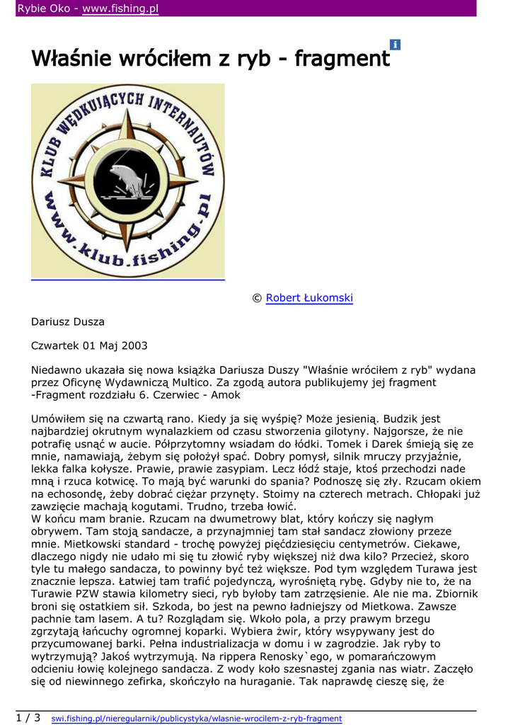 Rybie Oko - www.fishing.pl Właśnie wróciłem z ryb - fragment © Robert Łukomski Dariusz Dusza Czwartek 01 Maj 2003 Niedawno ukazała się nowa książka Dariusza Duszy "Właśnie wróciłem z ryb" wydana przez Oficynę Wydawniczą Multico. Za zgodą autora publikujemy jej fragment -Fragment rozdziału 6. Czerwiec - Amok Umówiłem się na czwartą rano. Kiedy ja się wyśpię? Może jesienią. Budzik jest najbardziej okrutnym wynalazkiem od czasu stworzenia gilotyny. Najgorsze, że nie potrafię usnąć w aucie. Półprzytomny wsiadam do łódki. Tomek i Darek śmieją się ze mnie, namawiają, żebym się położył spać. Dobry pomysł, silnik mruczy przyjaźnie, lekka falka kołysze. Prawie, prawie zasypiam. Lecz łódź staje, ktoś przechodzi nade mną i rzuca kotwicę. To mają być warunki do spania? Podnoszę się zły. Rzucam okiem na echosondę, żeby dobrać ciężar przynęty. Stoimy na czterech metrach. Chłopaki już zawzięcie machają kogutami. Trudno, trzeba łowić. W końcu mam branie. Rzucam na dwumetrowy blat, który kończy się nagłym obrywem. Tam stoją sandacze, a przynajmniej tam stał sandacz złowiony przeze mnie. Mietkowski standard - trochę powyżej pięćdziesięciu centymetrów. Ciekawe, dlaczego nigdy nie udało mi się tu złowić ryby większej niż dwa kilo? Przecież, skoro tyle tu małego sandacza, to powinny być też większe. Pod tym względem Turawa jest znacznie lepsza. Łatwiej tam trafić pojedynczą, wyrośniętą rybę. Gdyby nie to, że na Turawie PZW stawia kilometry sieci, ryb byłoby tam zatrzęsienie. Ale nie ma. Zbiornik broni się ostatkiem sił. Szkoda, bo jest na pewno ładniejszy od Mietkowa. Zawsze pachnie tam lasem. A tu? Rozglądam się. Wkoło pola, a przy prawym brzegu zgrzytają łańcuchy ogromnej koparki. Wybiera żwir, który wsypywany jest do przycumowanej barki. Pełna industrializacja w domu i w zagrodzie. Jak ryby to wytrzymują? Jakoś wytrzymują. Na rippera Renosky`ego, w pomarańczowym odcieniu łowię kolejnego sandacza. Z wody koło szesnastej zgania nas wiatr. Zaczęło się od niewinnego zefirka, skończyło na huraganie. Tak naprawdę cieszę się, że 1/3 swi.fishing.pl/nieregularnik/publicystyka/wlasnie-wrocilem-z-ryb-fragment Rybie Oko - www.fishing.pl wracamy. W końcu będę mógł się spokojnie wyspać. Budzi mnie telefon. O, już dziesiąta na zegarku. Może nie podnosić? Ale dzwoni i dzwoni, namolny jak akwizytor. - Hallo - rzucam do słuchawki z nadzieją, że dzwoniący usłyszy "czego?". Kolejny nawiedzony wędkarz. Czy ja nie mogę mieć normalnych kolegów? Takich, którzy mieliby normalne zainteresowania. Przecież można pasjonować się... No właśnie, czym? O już wiem, na przykład piłką nożną. Albo koszykówką. Tylko, że mnie te dyscypliny zupełnie nie interesują. Tak samo jak nie interesuje mnie zbieranie znaczków, grzebanie w ziemi (działka), majsterkowanie i wiele innych czynności, którymi naród zajmuje się po godzinach. Jestem wędkarzem. I`m a fisherman. Ich bin... Dobra, czego ten maniak chce ode mnie. Na jakie ryby? Oszalał. Przecież dopiero co wróciłem. Ale Tomek (inny, niż ten z Mietkowa) łatwo się nie poddaje. Powoli dawkuje truciznę, którą wchłaniam, słuchając jego słów. Niebezpiecznych słów. Sandacz, okoń. Nie wódź mnie na pokuszenie. Ale czuję, że mój opór jest coraz słabszy, bardziej dla zasady. © Dariusz Dusza O trzeciej wsiadam do auta. Taki jestem. Pocieszam się, że przecież jesienią tyle nie jeżdżę, że te wszystkie pilne sprawy mogą jeszcze dzień poczekać. Może nie jestem wzorem obowiązkowości. Trudno, nie można być chodzącym ideałem. Mam za to wiele innych zalet. Jakich? Na przykład zawsze przed łowieniem sprawdzam ustawienie hamulca. Czy to nie wybitna zaleta? Idziemy na pierwsze ostrogi. W lesie pełno komarów. Na szczęście dawka repelenta skutecznie je zniechęca. Nie byłem w tym miejscu od zeszłej zimy. Wtedy sandacze brały jak szalone. Ale teraz? Tak się jakoś składa, że sandacz to ryba pierwszych rzutów. Jak jest, to powinien skoczyć. Nie skacze, ani na pierwszej, ani na drugiej ostrodze. Może to przez tę mętną, wysoką wodę? Nie wiem. Dopiero na trzeciej główce łowię dwie kerguleny. Tomkowi idzie lepiej. Złowił przyzwoitego bolenia. Ale ja zawziąłem się na sandacze. Pod samą główką mam mocne branie z opadu. Podcinam, ale z dużym opóźnieniem. Nie te lata, nie ten refleks. Wędka wygina się do granic wytrzymałości. Co jest? Sum? Lecz dziwnie się broni, odchodzi na boki. W końcu widzę ładnego sandacza z ripperem wbitym w brzuch. Uwalniam go za pomocą szczypiec. Podczepiony, nie liczy się. Lecz oglądam gumę i widzę na niej wyraźne, głębokie ślady sandaczowych zębów. A przecież założyłem nowego rippera. Czyżbym aż tak spóźnił branie? Chyba tak. Zaciąłem dopiero wtedy, gdy sandacz wypuścił przynętę i odpływał. Moje najszczersze gratulacje! Z takim refleksem to można łowić jazie, a nie mętnookie. Zresztą i tak nie ma brań. Z nudów zakładam małego, pękatego woblera. Ciekawe, czy coś połakomi się na seledynową Alaskę? Odpowiedź brzmi: okoń. Całkiem nieźle biorą. O dziwo, im mętna woda nie przeszkadza. Po kilkunastu rybach mam dość. Tomek też. Postanawiamy zmienić łowisko. 2/3 swi.fishing.pl/nieregularnik/publicystyka/wlasnie-wrocilem-z-ryb-fragment Rybie Oko - www.fishing.pl Dariusz Dusza Inne tego autora: Dariusz Dusza » więcej... Lista artykułów, zdjęć, plików, linków ... itd. powiązanych z tą pozycją Tematyka: Inna » Nie święci garnki lepią czyli.. Tworzeniu Sztucznych Much” Podsumowanie wyników „Mistrzostw Polski w UWAGA - Konkurs!!! Dyskusje i recenzje Dodaj wypowied 3/3 swi.fishing.pl/nieregularnik/publicystyka/wlasnie-wrocilem-z-ryb-fragment