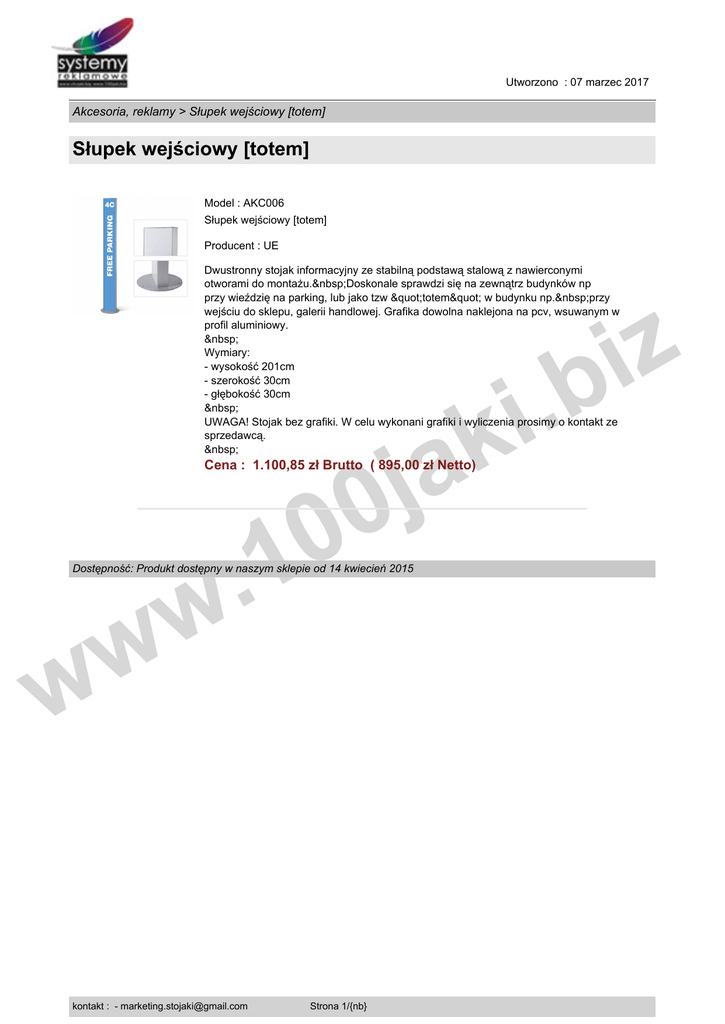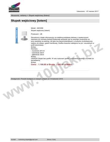 Utworzono : 07 marzec 2017 Akcesoria, reklamy > Słupek wejściowy [totem] Słupek wejściowy [totem] Model : AKC006 Słupek wejściowy [totem] Producent : UE Dwustronny stojak informacyjny ze stabilną podstawą stalową z nawierconymi otworami do montażu. Doskonale sprawdzi się na zewnątrz budynków np przy wieździę na parking, lub jako tzw "totem" w budynku np. przy wejściu do sklepu, galerii handlowej. Grafika dowolna naklejona na pcv, wsuwanym w profil aluminiowy. Wymiary: - wysokość 201cm - szerokość 30cm - głębokość 30cm UWAGA! Stojak bez grafiki. W celu wykonani grafiki i wyliczenia prosimy o kontakt ze sprzedawcą. a j 0 i k Cena : 1.100,85 zł Brutto ( 895,00 zł Netto) 0 1 . w w Dostępność: Produkt dostępny w naszym sklepie od 14 kwiecień 2015 w kontakt : - [email protected] Strona 1/{nb} z i .b