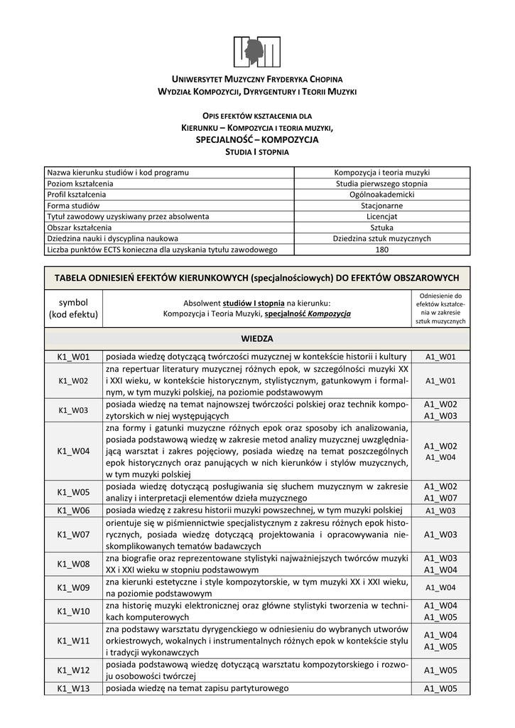 UNIWERSYTET MUZYCZNY FRYDERYKA CHOPINA WYDZIAŁ KOMPOZYCJI, DYRYGENTURY I TEORII MUZYKI OPIS EFEKTÓW KSZTAŁCENIA DLA KIERUNKU – KOMPOZYCJA I TEORIA MUZYKI, SPECJALNOŚĆ – KOMPOZYCJA STUDIA I STOPNIA Nazwa kierunku studiów i kod programu Poziom kształcenia Profil kształcenia Forma studiów Tytuł zawodowy uzyskiwany przez absolwenta Obszar kształcenia Dziedzina nauki i dyscyplina naukowa Liczba punktów ECTS konieczna dla uzyskania tytułu zawodowego Kompozycja i teoria muzyki Studia pierwszego stopnia Ogólnoakademicki Stacjonarne Licencjat Sztuka Dziedzina sztuk muzycznych 180 TABELA ODNIESIEŃ EFEKTÓW KIERUNKOWYCH (specjalnościowych) DO EFEKTÓW OBSZAROWYCH symbol (kod efektu) Absolwent studiów I stopnia na kierunku: Kompozycja i Teoria Muzyki, specjalność Kompozycja Odniesienie do efektów kształcenia w zakresie sztuk muzycznych WIEDZA K1_W01 K1_W02 K1_W03 K1_W04 K1_W05 K1_W06 K1_W07 K1_W08 K1_W09 K1_W10 K1_W11 K1_W12 K1_W13 posiada wiedzę dotyczącą twórczości muzycznej w kontekście historii i kultury zna repertuar literatury muzycznej różnych epok, w szczególności muzyki XX i XXI wieku, w kontekście historycznym, stylistycznym, gatunkowym i formalnym, w tym muzyki polskiej, na poziomie podstawowym posiada wiedzę na temat najnowszej twórczości polskiej oraz technik kompozytorskich w niej występujących zna formy i gatunki muzyczne różnych epok oraz sposoby ich analizowania, posiada podstawową wiedzę w zakresie metod analizy muzycznej uwzględniającą warsztat i zakres pojęciowy, posiada wiedzę na temat poszczególnych epok historycznych oraz panujących w nich kierunków i stylów muzycznych, w tym muzyki polskiej posiada wiedzę dotyczącą posługiwania się słuchem muzycznym w zakresie analizy i interpretacji elementów dzieła muzycznego posiada wiedzę z zakresu historii muzyki powszechnej, w tym muzyki polskiej orientuje się w piśmiennictwie specjalistycznym z zakresu różnych epok historycznych, posiada wiedzę dotyczącą projektowania i opracowywania nieskomplikowanych tematów badawczych zna biografie oraz reprezentowane stylistyki najważniejszych twórców muzyki XX i XXI wieku w stopniu podstawowym zna kierunki estetyczne i style kompozytorskie, w tym muzyki XX i XXI wieku, na poziomie podstawowym zna historię muzyki elektronicznej oraz główne stylistyki tworzenia w technikach komputerowych zna podstawy warsztatu dyrygenckiego w odniesieniu do wybranych utworów orkiestrowych, wokalnych i instrumentalnych różnych epok w kontekście stylu i tradycji wykonawczych posiada podstawową wiedzę dotyczącą warsztatu kompozytorskiego i rozwoju osobowości twórczej posiada wiedzę na temat zapisu partyturowego A1_W01 A1_W01 A1_W02 A1_W03 A1_W02 A1_W04 A1_W02 A1_W07 A1_W03 A1_W03 A1_W03 A1_W04 A1_W04 A1_W04 A1_W05 A1_W04 A1_W05 A1_W05 A1_W05 K1_W14 K1_W15 K1_W16 K1_W17 K1_W18 K1_W19 K1_W20 K1_W21 K1_W22 K1_W23 posiada wiedzę z zakresu instrumentacji oraz możliwości wykorzystania poszczególnych instrumentów zna najnowsze technologie stosowane w twórczości muzycznej, w tym programy komputerowe do tworzenia muzyki zna podstawy technologii informacyjnej w teorii i praktyce zna podstawy akustyki muzycznej, empirycznych badań nad zjawiskami muzycznymi, wybrane zagadnienia z filozofii oraz sztuki posiada wiedzę dotyczącą prawnych aspektów zawodu kompozytora, ze szczególnym uwzględnieniem prawa autorskiego zna podstawy gry na instrumencie innym niż fortepian (wybór należy do studenta) ma ogólnohumanistyczną wiedzę niezbędną dla każdego muzyka zna wzorce leżące u podstaw improwizacji w zakresie form mogących mieć zastosowanie w procesie prekompozycji posiada przygotowanie merytoryczne do pracy w szkolnictwie muzycznym I stopnia (przygotowanie pedagogiczne – po ukończeniu studium pedagogicznego) ma ugruntowaną wiedzę w zakresie harmonii, zna środki harmoniczne i rozumie ich znaczenie w dziele muzycznym A1_W05 A1_W05 A1_W05 A1_W05 A1_W06 A1_W07 A1_W07 A1_W08 A1_W09 A1_W02 UMIEJĘTNOŚCI K1_U01 K1_U02 K1_U03 K1_U04 K1_U05 K1_U06 K1_U07 K1_U08 K1_U09 K1_U10 K1_U11 tworzy kompozycje muzyczne przeznaczone na różne składy instrumentalne w oparciu o własne predyspozycje twórcze i warsztat kompozytorski posiada umiejętność instrumentowania utworów solowych i kameralnych na większe zespoły instrumentalne, w tym orkiestry z uwzględnieniem stylowego wykorzystania grup orkiestrowych i instrumentów potrafi zastosować wybrane techniki kompozytorskie XX i XXI wieku we własnej twórczości oraz analizie i interpretacji posiada umiejętność tworzenia form polifonicznych, stosowania różnych technik polifonicznych we własnych konstrukcjach dźwiękowych, rozpoznawania technik polifonicznych stosowanych w utworach różnych epok, w szczególności technik polifonicznych kompozytorów muzyki XX i XXI wieku posiada umiejętność realizowania i tworzenia konstrukcji harmonicznych korzystając ze środków właściwych dla danego systemu harmonicznego, a w szczególności środków XX i XXI wieku posiada umiejętność dyrygowania z wykorzystywaniem podstaw warsztatu dyrygenckiego dziełami orkiestrowymi, chóralnymi i kameralnymi w zakresie podstawowym opanował w stopniu podstawowym technikę tworzenia muzyki przy pomocy komputera oraz umiejętności tworzenia kompozycji dźwiękowych w utrwalonym medium potrafi realizować zadania artystyczne w zespole wokalnym i instrumentalnym potrafi wykorzystać zdobytą wiedzę do identyfikacji i analizy dzieł muzycznych, potrafi wskazać cechy stylistyczne typowe dla poszczególnych twórców, kierunków i epok, posiada umiejętność orientacji w literaturze muzycznej, historii muzyki oraz stylów kompozytorskich różnych epok historycznych, w tym muzyki polskiej posiada umiejętność stosowania zasad harmonii funkcyjnej i niefunkcyjnej w tworzeniu i analizowaniu konstrukcji dźwiękowych posiada umiejętność przygotowywania i wykonywania utworów instrumentalnych 