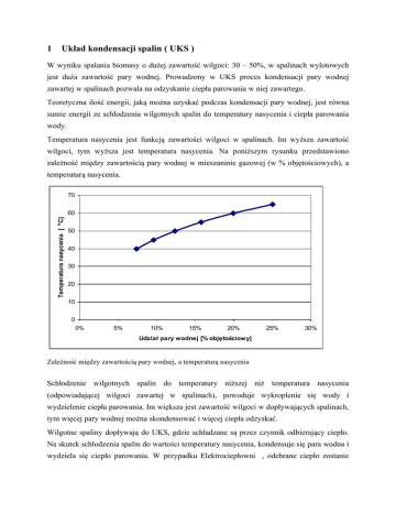1 Układ kondensacji spalin ( UKS ) W wyniku spalania biomasy o dużej zawartość wilgoci: 30 – 50%, w spalinach wylotowych jest duża zawartość pary wodnej. Prowadzony w UKS proces kondensacji pary wodnej zawartej w spalinach pozwala na odzyskanie ciepła parowania w niej zawartego. Teoretyczna ilość energii, jaką można uzyskać podczas kondensacji pary wodnej, jest równa sumie energii ze schłodzenia wilgotnych spalin do temperatury nasycenia i ciepła parowania wody. Temperatura nasycenia jest funkcją zawartości wilgoci w spalinach. Im wyższa zawartość wilgoci, tym wyższa jest temperatura nasycenia. Na poniższym rysunku przedstawiono zależność między zawartością pary wodnej w mieszaninie gazowej (w % objętościowych), a temperaturą nasycenia. 70 Temperatura nasycenia [ o C] 60 50 40 30 20 10 0 0% 5% 10% 15% 20% 25% 30% Udział pary wodnej [% objętościowy] Zależność między zawartością pary wodnej, a temperaturą nasycenia Schłodzenie wilgotnych spalin do temperatury niższej niż temperatura nasycenia (odpowiadającej wilgoci zawartej w spalinach), powoduje wykroplenie się wody i wydzielenie ciepła parowania. Im większa jest zawartość wilgoci w dopływających spalinach, tym więcej pary wodnej można skondensować i więcej ciepła odzyskać. Wilgotne spaliny dopływają do UKS, gdzie schładzane są przez czynnik odbierający ciepło. Na skutek schłodzenia spalin do wartości temperatury nasycenia, kondensuje się para wodna i wydziela się ciepło parowania. W przypadku Elektrociepłowni , odebrane ciepło zostanie wykorzystane do podgrzania powrotnej wody sieciowej. W zależności od rozwiązań technicznych UKS, ciepło odebrane ze spalin może być przekazane ze spalin bezpośrednio do wody sieciowej w wymienniku spaliny/woda sieciowa, lub za pomocą dodatkowego wymuszonego obiegu kondensatu i zewnętrznego wymiennika ciepła kondensat/woda sieciowa. Wykroplona para wodna, zwana kondensatem, jest odprowadzana z UKS. Kondensat, który w zależności od składu spalanej biomasy zawiera szereg zanieczyszczeń, może być poddany dalszemu oczyszczaniu. Technologia oczyszczania kondensatu zależy od wymaganego poziomu oczyszczania: do parametrów ścieków oczyszczonych, wody surowej lub też nawet wody zdemineralizowanej. Ilość ciepła możliwa do odebrania w UKS związana jest z temperaturą czynnika chłodzącego. Im niższa jest jego temperatura, tym bardziej można obniżyć temperaturę nasycenia spalin i skondensować więcej pary wodnej. Skondensowanie większej ilości pary wodnej oznacza większe ilości wydzielonego ciepła kondensacji. W wyniku chłodzenia spaliny osiągają temperaturę o kilka stopni wyższą niż czynnik chłodzący. Różnica między temperaturą schłodzonych spalin, a temperaturą czynnika chłodzącego, dopływającego do UKS, wynosi od 1oC do 5oC. Różnica ta zależy od rozwiązań technologicznych zastosowanych w UKS: przepływu czynnika chłodzącego, wielkości i zastosowanego materiału do budowy wymiennika. Mniejsza różnica temperatur pozwala na większe obniżenie temperatury spalin i wydzielenie więcej ciepła parowania. W UKS ciepło kondensacji pobierane jest przez cyrkulujący kondensat, który oddaje je powrotnej wodzie sieciowej w zewnętrznym wymienniku ciepła. − W przypadku zastosowania UKS nie odzyskuje się ciepła, gdy temperatura powrotnej wody sieciowej jest wyższa od temperatury nasycenia. W efekcie czego UKS nie pracuje dla temperatur powrotnej wody sieciowej powyżej 60oC (dla 40% wilgotności paliwa). − Oprócz funkcji odzysku ciepła ze spalin, w UKS spaliny są skuteczniej doczyszczane . Funkcja ta może być szczególnie przydatna, jeżeli spalane będą zrębki pochodzące z plantacji energetycznych i zawierające dużo chloru czy metali ciężkich (np. gdy plantacja energetyczna jest nawożona osadami z oczyszczalni ścieków). Głównymi korzyściami wynikającymi z zastosowania UKS jest: − wzrost sprawności wykorzystania energii chemicznej zawartej w spalanej biomasie, poprzez zwiększoną produkcję ciepła. Dzięki zastosowaniu UKS można osiągnąć do 20% więcej ciepła (dla wilgotności paliwa 40%) niż dla rozwiązań bez UKS, co daje całkowitą sprawność układu , która dochodzi nawet do 107% (liczoną w odniesieniu do wartości opałowej paliwa) − zagospodarowanie powstałego kondensatu i uzyskanie dodatkowego źródła wody. Układ kondensacji spalin pozwala na odzyskanie do 40% wody zawartej w spalinach dopływających do UKS. Czynnikami wpływającymi na opłacalność układu kondensacji spalin (UKS) są: − Zawartość wilgoci w paliwie, − Temperatura czynnika odbierającego ciepło – powrotnej wody sieciowej, − Czas wykorzystania instalacji, − Relacja pomiędzy nakładami inwestycyjnymi i unikniętymi kosztami wytwarzania ciepła. W celu zwiększenia zawartości wilgoci w spalinach dopływających do UKS, a tym samym ilości ciepła odbieranego w UKS, stosuje się też rozwiązania z nawilżaniem powietrza do spalania. Zwiększenie zawartości wilgoci, związane z wyższą temperatura nasycenia, umożliwia wykorzystanie czynnika odbierającego ciepło o temperaturze powyżej 60oC. 1.1 Praca UKS w systemie ciepłowniczym Elektrociepłowni Ciepło z układu kondensacji spalin będzie odbierane przez wodę sieciową. Ponieważ moc cieplna UKS związana jest z temperaturą powrotną wody sieciowej, (im niższa temperatura tym wyższa efektywność pracy UKS), włączenie UKS w układ cieplny elektrociepłowni powinno być zrealizowane jako pierwszy stopień podgrzewu powrotnej wody sieciowej, przed wymiennikami podstawowymi. Rozpatrując włączenie UKS w układ cieplny elektrociepłowni, trzeba wziąć pod uwagę: − Możliwości zagospodarowania kondensatu powstającego w trakcie pracy UKS. Technologia oczyszczania kondensatu zależy od wymaganego stopnia oczyszczania kondensatu i możliwości jego zagospodarowania: o Oczyszczenie do po
