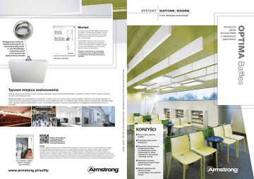 CS 5135 items per baffle 1200 40 300 600 Panele pionowe OPTIMA Baffle dostarczane są na miejsce montażu jako kompletny i gotowy produkt, który przed montażem nie wymaga dodatkowego przygotowania bądź łączenia jego komponentów. 2x 300 max. 2000 400 L = 2000 DETAIL A 2x 1200 ca. 20 1800 300 300 DETAIL A 2x Panele Baffle mogą być montowane przy wykorzystaniu standardowych systemów nośnych lub podwieszane niezależnie wprost do sufitu strukturalnego przy wykorzystaniu systemu linek do podwieszania. PEFC/10-31-1427 PAS1306 Armstrong Building Products R.C.S. Besançon B 784 131 575 400 Zintegrowane kotwy do podwieszania paneli są montowane fabrycznie w celu łatwiejszego ustawienia paneli w linii prostej oraz uproszczenia montażu. Printed in E.C. on chlorine free paper from sustainable resources. MODULE 1800 x 400 mm 40 Instrukcja montażowa Prosimy o zapoznanie się z instrukcją montażową w celu uzyskania bardziej szczegółowych informacji dotyczących montażu. Typowe miejsca zastosowania Produkt zazwyczaj stosowany w celu uzyskania wysokiego poziomu pochłaniania dźwięku w szkołach, biurach, centrach sportu i rekreacji, centrach komunikacyjnych itp. Nadaje się idealnie do wykorzystania w budynkach o niskim poziomie zużycia energii, wykorzystujących techniki konstrukcyjne bazujące na masie termicznej, oświetlonych światłem dziennym przez świetliki dachowe, w miejscach gdzie nie jest możliwe zamontowanie standardowego rusztu nośnego sufitów podwieszanych, oraz w mniej eksponowanych miejscach zastosowania, wymagających bardziej ekonomicznych rozwiązań. Pobierz i otwórz aplikację do skanowania kodów kreskowych. Skieruj kamerę twojego telefonu na ten kod i zeskanuj go. Uwagi Wszystkie zdjęcia zamieszczone w tym katalogu podane są wyłącznie w celach informacyjnych i nie stanowią zalecenia ani sugestii ze strony jakiejkolwiek z wymienionych w nim firm, co do prawidłowego zastosowania i sposobu montażu sufitów podwieszanych. Ze względów technicznych mogą występować różnice kolorystyczne w barwach wydrukowanych i rzeczywistych. Zalecamy dokonanie wyboru na podstawie wzorów danego produktu. Wszelkie zestawienia i informacje techniczne dotyczące sufitów firmy Armstrong zawarte w niniejszym katalogu i innych broszurach tej firmy oparte są na wynikach badań przeprowadzonych w warunkach laboratoryjnych. Do użytkownika należy uzyskanie od firmy Armstrong lub firmy sprzedającej pisemnego zapewnienia, że dane te można odnieść do konkretnych warunków. sprzedaż naszych produktów oraz odpowiedzialność firm, które je sprzedają, regulowana jest przez „Ogólne warunki sprzedaży“ każdej z firm. Wszystkie dane dotyczące produktów mogą ulec zmianie bez wcześniejszego uprzedzenia. Inne produkty z rodziny sufitów nieciągłych firmy Armstrong www.armstong.pl/sufity - 09/2015 - PAS 1506 - Armstrong Building Products - RCS Besançon B 784 131 575 Printed on free chlorine paper. www.armstrong.eu KORZYŚCI owoczesny linearny N wygląd oskonałe właściwości D akustyczne abrycznie zamontowane F zintegrowane kotwy do powieszania paneli umożliwiają ich łatwe ustawienie w linii prostej i ułatwiają montaż ożliwość montażu M pojedynczych paneli bądź całych ich grup ysoki współczynnik W odbicia światła umożliwiający oszczędność energii OPTIMA Baffles DETAIL A MODULE 1200 x 400 mm Akustyczne panele pionowe Baffle o najwyższych parametrach Montaż OPTIMA BAFFLES OPTIMA Baffles Dane techniczne Dane logistyczne Wymiary Nr ref. produktu Wymiary (mm) Sztuk / karton Ciężar (kg/szt.) CS 5133 WH 400 x 1200 x 40 2 2,3 CS 5134 WH 400 x 1800 x 40 2 3,5 Moduł 400 x 1200 x 40 mm 20 300 600 300 400 Inne wymiary i kształty dostępne na życzenie. Kolor* Biały (WH) Krawędź Malowane krawędzie paneli 1200 40 Zestaw 1 zestaw do podwieszania dla 2 paneli akcesoriów OPTIMA Baffle: do Nr ref. CS 5135 - 4x linka do podwieszania podwieszania - 4x regulator linki - 4x haczyk do zamocowania na końcu linki Moduł 400 x 1800 x 40 mm 20 300 1200 300 400 Zestaw do podwieszania paneli należy zamówić oddzielnie. *Inne kolory z palety RAL dostępne na specjalne zamówienie. 1800 40 Właściwości Pochłanianie dźwięku EN ISO 354 & EN ISO 11654 Panele pionowe OPTIMA Baffle mogą w znaczący sposób zmniejszyć poziom hałasu otoczenia oraz czas pogłosu danego wnętrza, a także podnieść w nich poziom rozumienia mowy. Panele Baffle zapewniają pochłanianie dźwięku na wszystkich powierzchniach produktu: albo jako materiał pochłaniający „płaszczyznowo” ( w) - w przypadku montażu w układzie liniowym, bądź też jako „dyskretny” materiał pochłaniający (EAA) - w przypadku montażu paneli jako niezależnych elementów dekoracyjnych. Panele pionowe OPTIMA Baffle firmy Armstrong to wysokiej klasy produkty akustyczne, których wszystkie powierzchnie pokryte są warstwą włókna szklanego i wykończone nowoczesną, nakładaną fabrycznie farbą o wysokim współczynniku bieli, co pozwala uzyskać wyjątkowy poziom właściwości akustycznych i wysoki poziom współczynnika odbicia światła. Panele pionowe OPTIMA Baffle nadają się idealnie do wnętrz o dużym poziomie hałasu, wszędzie tam, gdzie tradycyjne sufity akustyczne albo nie mogą być zastosowane, albo nie są w stanie zapewnić wystarczająco wysokiego poziomu wymaganych właściwości i stanowią ekonomiczne rozwiązanie, cechując się jednocześnie atrakcyjnym linearnym wzornictwem, podkreślającym nowoczesność wystroju wnętrz budynków. Panele pionowe OPTIMA Baffle 1.00 Panele pionowe OPTIMA Baffle 1.45 * Średnia w zakresie 500-4000Hz, badanie laboratoryjne przeprowadzone przy panelach podwieszonych o 1000 mm, zgodnie z normą EN ISO 354:2003. Prosimy o kontakt z biurem w Warszawie w celu uzyskania bardziej szczegółowych informacji na temat właściwości akustycznych oraz innych właściwości paneli. 1,8 1,8 1,6 1,6 1,4 1,4 1,2 1,2 1,0 1,0 0,8 0,8 0,