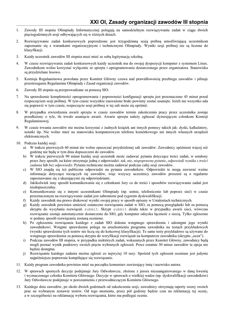 XXI OI, Zasady organizacji zawodów III stopnia 1. Zawody III stopnia Olimpiady Informatycznej polegają na samodzielnym rozwiązywaniu zadań w ciągu dwóch pięciogodzinnych sesji odbywających się w różnych dniach. 2. Rozwiązywanie zadań konkursowych poprzedzone jest trzygodzinną sesją próbną umożliwiającą uczestnikom zapoznanie się z warunkami organizacyjnymi i technicznymi Olimpiady. Wyniki sesji próbnej nie są liczone do klasyfikacji. 3. Każdy uczestnik zawodów III stopnia musi mieć ze sobą legitymację szkolną. 4. W czasie rozwiązywania zadań konkursowych każdy uczestnik ma do swojej dyspozycji komputer z systemem Linux. Zawodnikom wolno korzystać wyłącznie ze sprzętu i oprogramowania dostarczonego przez organizatora. Stanowiska są przydzielane losowo. 5. Komisja Regulaminowa powołana przez Komitet Główny czuwa nad prawidłowością przebiegu zawodów i pilnuje przestrzegania Regulaminu Olimpiady i Zasad organizacji zawodów. 6. Zawody III stopnia są przeprowadzane za pomocą SIO. 7. Na sprawdzenie kompletności oprogramowania i poprawności konfiguracji sprzętu jest przeznaczone 45 minut przed rozpoczęciem sesji próbnej. W tym czasie wszystkie zauważone braki powinny zostać usunięte. Jeżeli nie wszystko uda się poprawić w tym czasie, rozpoczęcie sesji próbnej w tej sali może się opóźnić. 8. W przypadku stwierdzenia awarii sprzętu w czasie zawodów termin zakończenia pracy przez uczestnika zostaje przedłużony o tyle, ile trwało usunięcie awarii. Awarie sprzętu należy zgłaszać dyżurującym członkom Komisji Regulaminowej. 9. W czasie trwania zawodów nie można korzystać z żadnych książek ani innych pomocy takich jak: dyski, kalkulatory, notatki itp. Nie wolno mieć na stanowisku komputerowym telefonu komórkowego ani innych własnych urządzeń elektronicznych. 10. Podczas każdej sesji: a) W trakcie pierwszych 60 minut nie wolno opuszczać przydzielonej sali zawodów. Zawodnicy spóźnieni więcej niż godzinę nie będą w tym dniu dopuszczeni do zawodów. b) W trakcie pierwszych 90 minut każdej sesji uczestnik może zadawać pytania dotyczące treści zadań, w ustalony przez Jury sposób, na które otrzymuje jedną z odpowiedzi: tak, nie, niepoprawne pytanie, odpowiedź wynika z treści zadania lub bez odpowiedzi. Pytania techniczne można zadawać podczas całej sesji zawodów. c) W SIO znajdą się też publiczne odpowiedzi na pytania zawodników. Odpowiedzi te mogą zawierać ważne informacje dotyczące toczących się zawodów, więc wszyscy uczestnicy zawodów proszeni są o regularne zapoznawanie się z ukazującymi się odpowiedziami. d) Jakikolwiek inny sposób komunikowania się z członkami Jury co do treści i sposobów rozwiązywania zadań jest niedopuszczalny. e) Komunikowanie się z innymi uczestnikami Olimpiady (np. ustnie, telefonicznie lub poprzez sieć) w czasie przeznaczonym na rozwiązywanie zadań jest zabronione pod rygorem dyskwalifikacji. f) Każdy zawodnik ma prawo drukować wyniki swojej pracy w sposób opisany w Ustaleniach technicznych. g) Każdy zawodnik powinien umieścić ostateczne rozwiązania zadań w SIO, za pomocą przeglądarki lub za pomocą skryptu do wysyłania rozwiązań submit. Skrypt submit działa także w przypadku awarii sieci, wówczas rozwiązanie zostaje automatycznie dostarczone do SIO, gdy komputer odzyska łączność z siecią. Tylko zgłoszone w podany sposób rozwiązania zostaną ocenione. h) Po zgłoszeniu rozwiązania każdego z zadań SIO dokona wstępnego sprawdzenia i udostępni jego wyniki zawodnikowi. Wstępne sprawdzenie polega na uruchomieniu programu zawodnika na testach przykładowych (wyniki sprawdzenia tych testów nie liczą się do końcowej klasyfikacji). Te same testy przykładowe są używane do wstępnego sprawdzenia za pomocą skryptu do weryfikacji rozwiązań na komputerze zawodnika (skryptu „ocen”). i) Podczas zawodów III stopnia, w przypadku niektórych zadań, wskazanych przez Komitet Główny, zawodnicy będą mogli poznać wynik punktowy swoich pięciu wybranych zgłoszeń. Przez ostatnie 30 minut zawodów ta opcja nie będzie dostępna. j) Rozwiązanie każdego zadania można zgłosić co najwyżej 10 razy. Spośród tych zgłoszeń oceniane jest jedynie najpóźniejsze poprawnie kompilujące się rozwiązanie. 11. Każdy program zawodnika powinien mieć na początku komentarz zawierający imię i nazwisko autora. 12. W sprawach spornych decyzje podejmuje Jury Odwoławcze, złożone z jurora niezaangażowanego w daną kwestię i wyznaczonego członka Komitetu Głównego. Decyzje w sprawach o wielkiej wadze (np. dyskwalifikacji zawodników) Jury Odwoławcze podejmuje w porozumieniu z przewodniczącym Komitetu Głównego. 13. Każdego dnia zawodów, po około dwóch godzinach od zakończenia sesji, zawodnicy otrzymają raporty oceny swoich prac na wybranym zestawie testów. Od tego momentu, przez pół godziny będzie czas na reklamację tej oceny, a w szczególności na reklamację wyboru rozwiązania, które ma podlegać ocenie.
