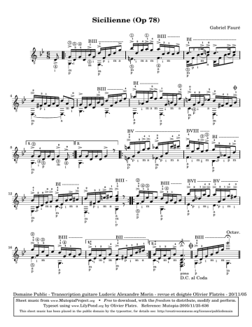 Sicilienne (Op 78) Gabriel Fauré BIII -------BI ---------------------------Q Q Q Q BIII ---------------Q 3 5 4 Q Q Q Q Q QQ Q Q Q 86 m i m a m i m p i m a Q i 3 i a m 4 4 5 p i 1 1 1 1 3 1 4 4 4 3 1 3 4 1 4 1 2 0 3 8 m p i a p m p m p 5 m p 2 h QQ Q Q BIII ---------- Q Q Q Q Q Q Q Q Q Q Q 4 p m ma m 4 i a i i m a i p i m p BI ------------ 2 3 1 0 1 4 1 0 1 3 4 4 3 2 4 2 4 1 1 8 m p a p a m p a p Q Q Q 3Q 3Q QQ Q Q 1. 3 2. Q Q Q Q 8 Q p i m a i m m p i ma 4 3 i BVIII ------ BV ----------------------------4 2 4 3 2 1 3 0 m p 5 i p 12 m Q QQ ma p i 4 1 0 2 0 8 m p 2 4 i Q Q Q Q p i m a p i m p BI ----------4 3 2 2 3 1 Q Q 0 1 m a a p m p m p BIII - 2 Q Q i m 5 4 2 1 3 4 3 1 3 a p a m i p m p 2 QQ Q Q p i m i a BIII ------1 3 4 1 3 1 3 4 1 4 1 2 1 4 3 1 2 1 p 2 4 3 4 1 2 8 p a p p 1 1 BII -------------- 4 3 4 1 2 a p Q Q p p m i BI ------------4 4 3 3 a p Q Q Q p i m i BVI --------- BV ----------- 4 Q4 3 1. 4 HQ 2. Q Q Q Q Q Q 16 m m p i m a m m i m i i i i 5 m m m a p BIII --------- 4 2 3 3 0 4 8 4 4 4 p pima 3 4 1 2 3 1 a p H Í Octav. BIII ------------- hQ 4 2 p i m i m 3 i p ia p D.C. al Coda Domaine Public - Transcription guitare Ludovic Alexandre Morin - revue et doigtée Olivier Flatrès - 20/11/05 Sheet music from www.MutopiaProject .org • Free to download, with the freedom to distribute, modify and perform. Typeset using www.LilyPond .org by Olivier Flatrs. Reference: Mutopia-2005/11/25-636 This sheet music has been placed in the public domain by the typesetter, for details see: http://creativecommons.org/licenses/publicdomain