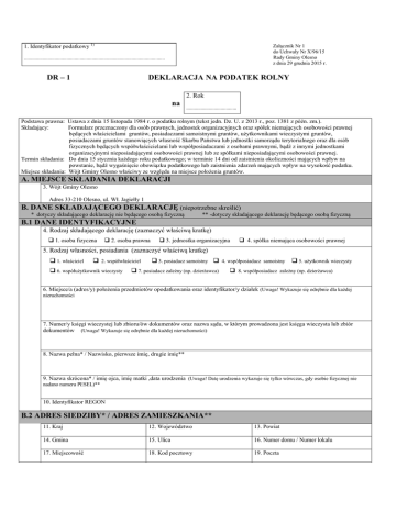 Załącznik Nr 1 do Uchwały Nr X/96/15 Rady Gminy Olesno z dnia 29 grudnia 2015 r. 1. Identyfikator podatkowy 1) .......................................................................................................... DR – 1 DEKLARACJA NA PODATEK ROLNY 2. Rok na ...................................... Podstawa prawna: Ustawa z dnia 15 listopada 1984 r. o podatku rolnym (tekst jedn. Dz. U. z 2013 r., poz. 1381 z późn. zm.). Składający: Formularz przeznaczony dla osób prawnych, jednostek organizacyjnych oraz spółek niemających osobowości prawnej będących właścicielami gruntów, posiadaczami samoistnymi gruntów, użytkownikami wieczystymi gruntów, posiadaczami gruntów stanowiących własność Skarbu Państwa lub jednostki samorządu terytorialnego oraz dla osób fizycznych będących współwłaścicielami lub współposiadaczami z osobami prawnymi, bądź z innymi jednostkami organizacyjnymi nieposiadającymi osobowości prawnej lub ze spółkami nieposiadającymi osobowości prawnej. Termin składania: Do dnia 15 stycznia każdego roku podatkowego; w terminie 14 dni od zaistnienia okoliczności mających wpływ na powstanie, bądź wygaśnięcie obowiązku podatkowego lub zaistnienia zdarzeń mających wpływ na wysokość podatku. Miejsce składania: Wójt Gminy Olesno właściwy ze względu na miejsce położenia gruntów. A. MIEJSCE SKŁADANIA DEKLARACJI 3. Wójt Gminy Olesno Adres 33-210 Olesno, ul. Wł. Jagiełły 1 B. DANE SKŁADAJĄCEGO DEKLARACJĘ (niepotrzebne skreślić) * dotyczy składającego deklarację nie będącego osobą fizyczną ** -dotyczy składającego deklarację będącego osobą fizyczną B.1 DANE IDENTYFIKACYJNE 4. Rodzaj składającego deklarację (zaznaczyć właściwą kratkę) 1. osoba fizyczna 2. osoba prawna 3. jednostka organizacyjna 4. spółka niemająca osobowości prawnej 5. Rodzaj własności, posiadania (zaznaczyć właściwą kratkę) 1. właściciel 2. współwłaściciel 6. współużytkownik wieczysty 3. posiadacz samoistny 4. współposiadacz samoistny 7. posiadacz zależny (np. dzierżawca) 5. użytkownik wieczysty 8. współposiadacz zależny (np. dzierżawca) 6. Miejsce/a (adres/y) położenia przedmiotów opodatkowania oraz identyfikator/y działek (Uwaga! Wykazuje się odrębnie dla każdej nieruchomości 7. Numer/y księgi wieczystej lub zbioru/ów dokumentów oraz nazwa sądu, w którym prowadzona jest księga wieczysta lub zbiór dokumentów (Uwaga! Wykazuje się odrębnie dla każdej nieruchomości) 8. Nazwa pełna* / Nazwisko, pierwsze imię, drugie imię** 9. Nazwa skrócona* / imię ojca, imię matki ,data urodzenia (Uwaga! Datę urodzenia wykazuje się tylko wówczas, gdy osobie fizycznej nie nadano numeru PESEL)** 10. Identyfikator REGON B.2 ADRES SIEDZIBY* / ADRES ZAMIESZKANIA** 11. Kraj 12. Województwo 13. Powiat 14. Gmina 15. Ulica 16. Numer domu / Numer lokalu 17. Miejscowość 18. Kod pocztowy 19. Poczta C. OKOLICZNOŚCI POWODUJĄCE KONIECZNOŚĆ ZŁOŻENIA DEKLARACJI 20. Okoliczności (zaznaczyć właściwą kratkę) 1. deklaracja roczna 2. korekta deklaracji rocznej (miesiąc – rok ) D. DANE DOTYCZĄCE PRZEDMIOTÓW OPODATKOWANIA (włącznie ze zwolnionymi) Powierzchnia gruntu w hektarach fizycznych Uwaga! Wykazujemy z dokładnością do 1 m2 Klasy użytków wynikające z ewidencji gruntów i budynków Grunty orne I II IIIa IIIb IVa IVb V VI VIz Sady I II III, IIIa IIIb IV, IVa IVb V VI VIz Łąki i pastwiska trwałe I II III IV V VI VIz Grunty rolne zabudowane I II III IIIa IIIb IV IVa IVb V VI VIz Ogółem Nie podlegające przeliczeniu na ha przeliczeniowe Podlegające przeliczeniu na hektary przeliczeniowe Liczba hektarów przeliczeniowych 2) Wymiar podatku Stawka rolnego w zł, gr. z 1 ha (przeliczenio -wego lub fizycznego) w zł, gr. Grunty pod stawami a) zarybione łososiem, trocią, głowacicą, palią i pstrągiem b) zarybione innymi gatunkami ryb niż w poz. a) oraz grunty pod stawami niezarybionymi Grunty pod rowami I II III IIIa IIIb IV IVa IVb V VI VIz Rowy bez oznaczenia klasy gleboznawczej Grunty zadrzewione i zakrzewione na użytkach rolnych I II III IIIa IIIb IV IVa IVb V VI VIz Grunty rolne dla których nie można ustalić przelicznika Razem ( bez zwolnień) E. INFORMACJA O PRZEDMIOTACH ZWOLNIONYCH (podać rodzaj, klasę i powierzchnię gruntów zwolnionych oraz przepis prawa - z jakiego tytułu występuje zwolnienie) F. ULGI W PODATKU ROLNYM OD GRUNTÓW 1. z tytułu nabycia lub objęcia w zagospodarowanie gruntów 2. inwestycyjne 3. górskie 4. inne Razem G. ŁĄCZNA KWOTA PODATKU Kwota podatku Różnica kwot z D–F (w pełnych złotych ) ***) H. OŚWIADCZENIE I PODPIS SKŁADAJĄCEGO / OSOBY REPREZENTUJĄCEJ SKŁADAJĄCEGO Oświadczam, że podane przeze mnie dane są zgodne z prawdą. 21. Imię 22. Nazwisko 23. Data wypełnienia (dzień - miesiąc - rok) 24. Podpis (pieczęć) składającego / osoby reprezentującej składającego 3) I. ADNOTACJE ORGANU PODATKOWEGO 25. Uwagi organu podatkowego 26. Identyfikator przyjmującego formularz 27.Data i podpis przyjmującego formularz ***) Pouczenie Niniejsza deklaracja stanowi podstawę do wystawienia tytułu wykonawczego, zgodnie z przepisami ustawy z dnia 17 czerwca 1966 r. o postępowaniu egzekucyjnym w administracji (t.j. Dz. U. z 2014 r., poz. 1619 z późn. zm.) 1) Identyfikator podatkowy – w pozycji tej należy wpisać: - numer PESEL – w przypadku podatników będących osobami fizycznymi objętymi rejestrem PESEL, nieprowadzących działalności gospodarczej lub niebędących zarejestrowanymi podatnikami podatku od towarów i usług, - numer NIP – w przypadku pozostałych podmiotów podlegających obowiązkowi ewidencyjnemu. 2) Należy podać z dokładnością do czterech miejsc po przecinku. 3) Niepotrzebne skreślić.