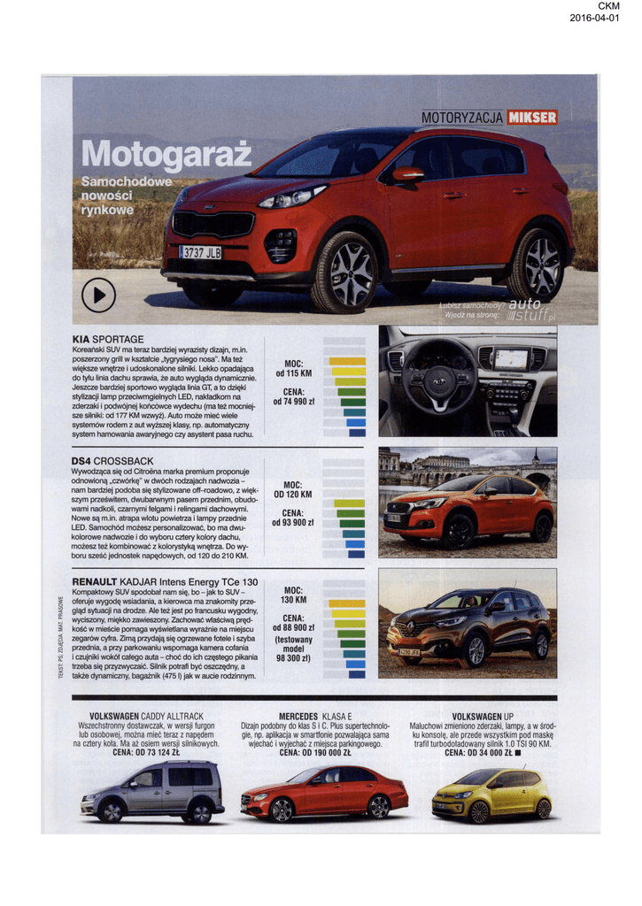 CKM 2016-04-01 KIA SPORTAGE Koreański SUV ma teraz bardziej wyrazisty dizajn, m.in. poszerzony grill w kształcie „tygrysiego nosa". Ma też większe wnętrze i udoskonalone silniki. Lekko opadająca do tyłu linia dachu sprawia, że auto wygląda dynamicznie. Jeszcze bardziej sportowo wygląda linia GT, a to dzięki stylizacji lamp przeciwmgielnych LED, nakładkom na zderzaki i podwójnej końcówce wydechu (ma też mocniej sze silniki: od 177KM wzwyż). Auto może mieć wiele systemów rodem z aut wyższej klasy, np. automatyczny system hamowania awaryjnego czy asystent pasa ruchu. MOC: od 115 KM CENA: Od 74 990 zl DS4 CROSSBACK Wywodząca się od Citroena marka premium proponuje odnowioną „czwórkę" w dwóch rodzajach nadwozia nam bardziej podoba się stylizowane off-roadowo, z więk szym prześwitem, dwubarwnym pasem przednim, obudo wami nadkoli, czarnymi felgami i relingami dachowymi. Nowe są m.in. atrapa wlotu powietrza i lampy przednie LED. Samochód możesz personalizować, bo ma dwukolorowe nadwozie i do wyboru cztery kolory dachu, możesz też kombinować z kolorystyką wnętrza. Do wy boru sześć jednostek napędowych, od 120 do 210 KM. RENAULT KADJAR Intens Energy TCe 130 Kompaktowy SUV spodobał nam się, bo - jak to SUV oferuje wygodę wsiadania, a kierowca ma znakomity prze gląd sytuacji na drodze. Ale też jest po francusku wygodny, wyciszony, miękko zawieszony. Zachować właściwą pręd kość w mieście pomaga wyświetlana wyraźnie na miejscu zegarów cyfra. Zimą przydają się ogrzewane fotele i szyba przednia, a przy parkowaniu wspomaga kamera cofania i czujniki wokół całego auta - choć do ich częstego pikania trzeba się przyzwyczaić. Silnik potrafi być oszczędny, a także dynamiczny, bagażnik (4751) jak w aucie rodzinnym. VOLKSWAGEN CADDY ALLTRACK Wszechstronny dostawczak, w wersji furgon lub osobowej, można mieć teraz z napędem na cztery kola. Ma aż osiem wersji silnikowych. CENA: OD 73 124 ZŁ MOC: OD 120 KM CENA: od 93 900 zł MOC: 130 KM CENA: od 88 900 zl (testowany model 98 300 zl) MERCEDES KLASA E Dizajn podobny do klas S i C. Plus supertechnologie, np. aplikacja w smartfonie pozwalająca sama wjechać i wyjechać z miejsca parkingowego. CENA: OD 190 000 ZŁ VOLKSWAGEN UP Maluchowi zmieniono zderzaki, lampy, a w środ ku konsolę, ale przede wszystkim pod maskę trafił turbodoładowany silnik 1.0 TSI90 KM. CENA: OD 34 000 ZŁ •
