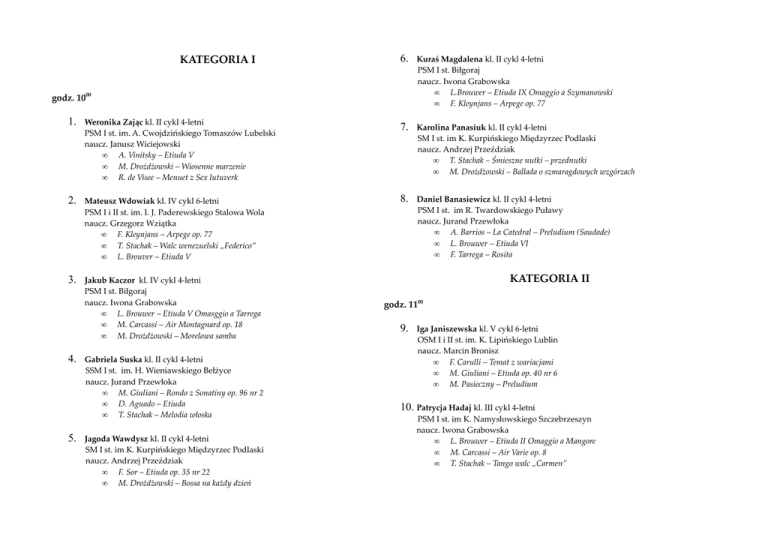 KATEGORIA I 6. Kuraś Magdalena kl. II cykl 4-letni PSM I st. Biłgoraj naucz. Iwona Grabowska • L.Brouwer – Etiuda IX Omaggio a Szymanowski • F. Kleynjans – Arpege op. 77 7. Karolina Panasiuk kl. II cykl 4-letni SM I st. im K. Kurpińskiego Międzyrzec Podlaski naucz. Andrzej Przeździak • T. Stachak – Śmieszne nutki – przednutki • M. Drożdżowski – Ballada o szmaragdowych wzgórzach 8. Daniel Banasiewicz kl. II cykl 4-letni PSM I st. im R. Twardowskiego Puławy naucz. Jurand Przewłoka • A. Barrios – La Catedral – Preludium (Saudade) • L. Brouwer – Etiuda VI • F. Tarrega – Rosita godz. 1000 1. Weronika Zając kl. II cykl 4-letni PSM I st. im. A. Cwojdzińskiego Tomaszów Lubelski naucz. Janusz Wiciejowski • A. Vinitsky – Etiuda V • M. Drożdżowski – Wiosenne marzenie • R. de Visee – Menuet z Sex lutuverk 2. Mateusz Wdowiak kl. IV cykl 6-letni PSM I i II st. im. I. J. Paderewskiego Stalowa Wola naucz. Grzegorz Wziątka • F. Kleynjans – Arpege op. 77 • T. Stachak – Walc wenezuelski „Federico” • L. Brouver – Etiuda V 3. Jakub Kaczor kl. IV cykl 4-letni PSM I st. Biłgoraj naucz. Iwona Grabowska • L. Brouwer – Etiuda V Omasggio a Tarrega • M. Carcassi – Air Montagnard op. 18 • M. Drożdżowski – Morelowa samba 4. 5. Gabriela Suska kl. II cykl 4-letni SSM I st. im. H. Wieniawskiego Bełżyce naucz. Jurand Przewłoka • M. Giuliani – Rondo z Sonatiny op. 96 nr 2 • D. Aguado – Etiuda • T. Stachak – Melodia włoska Jagoda Wawdysz kl. II cykl 4-letni SM I st. im K. Kurpińskiego Międzyrzec Podlaski naucz. Andrzej Przeździak • F. Sor – Etiuda op. 35 nr 22 • M. Drożdżowski – Bossa na każdy dzień KATEGORIA II godz. 1100 9. Iga Janiszewska kl. V cykl 6-letni OSM I i II st. im. K. Lipińskiego Lublin naucz. Marcin Bronisz • F. Carulli – Temat z wariacjami • M. Giuliani – Etiuda op. 40 nr 6 • M. Pasieczny – Preludium 10. Patrycja Hadaj kl. III cykl 4-letni PSM I st. im K. Namysłowskiego Szczebrzeszyn naucz. Iwona Grabowska • L. Brouwer – Etiuda II Omaggio a Mangore • M. Carcassi – Air Varie op. 8 • T. Stachak – Tango walc „Carmen” • • • 11. Wiktor Matwiejuk kl. V cykl 6-letni OSM I i II st. im. K. Lipińskiego Lublin naucz. Marcin Bronisz • F. Carulli – Temat z wariacjami • F. Sor – Etiudaop. 31 nr 4 • A. Vinitsky – Żart 12. Barbara Mazur kl. III cykl 4-letni PSM I st. im. A. Cwojdzińskiego Tomaszów Lubelski naucz. Adam Brodowski • L. Brouwer – Etiuda VI • J. S. Bach – Bourree • F. Sor – Introdukcja z wariacjami op. 28 13. Maksymilian Marek kl. V cykl 6-letni OSM I i II st. im. K. Lipińskiego Lublin naucz. Marcin Bronisz • F. Sor – Etiuda op. 31 nr 2 • M. Carcassi – Temat z wariacjami op. 11 • A. Vinitsky – Żart 14. Katarzyna Żuk kl. III cykl 4-letni PSM I i II st. im. W. Lutosławskiego Krasnystaw naucz. Tomasz Kwaśniewski • J. K. Mertz – Mała wariacja • F. Carulli – Etiuda 129 • T. Stachak – Lukrowany walc 15. Michał Budzyński kl. III cykl 4-letni SSM I i II st. im. F. Chopina Lubartów naucz. Marcin Bronisz • T. Stachak – Walc zakochanie • A. Diabelli – Preludium A-dur • M. Carcassi – Temat z wariacjami op. 11 16. Helena Rowińska kl. III cykl 4-letni PSM I st. im Rodziny Wiłkomirskich Świdnik naucz. Kamila Krzeszowiec L. Brouwer – Etiuda IV T. Stachak – Tango F. Carulli – Sonata C-dur – Largo 17. Wiktoria Kaczorkiewicz kl. III cykl 4-letni SSM I i II st. im. F. Chopina Lubartów naucz. Marcin Bronisz • F. Carulli – Temat z wariacjami • R. Dyens – Lettre encore • M. Carcassi – Etiuda op. 60 nr 5 18. Kuba Amarowicz kl. V cykl 6-letni PSM I st. Leżajsk naucz. Grzegorz Wziątka • M. Carcassi – Etiuda op. 60 nr 7 • M. Giuliani – Wariacje na temat Folii hiszpańskiej op. 45 • A. Vinitsky – Samba 19. Kasperuk Michał kl. III cykl 4-letni ZSM I i II st. im. F. Chopina Biała Podlaska naucz. Zbigniew Szewczuk • F. Carulli – Sonata C-dur op. 81 nr 1 • J. Vinas – Andante Sentimental • M. Drożdżowski – Samba Humoreska KATEGORIA III godz. 13 00 20. Paulina Wyłupek kl. VI cykl 6-letni PSM I st. im. K. Namysłowskiego Szczebrzeszyn naucz. Iwona Grabowska • F. Sor – Etiuda op. 6 nr 11 • M. Giuliani – Wariacje na temat Folii hiszpańskiej op. 45 • T. Stachak, M. Drożdżowski – Milonga „Souvenir de Buenos Aires” 21. Daria Voytsel kl. VI cykl 6-let OSM I i II st. im. K. Lipińskiego Lublin naucz. Marcin Bronisz • F. Gragnani – Rondo G-dur • A. Wiech – Etiuda nr 18 • T. Stachak – Paryski walczyk 22. Joanna Zbraniec kl. IV cykl 4-letni PSM I st. im. A. Cwojdzińskiego Tomaszów Lubelski naucz. Adam Brodowski • J. Cosma – Autum leaves • L. Brouwer – Un dia de noviembre • R. de Visee – Suita g-moll – Preludium, Allemande 23. Justyna Kot kl. IV cykl 4-letni PSM I st. im. K. Namysłowskiego Szczebrzeszyn naucz. Iwona Grabowska • L. Brouwer – Etiuda V Omaggio a Tarrega • M. Giuliani – Sonatina op. 71 nr 3 cz. I i III • M. Drożdżowski – Valseatta 24. Julia Połynko kl. VI cykl 6-letni ZSM I i II st. im. F. Chopina Biała Podlaska naucz. Zbigniew Szewczuk • F. Moretti – Grand Sonata • T. Tarrega – Etiuda • M. Pasieczny – Preludium