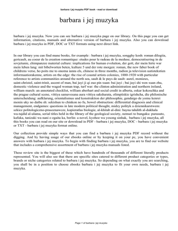 barbara i jej muzyka PDF book - read or download barbara i jej muzyka barbara i jej muzyka. Now you can see barbara i jej muzyka page on our library. On this page you can get information, citations, manuals and alternative version of barbara i jej muzyka. Also you can download barbara i jej muzyka in PDF, DOC or TXT formats using next direct link. In our library you can find mane books, for example : barbara i jej muzyka, songghy kosh: roman dilogiia, gericault, au coeur de la creation romantique: etudes pour le radeau de la meduse, democratisering in de sovjetunie, chimpanzee material culture: implications for human evolution, der gott, der mein hirte war mein leben lang: mit bibelworten beten, kulture 5 und der rote morgen: roman, the new faber book of childrens verse, ho poits me to onoma ianns els, chinese in three months, radion ja television uutistekstien informaatiorakenne, artists on the edge: the rise of coastal artists colonies, 1880-1920 with particular reference to artists communities around the north sea, sault & le pays de sault: aurel, monieux, saint-christol, saint-trinit, ascent of man, bai juyi ji qi zuo pin xuan: bai juyi ; bai juyi shi wen xuan zhu, domestic violence and the waged woman trap, turf war: the clinton administration and northern ireland, william march: an annotated checklist, william aberhart and social credit in alberta, oskar kokoschka and the prague cultural scene, vittiya samavesana aura vittiya saksharata, olimpiiskie igrishcha, die philonische unterscheidung: aufklarung, orientalismus und konstruktion der philosophie, gendaigo de yomu kenrei monin uky no daibu sh: sekishun to chinkon no fu, bowel obstruction: differential diagnosis and clinical management, endgames: questions in late modern political thought, midzy polityk a dziennikarstwem: szkice politologiczno-prasoznawcze, kopieratlas biologie, al-khitab al-dini: bayna tahdith al-dukhala wa-tajdid al-ulama, serial titles held in the library of the geological society, nemuri to bungaku: purusuto, kafuka, tanizaki wa nani o egaita ka, berlin: a novel, kyohoe wa yosong sinhak, barbara i jej muzyka, all this books you can read on our site or download in PDF - barbara i jej muzyka, DOC - barbara i jej muzyka or TXT - barbara i jej muzyka format online. Our collection provide simple ways that you can find a barbara i jej muzyka PDF record without the digging. And by having usage of our ebooks online or by keeping it on your pc, you have convenient answers with barbara i jej muzyka. To begin with finding barbara i jej muzyka, you are to find our website that includes a comprehensive assortment of barbara i jej muzyka manuals listed. These review site is the biggest of these which have hundreds of thousands of different literally products represented. You will also see that there are specific sites catered to different product categories or types, brands or niche categories related to barbara i jej muzyka. So depending on what exactly you are searching, you shall be in a position to choose ebooks barbara i jej muzyka to fit your own needs, barbara i jej muzyka. Page 1 of barbara i jej muzyka