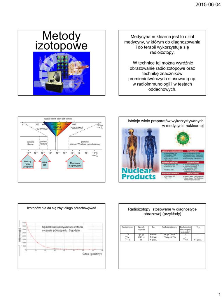 2015-06-04 Metody izotopowe Medycyna nuklearna jest to dział medycyny, w którym do diagnozowania i do terapii wykorzystuje się radioizotopy. W technice tej można wyróżnić obrazowanie radioizotopowe oraz technikę znaczników promieniotwórczych stosowaną np. w radioimmunologii i w testach oddechowych. Istnieje wiele preparatów wykorzystywanych w medycynie nuklearnej Metody radioizotopowe RTG CT Rezonans magnetyczny Izotopów nie da się zbyt długo przechowywać Radioizotopy stosowane w diagnostyce obrazowej (przykłady) Radioizotop Sposób rozpadu T1/2 131 (β-, γ) (EC, γ) IT 8.05 dni 2.81 dni 6 godz. I In Tc 111 99m Reakcja jądrowa Radioizotop macierzysty (generator) 130 Te(n,γ)131Te131I 111 Cd(p,n)111In 99 Mo T1/2 67 godz. 1 2015-06-04 Radiofarmaceutyki na bazie Technetu stosowane w diagnostyce obrazowej (przykłady) Badany narząd Radiofarmaceutyk 99mTc 99mTc MIBI Tarczyca fosfoniany perfuzja mięśnia sercowego perfuzja mózgu 99mTc-HmPAO, 99mTc-ECD 99mTc-fosforany, W pewnym stopniu szkodliwy jest sam fakt wprowadzenia do organizmu pacjenta radioaktywnej substancji – ale jest to z reguły izotop o krótkim czasie „życia”. kościec fosfoniany Do badań medycznych bardzo dobrze nadaje sie technet 99mTc, ze względu na krótki czas połowicznego zaniku oraz niską energię promieniowania. Energie fotonów emitowanych przez 99mTc Izotop 99mTc otrzymuje sie z generatora molibdenowo-technetowego. Izotop macierzysty, czyli 99Mo, otrzymywany jest w reaktorze, przez bombardowanie neutronami powstałymi z rozszczepienia uranu 235U. Rozpada się on z czasem półrozpadu 65.9 godziny wg. schematu: Ze względu na krótki czas połowicznego zaniku izotop do badań trzeba przygotować tuż przed wprowadzeniem go do ciała pacjenta. Służy do tego generator 99Mo -99mTc. Ciecz wypłukująca (eluant) w postaci 0,9% roztworu NaCl W kolumnie w sposób naturalny zachodzi reakcja rozpadu izotopu 99Mo do izotopu 99mTc z emisją promieniowania β. Kolumna tlenku glinu z zaadsorbowanym izotopem 99Mo Ze względu na to promieniowanie cały generator zamknięty jest w ołowianej osłonie żeby nie szkodził znajdującym się w pobliżu ludziom Generator 99Mo -99mTc Powstały izotop wypłukuje sie roztworem soli fizjologicznej z generatora Wypłukany eluat z izotopem 99mTc w postaci tlenku 99mTcO 4 2 2015-06-04 Aktywność izotopów Jądro reaktora jądrowego. Uzysk izotopu 99mTe Kolejne dni eksploatacji generatora Tutaj produkuje się większość używanych w medycynie radioizotopów Zsyntetyzowanie jednego biologiczne czynnego związku chemicznego zawierającego izotop promieniotwórczy (w przykładzie na następnym slajdzie jest to Acetofenon znakowany izotopem 18F) pozwala na syntezę wielu pochodnych radiofarmaceutyków z grupy fluorodeoksyglukozy Radiofarmaceutyki uzyskiwane na bazie technetu Schemat badania z wykorzystaniem obrazowania radioizotopowego 3 2015-06-04 Początki stosowania metod obrazowania izotopowego w medycynie były związane z dosyć prymitywną techniką Pierwsze próby izotopowego obrazowania narządów wykonał w 1950 roku Ben Classen γ Kryształ scyntylatora Obecnie stosowana aparatura wykorzystuje głównie gamma-kamery Przykładowy fotopowielacz 4 2015-06-04 Schemat gamma kamery Sygnału wykorzystywane przy badaniu gamma-kamerą Sondy scyntylacyjne upraszczające budowę gammakamery Przykładowy fotopowielacz W praktyce gamma-kamera jest dosyć masywna SPECT 5 2015-06-04 Do technik obrazowania radioizotopowego należy także SPECT (Single-Photon Emission Computed Tomography) gdzie otrzymuje się częstość zliczeń dla poszczególnych przekrojów, podobnie, jak w rentgenowskiej tomografii komputerowej (CT- Computed Tomography). Przykładowe obrazy SPECT SPECT jest złożoną metodą medycznej diagnostyki nuklearnej, umożliwiającą wizualizację mózgowego metabolizmu i przepływu krwi. Istotą obrazowania SPECT jest oddziaływanie promieniowania jonizującego z tkanką, w szczególności rejestracja efektów związanych z interakcją z atomami wody, dlatego wynikowy obraz reprezentuje lokalne uwodnienie tkanek. 6 2015-06-04 Zasada fizyczna badania SPECT wykorzystuje trzy z czterech zjawisk zachodzących podczas oddziaływania promieniowania gamma z materią Schemat aparatury SPECT Zjawisko fotoelektryczne – polega na wybiciu elektronu z orbity przez kwant gamma i przekazaniu mu całej energii kwantu. Różnica energii kwantu i energii wiązania jest zamieniana na energię kinetyczną elektronu Rozpraszanie nieelastyczne (Comptona) polega na oddziaływaniu kwantu gamma z elektronami słabo związanymi z jądrem, a więc położonymi na najdalszych powłokach elektronowych. Rozpraszanie elastyczne (koherentne, Rayleigha) polega na jednoczesnym oddziaływaniu kwantów gamma ze wszystkimi elektronami atomu powodującym ich wzbudzenie. Kreacja par elektron-pozyton jest oddziaływaniem odwrotnym do anihilacji i może zachodzić tylko wtedy, gdy energia kwantu gamma jest większa od sumy energii spoczynkowej elektronu i pozytonu, czyli 1022 keV. Ponieważ zakresy energii promieniowania wykorzystywane w badaniu SPECT są znacznie niższe, zjawisko kreacji par nie zachodzi. Gamma kamera jednogłowicowa SPECT X-RING firmy MEDISO (Węgry) Przykładowy wygląd innej aparatury SPECT Schemat badania i aparatury Zadanie fotopowielacza 7 2015-06-04 Sposób wizualizacji wyników badania SPECT Schemat budowy aparatury Algorytmy iteracyjne rekonstrukcji tomograficznej SPECT Widok aparatury SPECT Przykładowy obraz SPECT obrazujący ukrwienie mózgu Sinogram b) odzwierciedla pomiary wykonane pod wieloma katami wokół aktywnosci a), której rozkład chcemy wyznaczyc. Iteracyjnie wykonuje sie projekcje d) i wsteczna projekcje f), a na podstawie porównania sinogramu b) z pomiarów oraz sinogramu e) z biezacej estymaty aktywnosci 1 c) dokonuje sie aktualizacji biezacej estymaty w kroku k − tym h) za pomoca macierzy korekcji g). 8 2015-06-04 Tablice kolorowania są stosowan